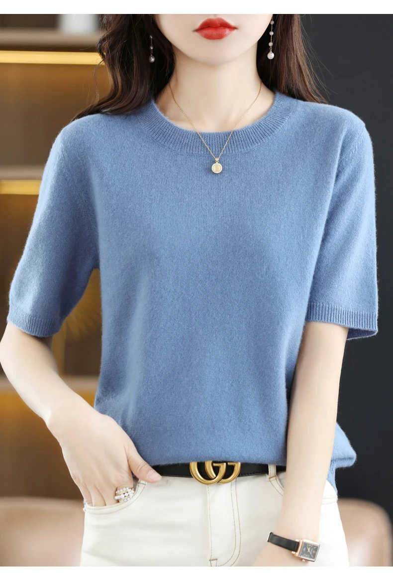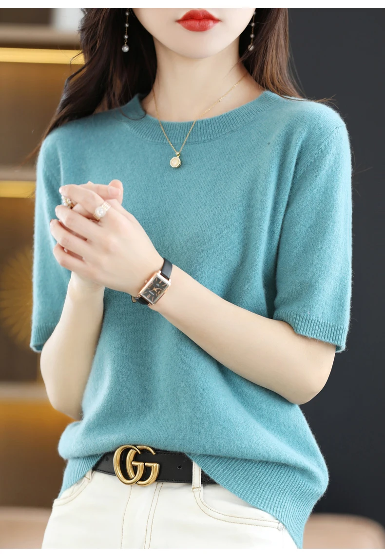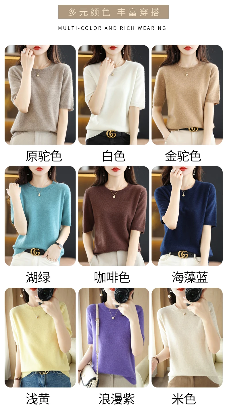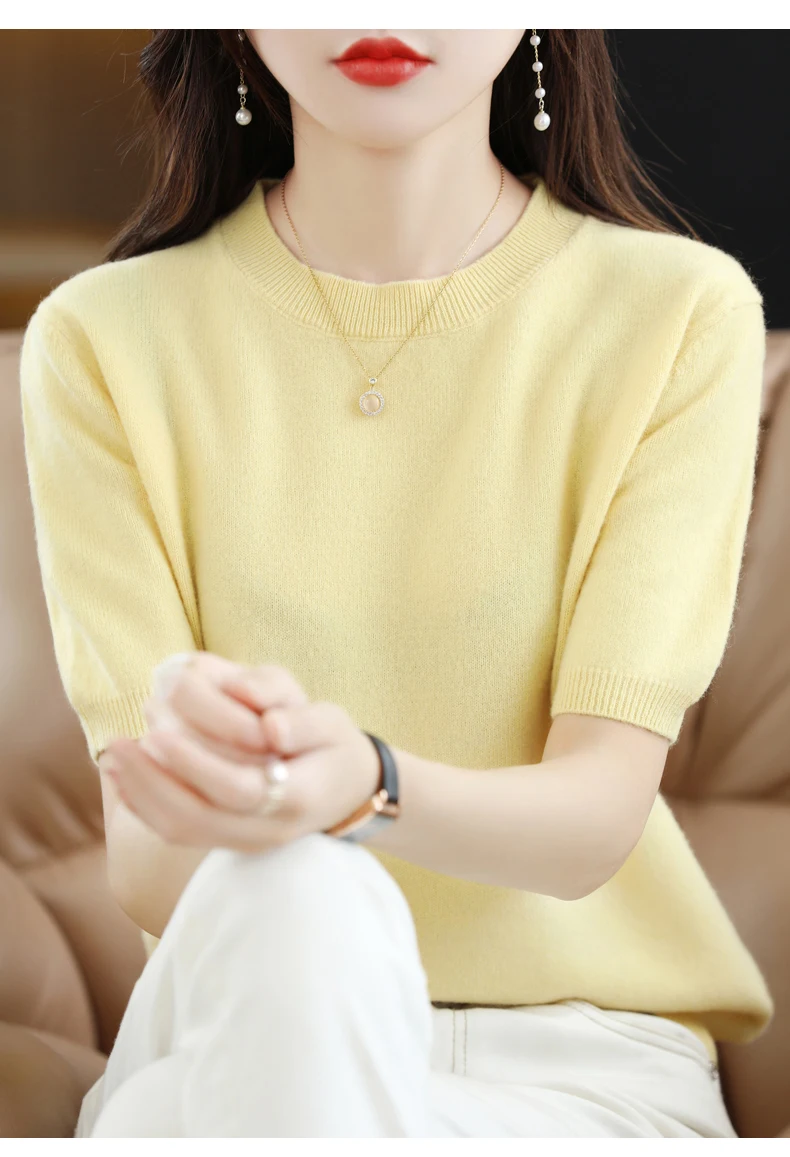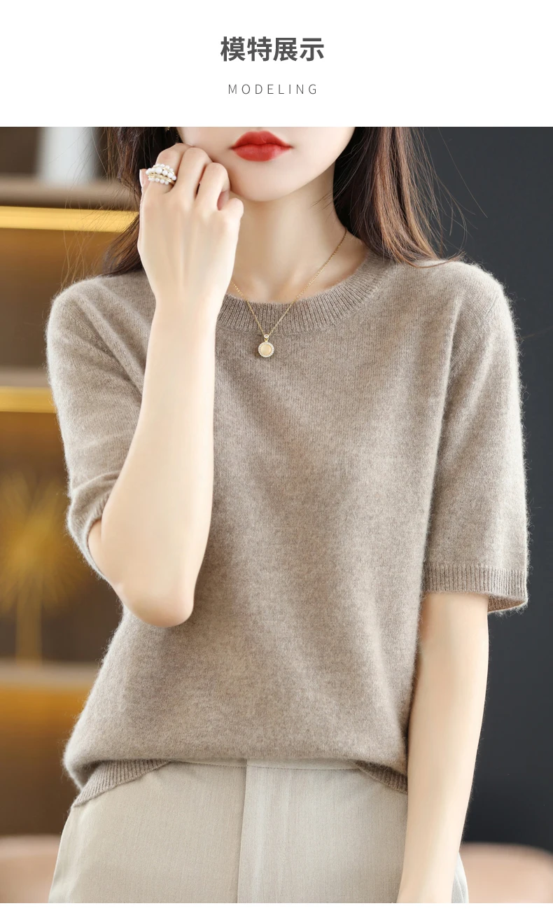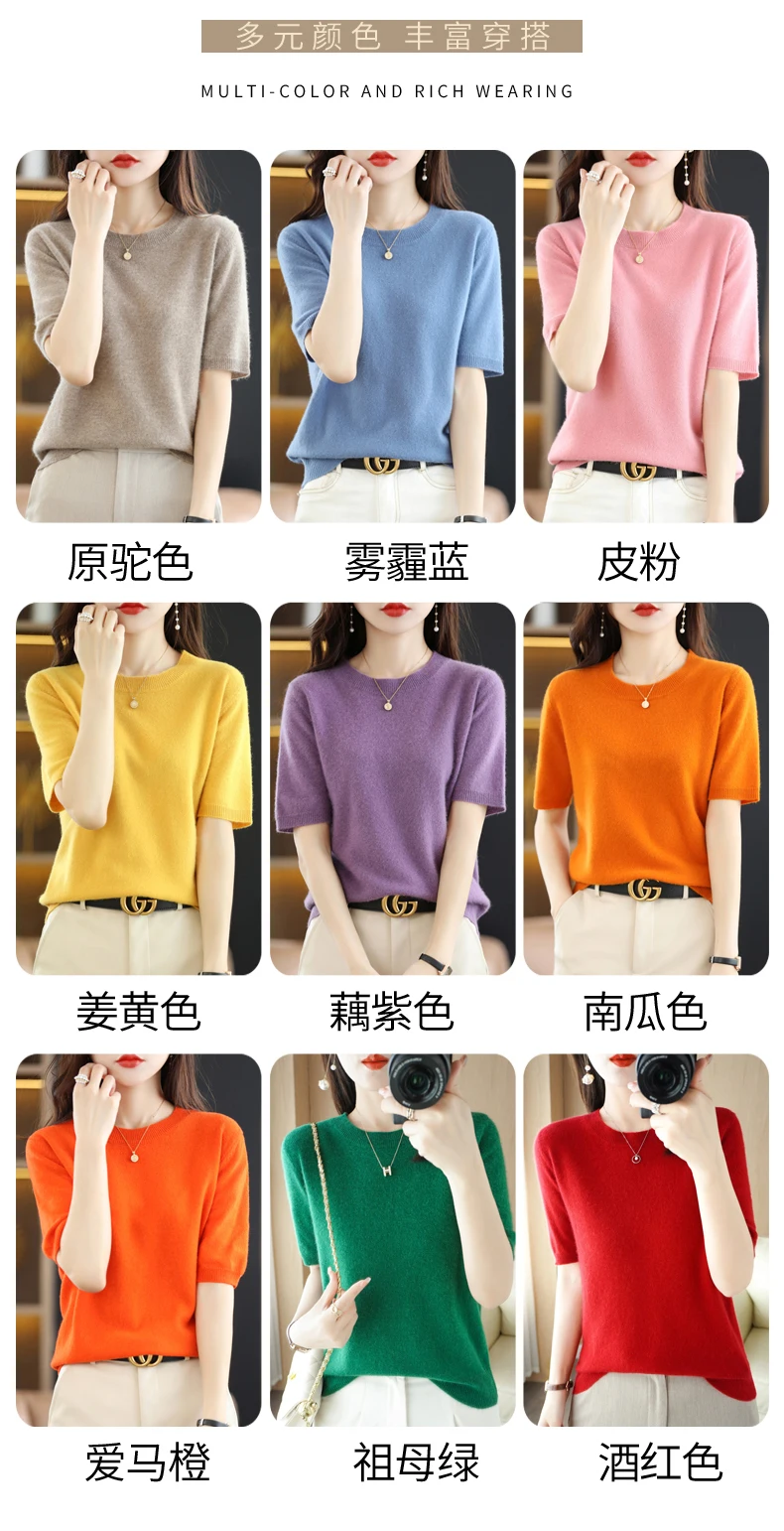 New Short-sleeved Knitwear Women O-neck T-shirt Wool Cotton Blend Pullover Vest Sprig Summer Bottoming Tops Sweater Solid Soft