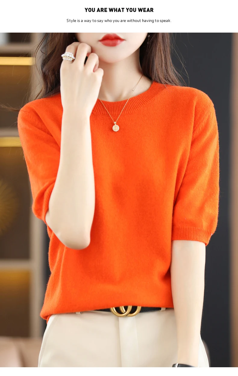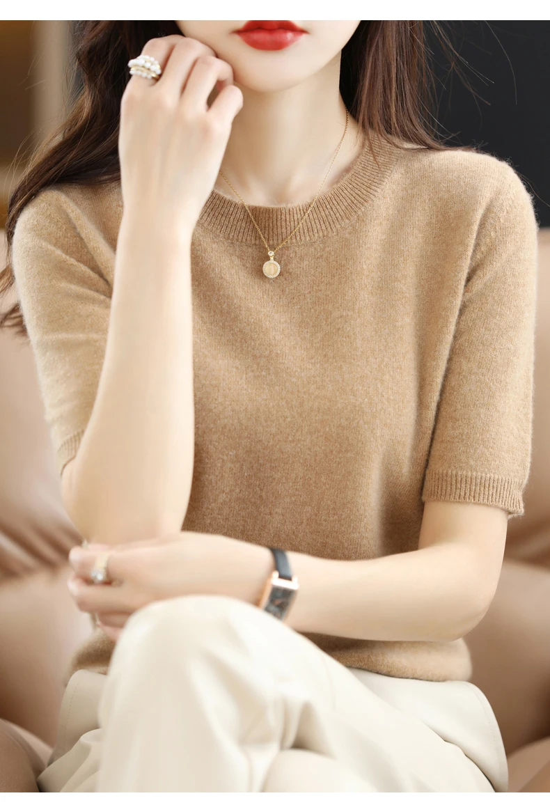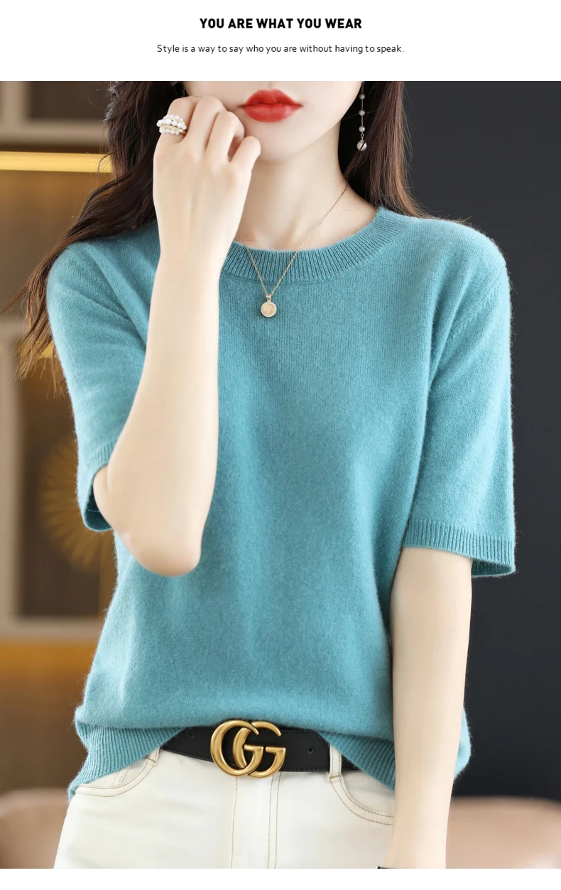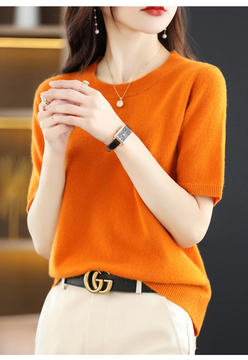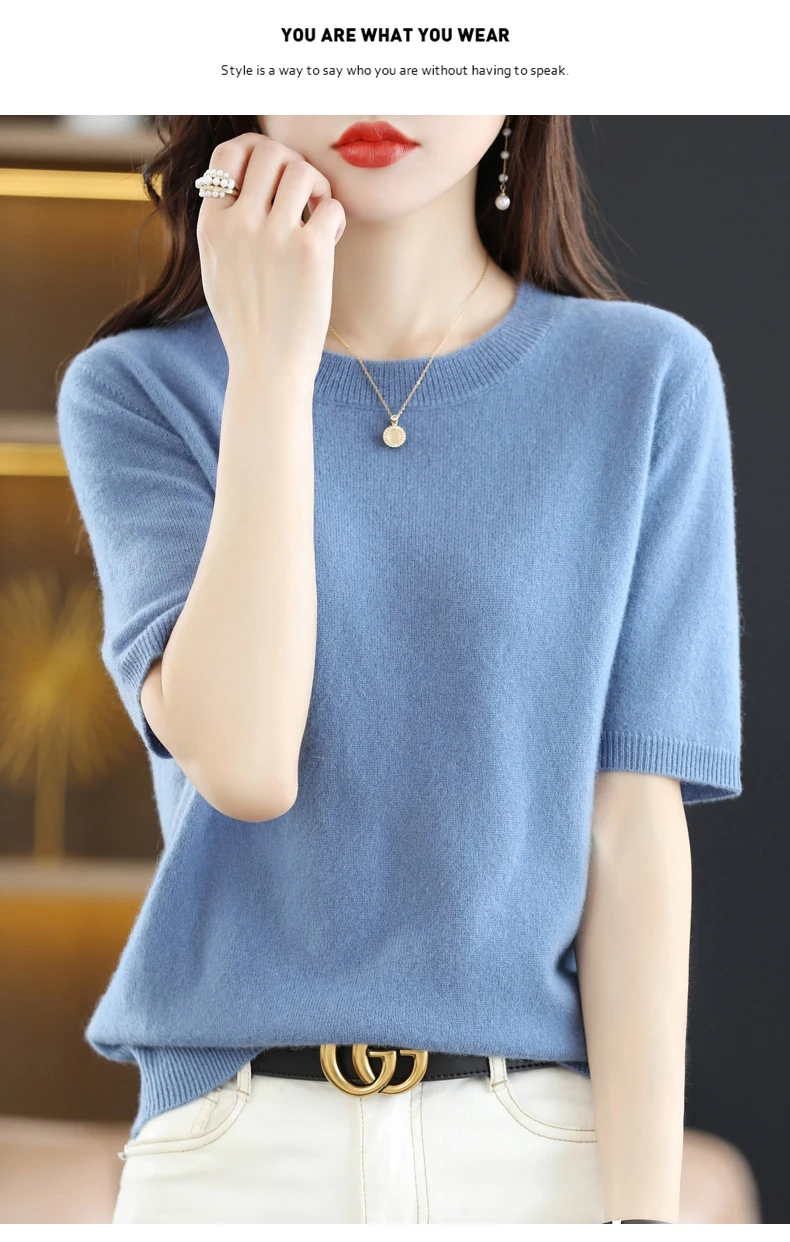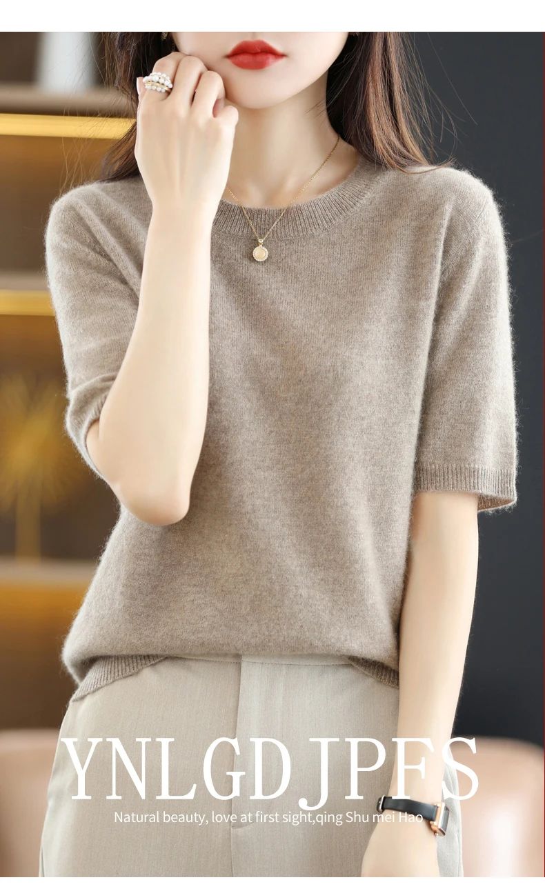 New Short-sleeved Knitwear Women O-neck T-shirt Wool Cotton Blend Pullover Vest Sprig Summer Bottoming Tops Sweater Solid Soft
