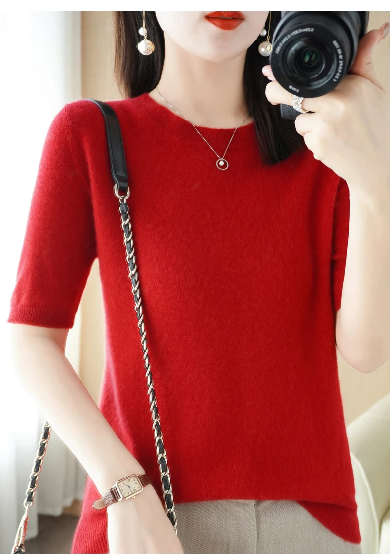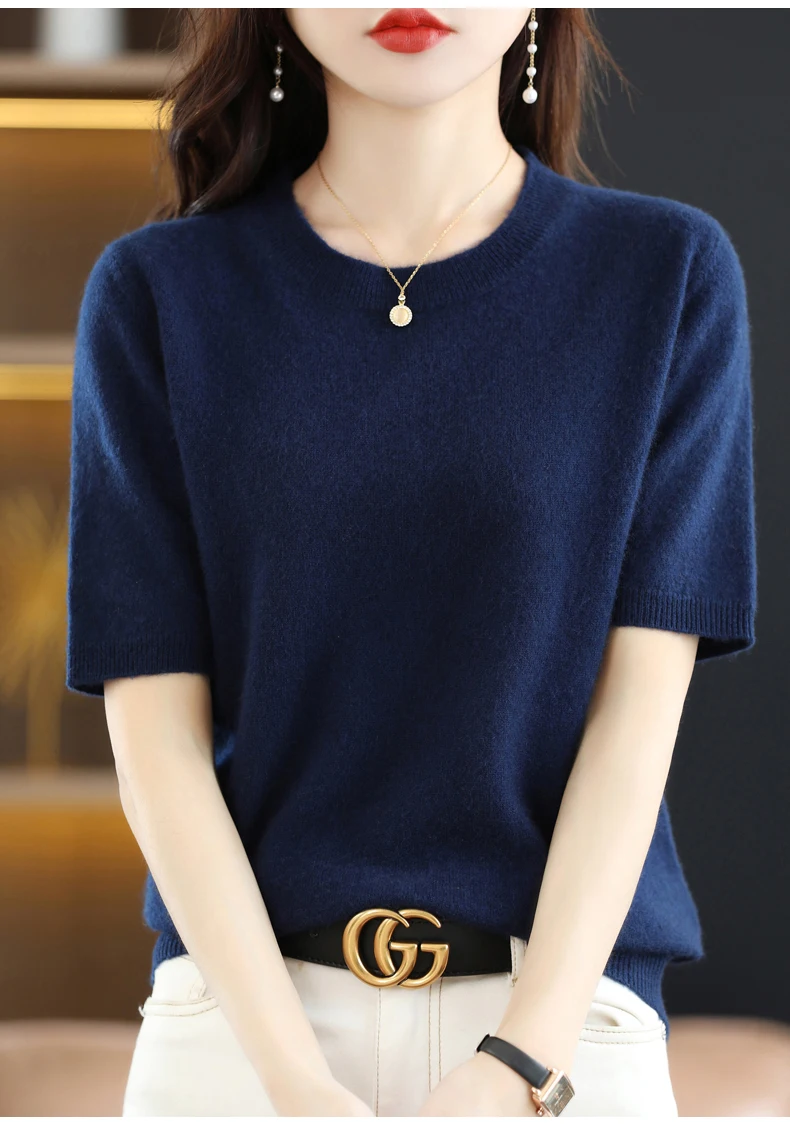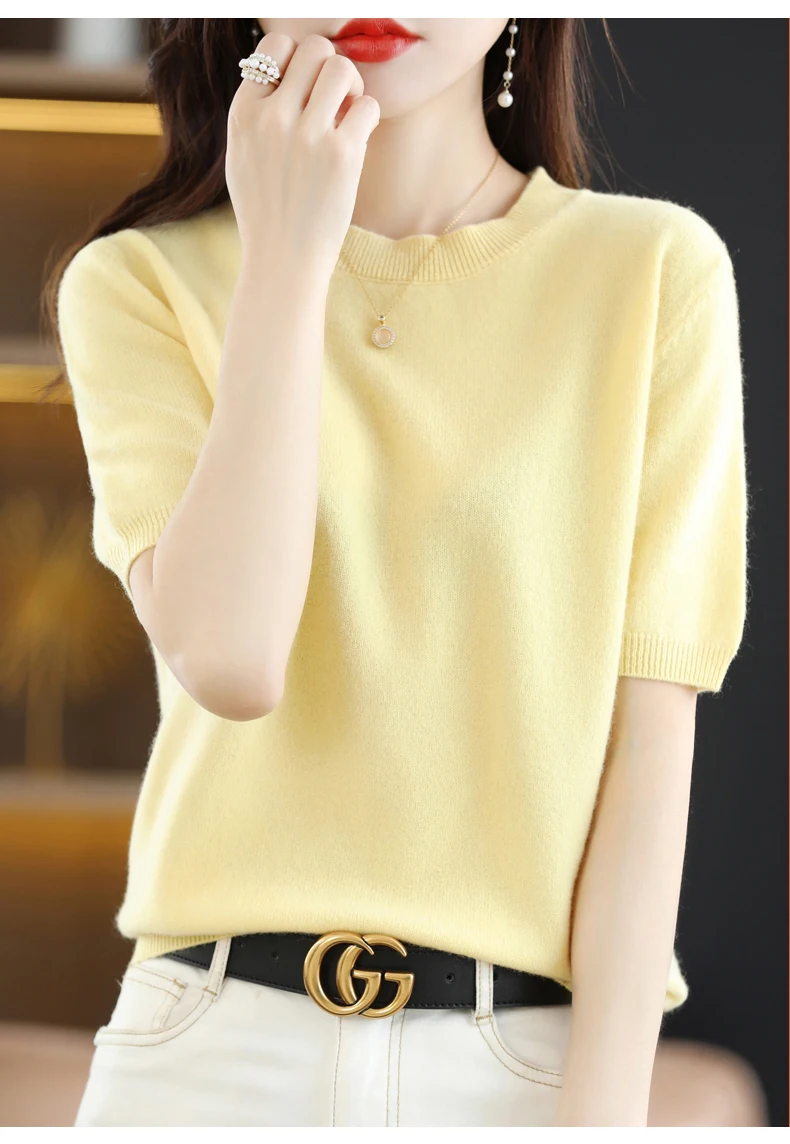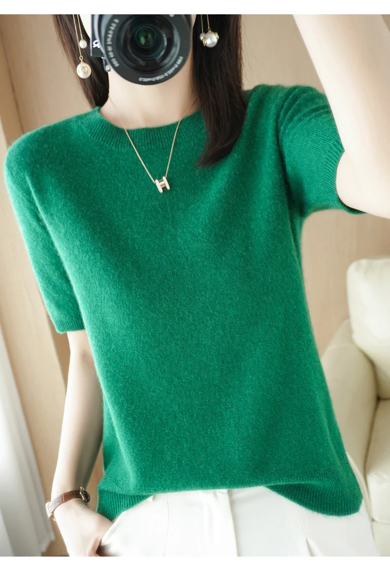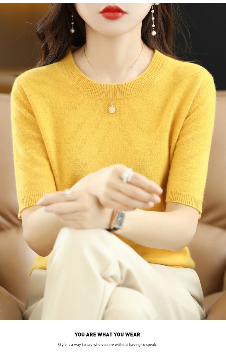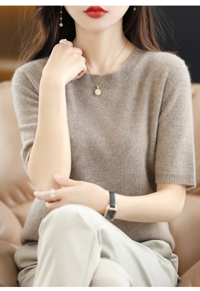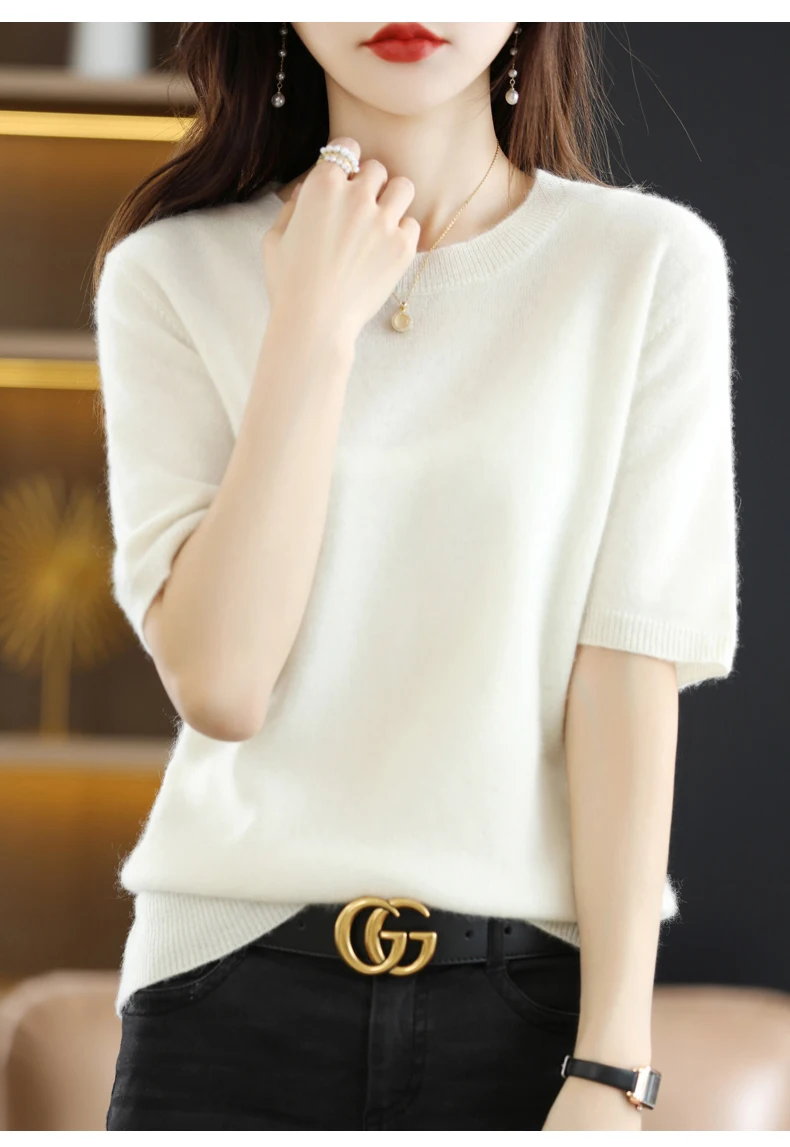 New Short-sleeved Knitwear Women O-neck T-shirt Wool Cotton Blend Pullover Vest Sprig Summer Bottoming Tops Sweater Solid Soft