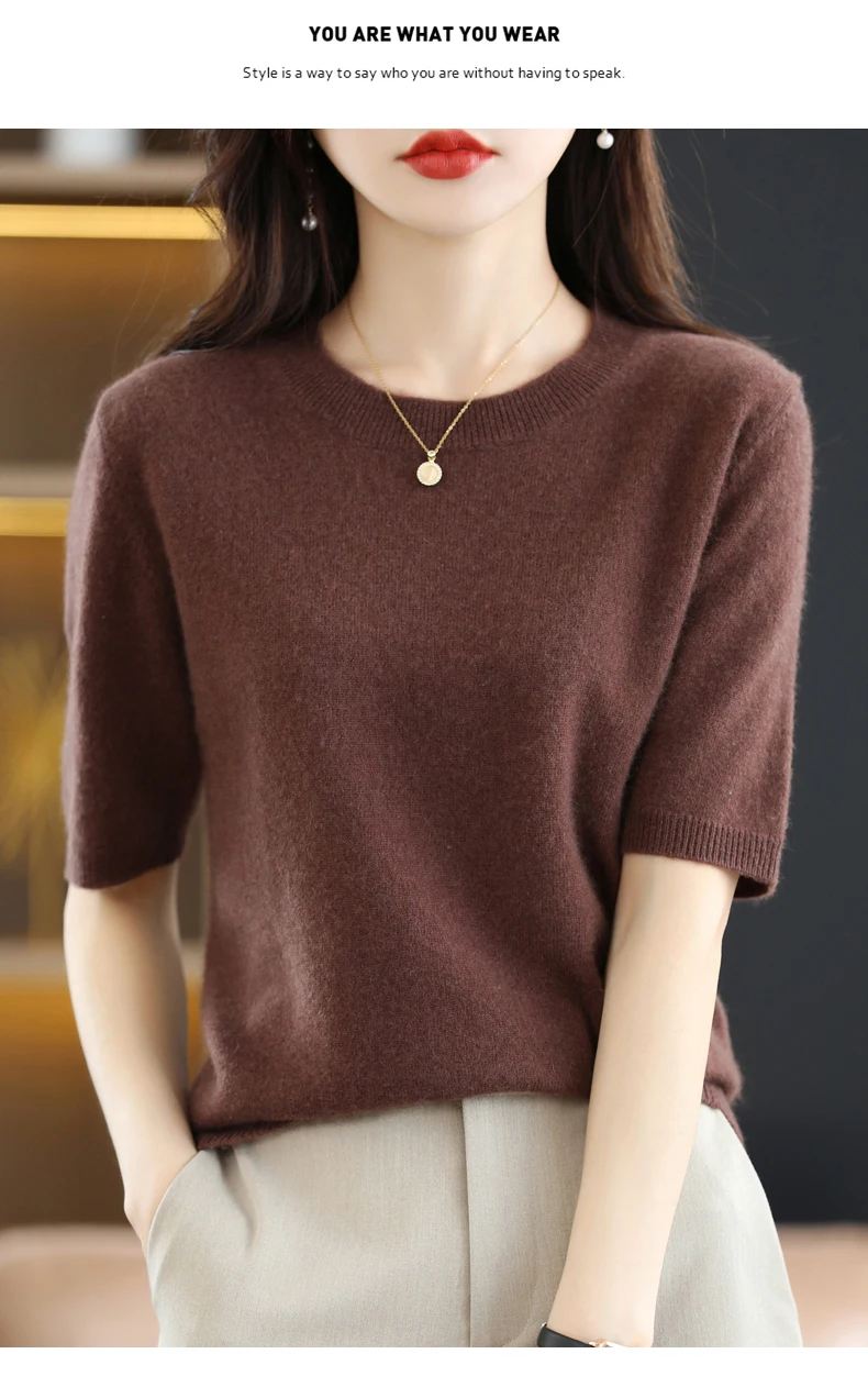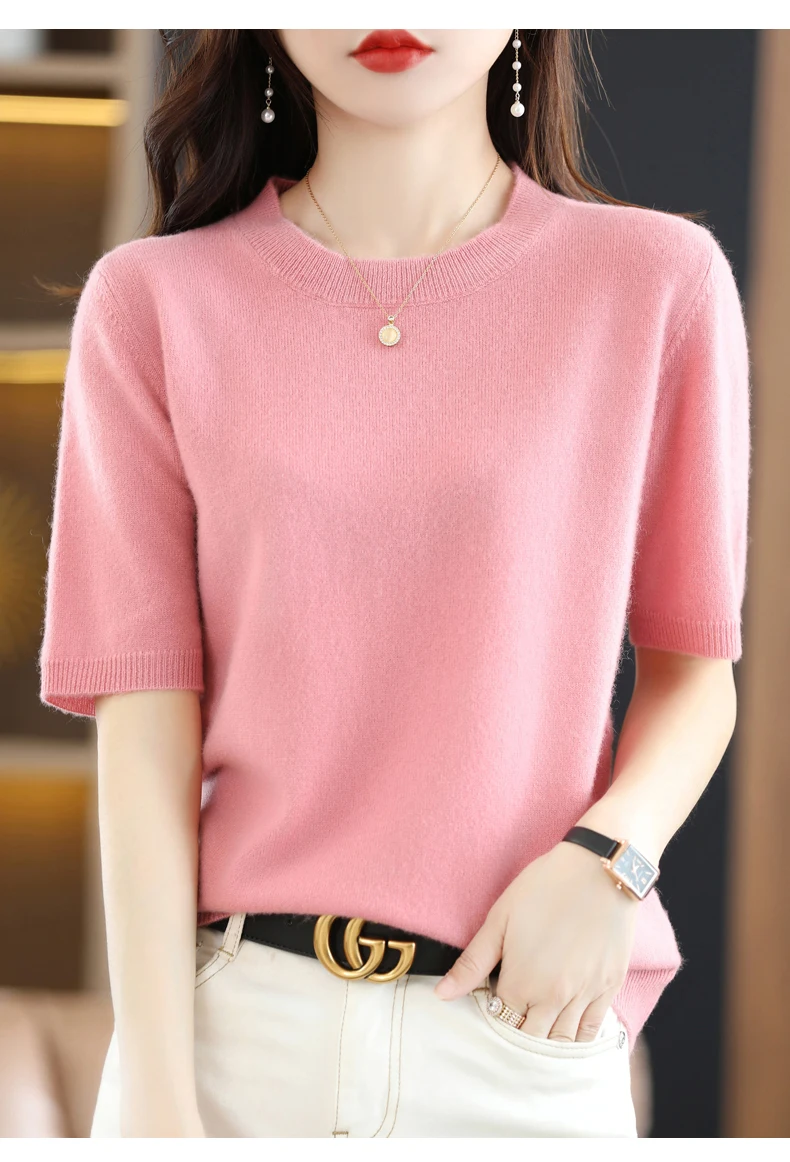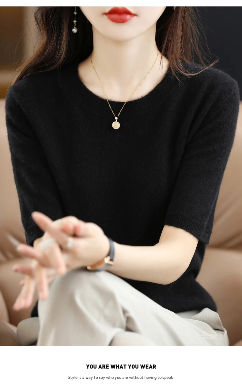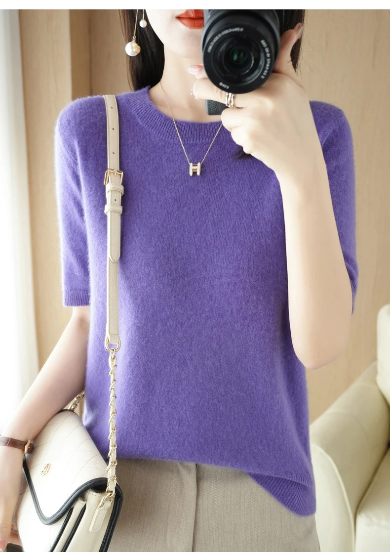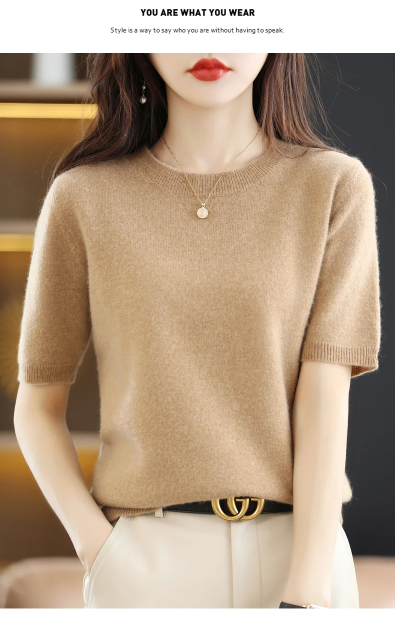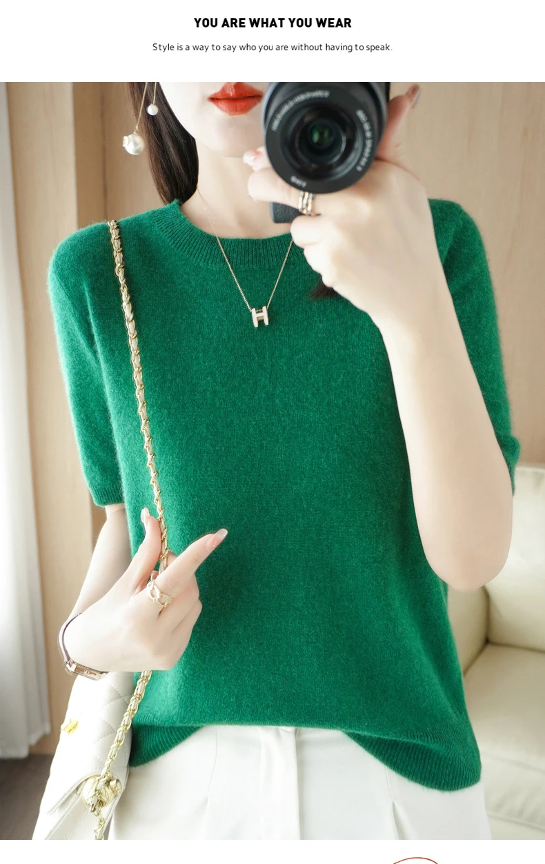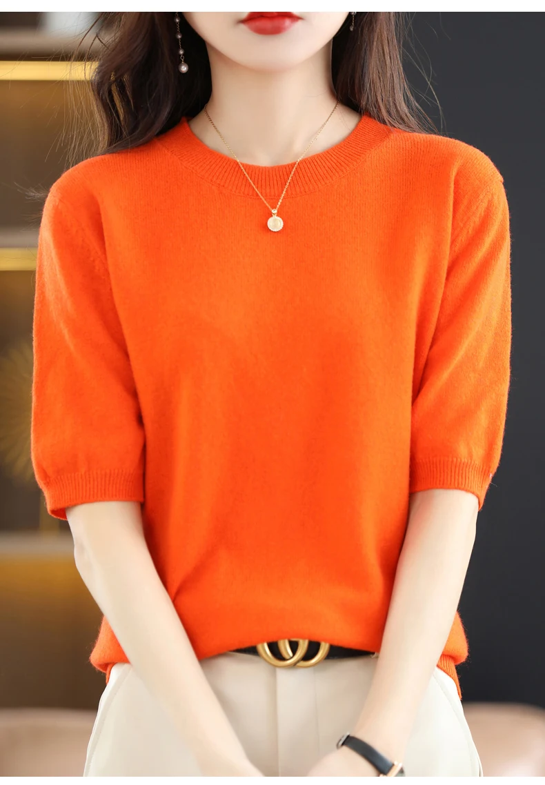 New Short-sleeved Knitwear Women O-neck T-shirt Wool Cotton Blend Pullover Vest Sprig Summer Bottoming Tops Sweater Solid Soft