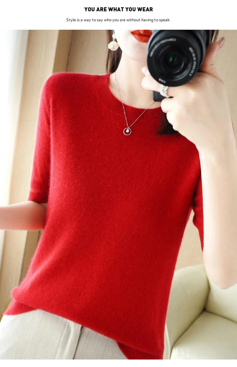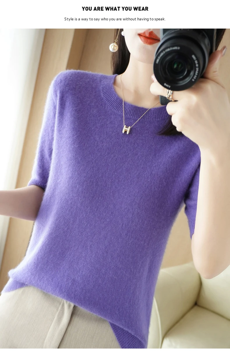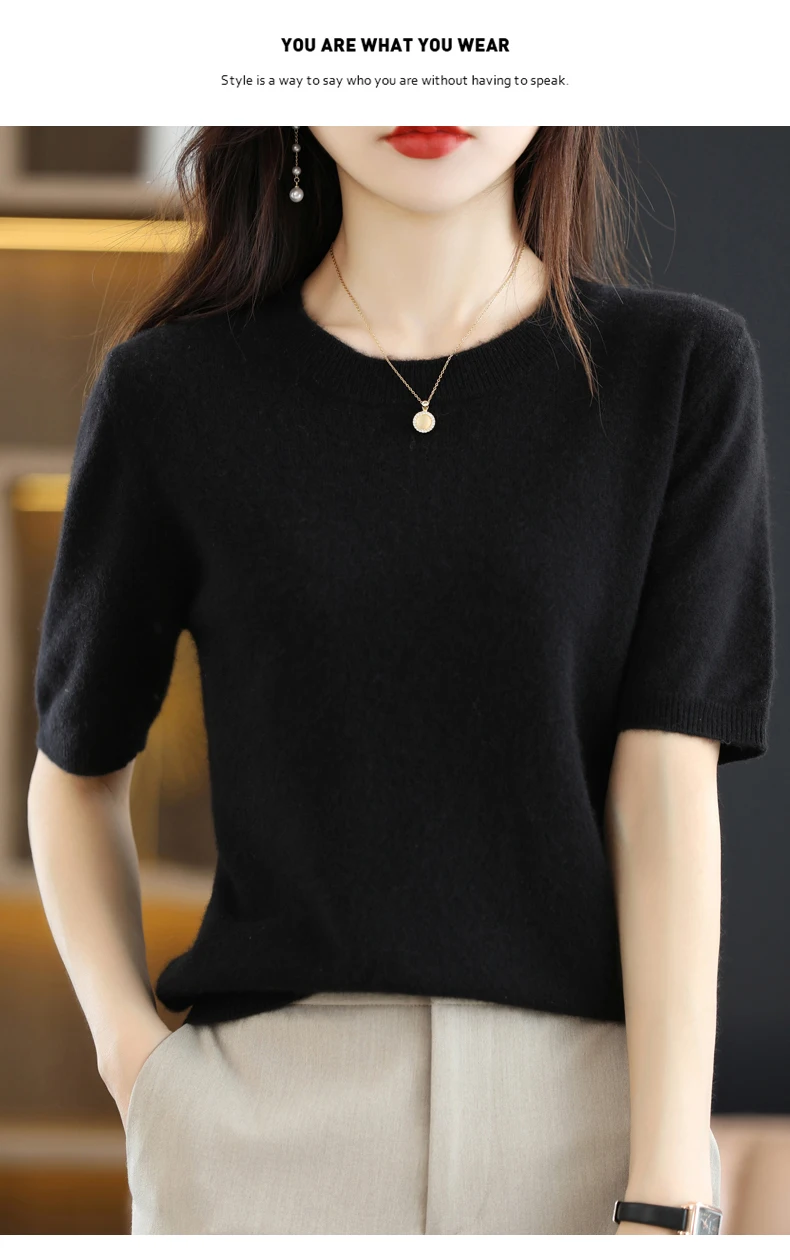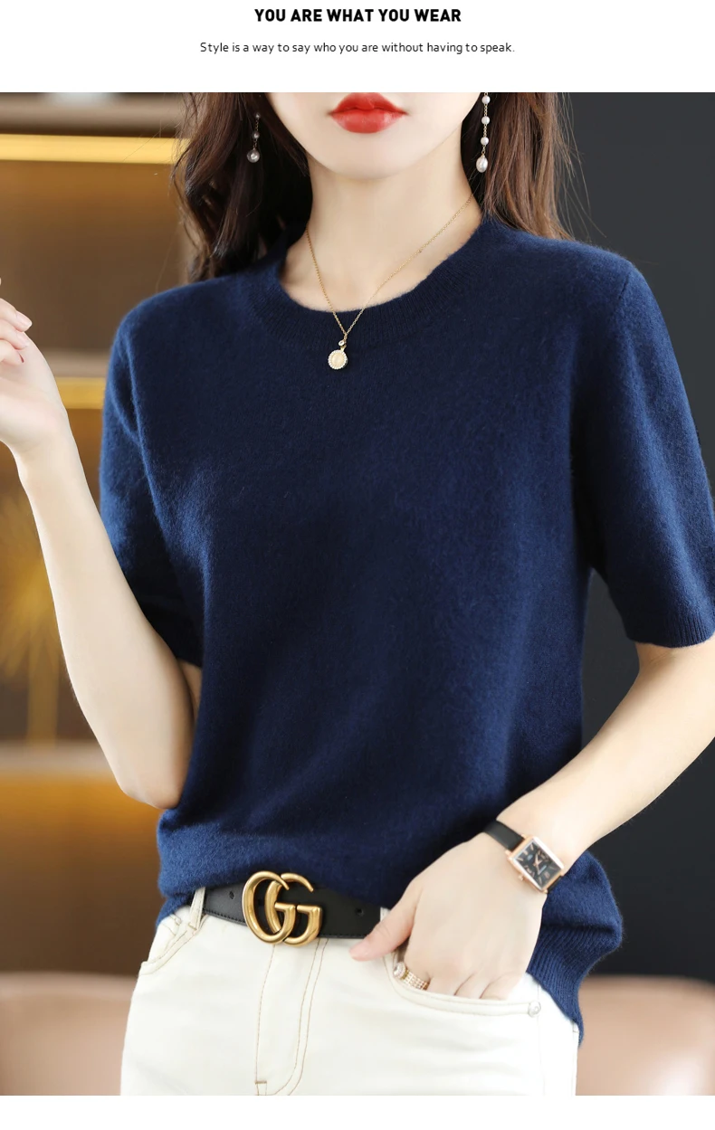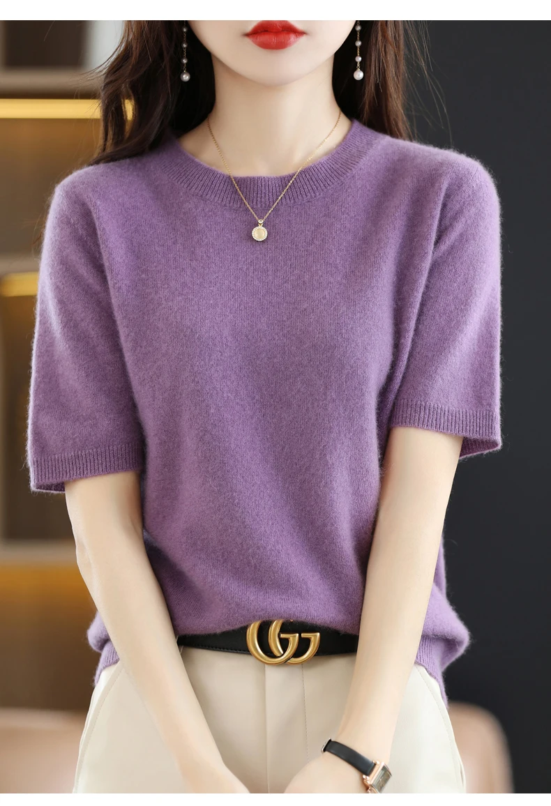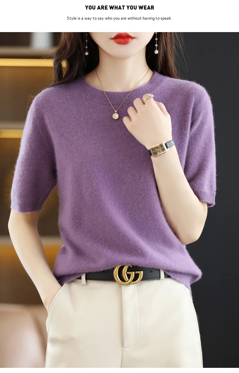 New Short-sleeved Knitwear Women O-neck T-shirt Wool Cotton Blend Pullover Vest Sprig Summer Bottoming Tops Sweater Solid Soft