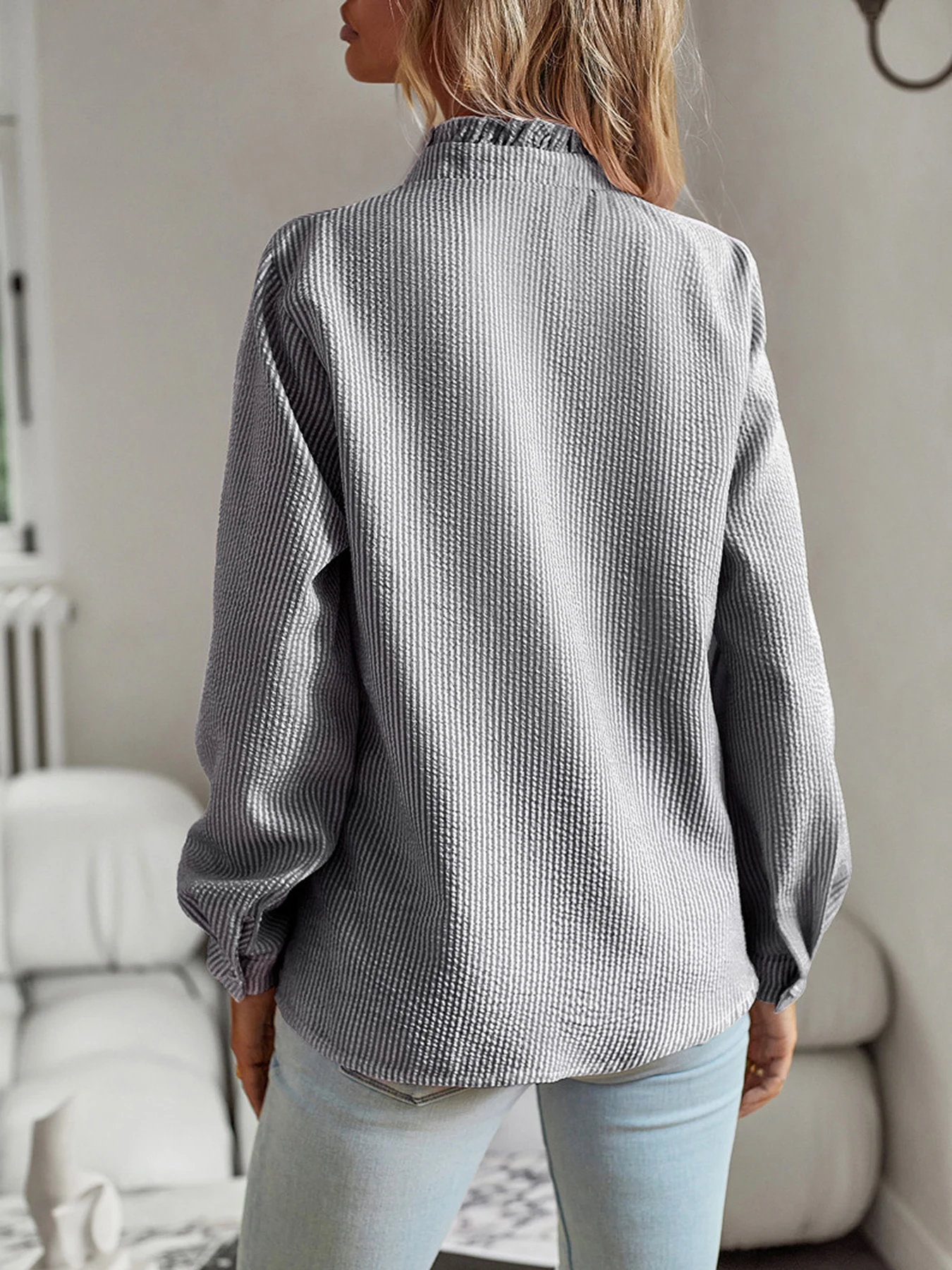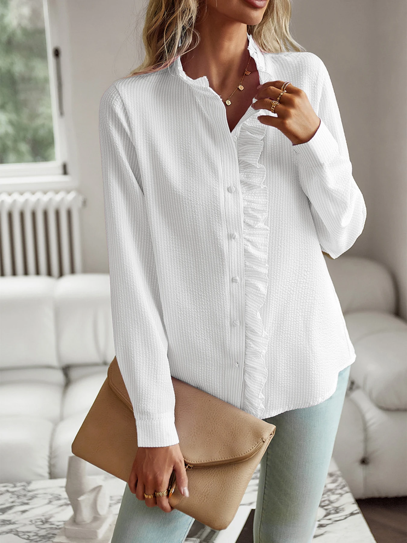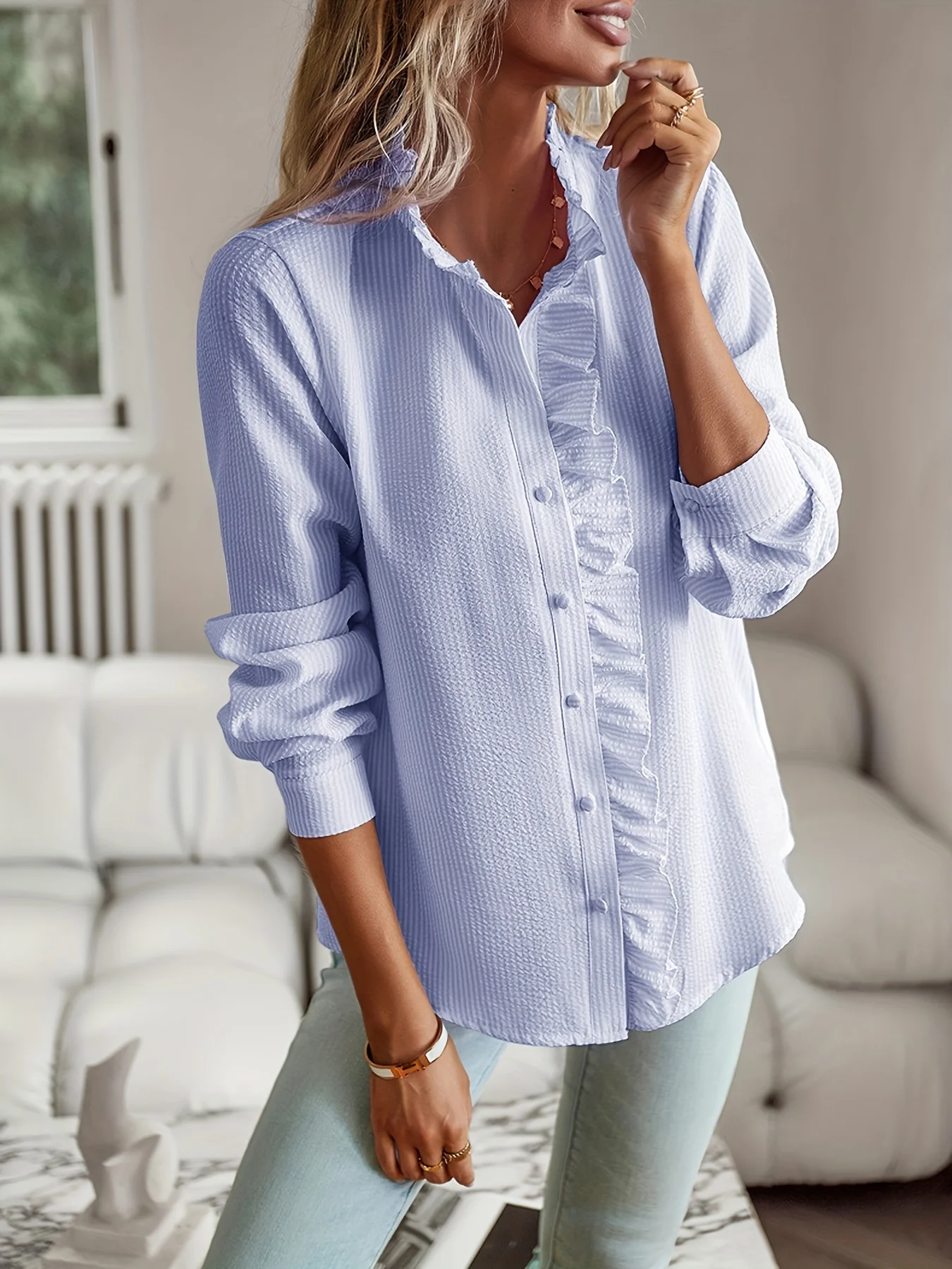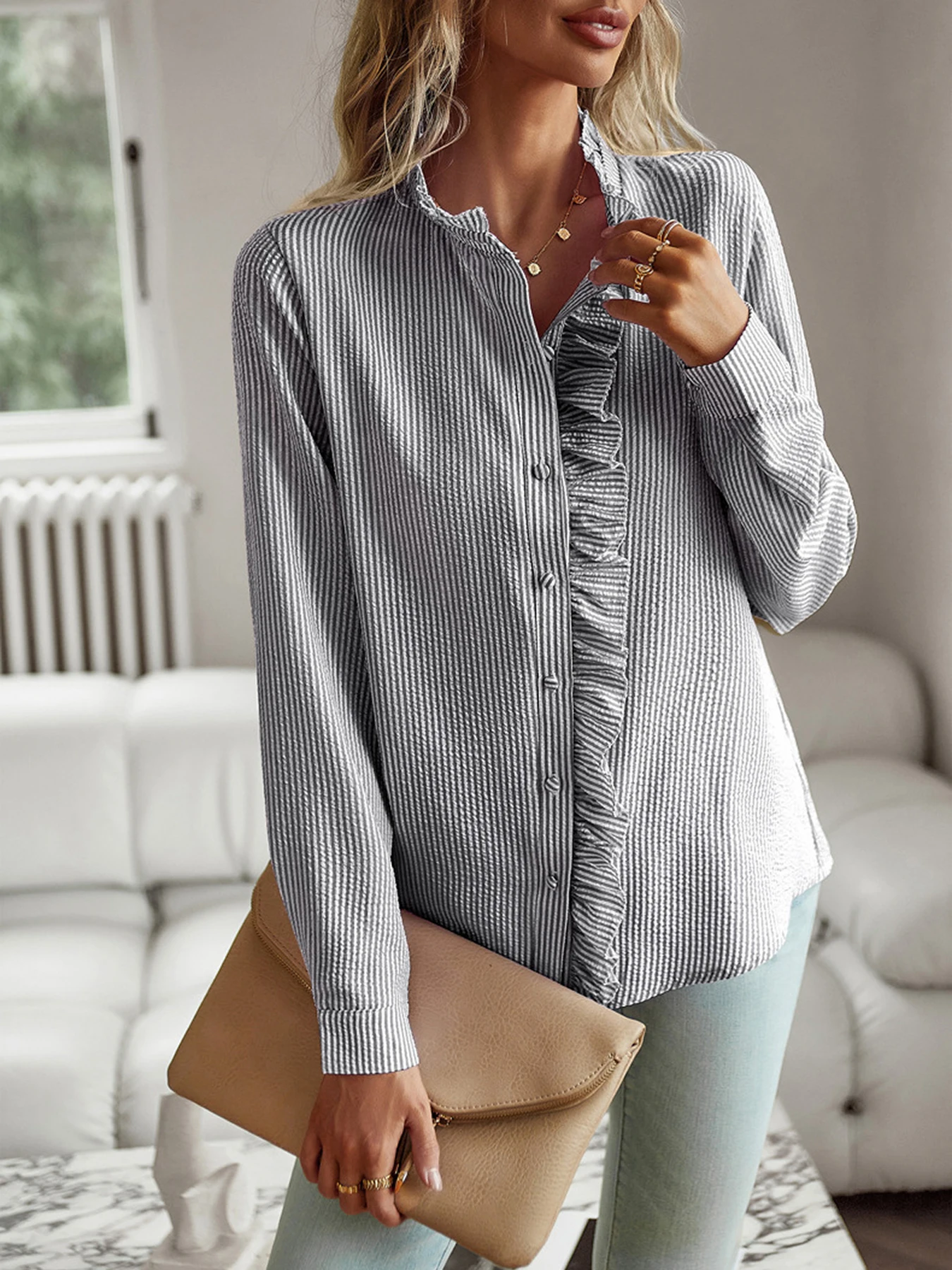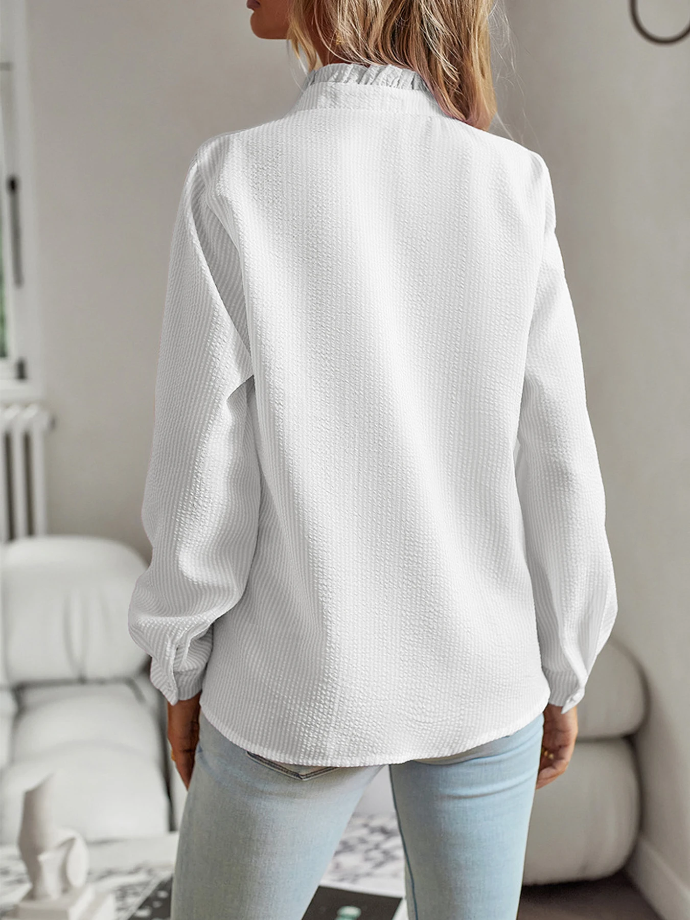 New Style 2024 temperament commuter blouse cardigan ruffled long-sleeved puffy-sleeved shirt blouse woman