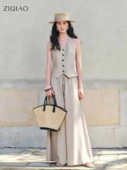 ZIQIAO Women Old Money Style Waist Cinched Vest & Wide Leg Pants Set Elastic High Waist Skirted Trousers Casual Two-Piece Outfit