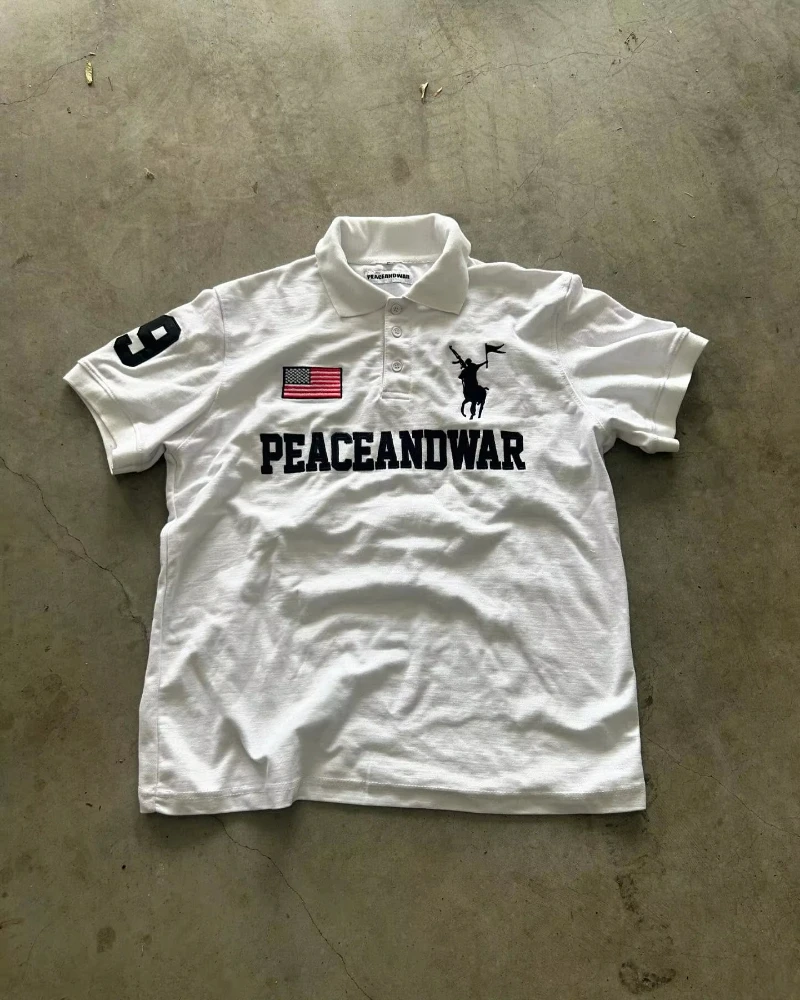 Peace Flag America Retro Polo Shirt Y2k Streetwaer Letter Embroidery Lapel Shirt Casual Short Sleeve Jersey Hip Hop Men Clothing