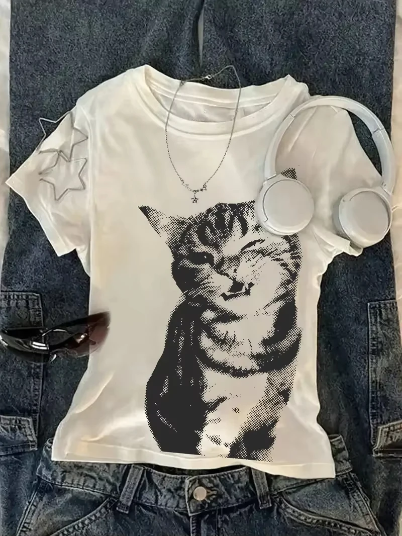 Plus-size Cat Print Women’s High-street Loose-fitting T-shirt Street Style Suitable for All Seasons Fashionable and Versatile