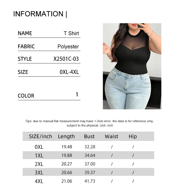 Plus Size Women’s 2025 Summer New Sleeveless Round Neck Mesh See Through Sexy Mesh Splicing Black Blouse T Shirt Polyester