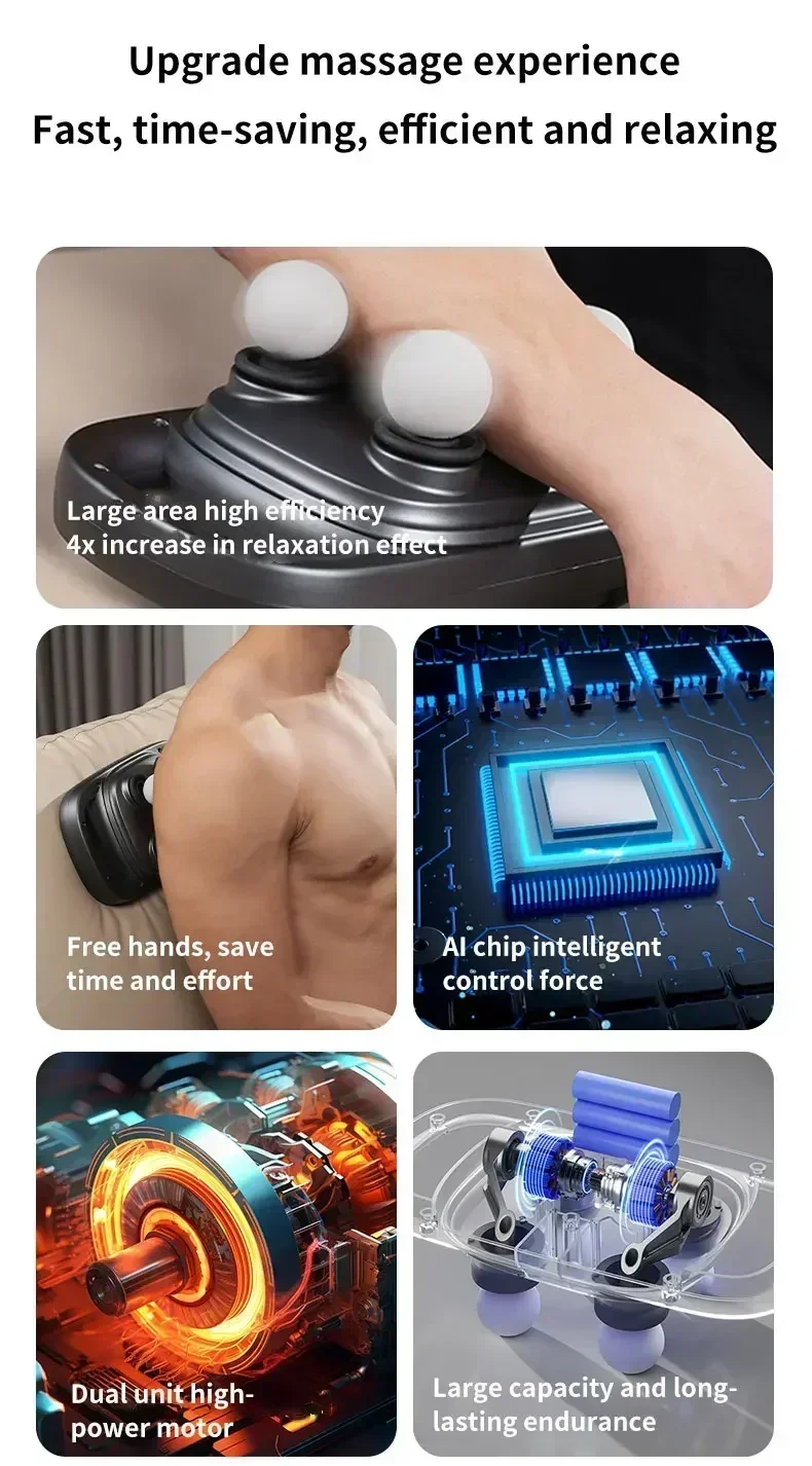 Upgrade your relaxation routine with our quad-hammer technology, offering four distinct modes of blissful comfort: from broad-area relaxation to pinpoint precision, it’s a symphony of muscle relief. Free up your hands and indulge in lazy luxury as our AI-powered chip intelligently controls the dual high-powered motors, ensuring a seamless massage experience with every stroke.