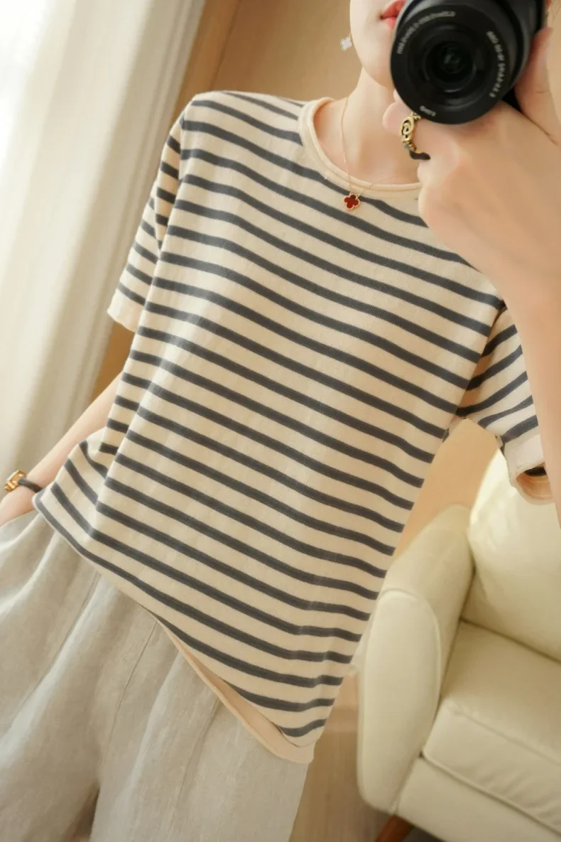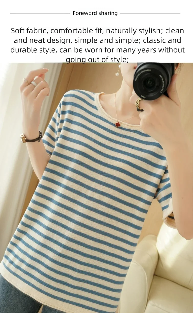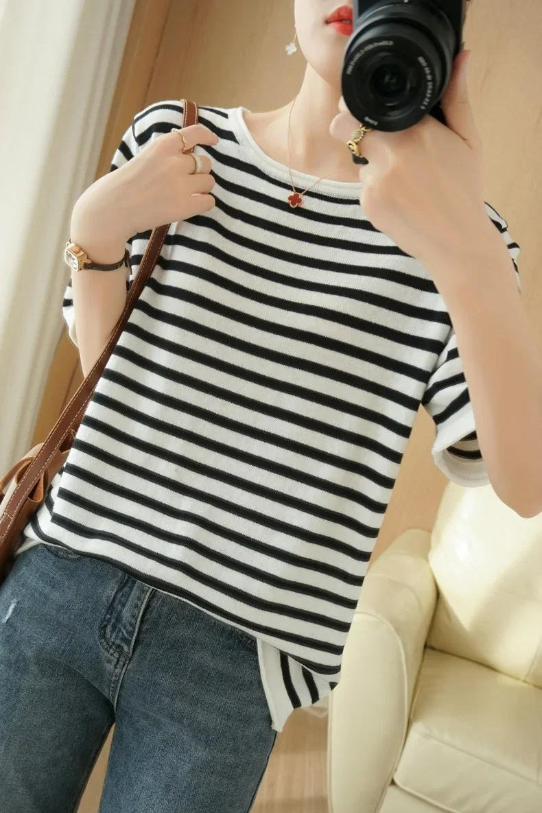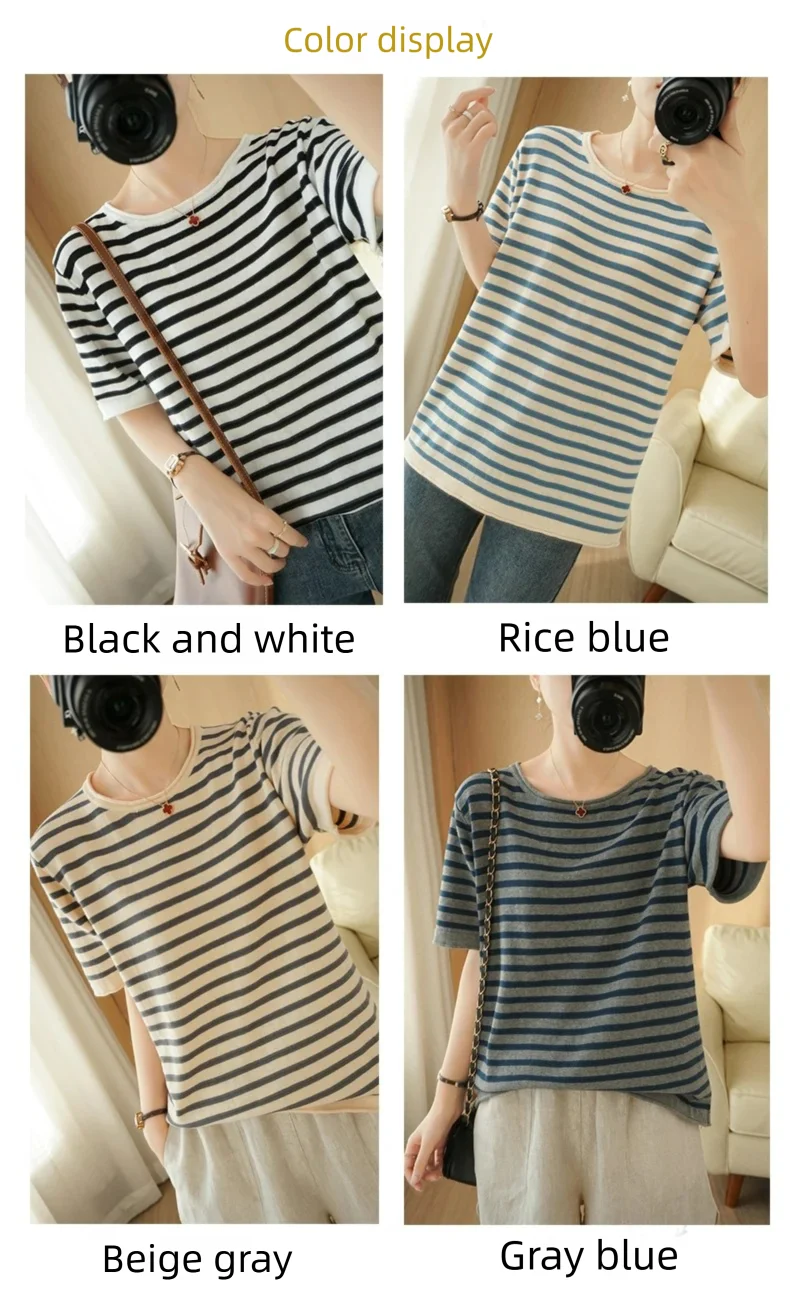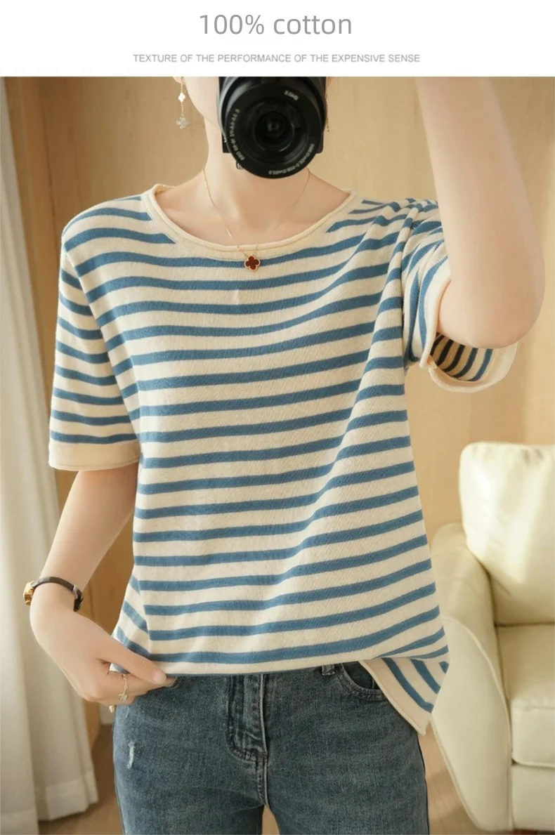 Pure Cotton Round Neck T Shirt For Women Summer Korean Style Loose Large Size Casual Short Sleeve Striped Top Base Shirt Blouse.