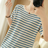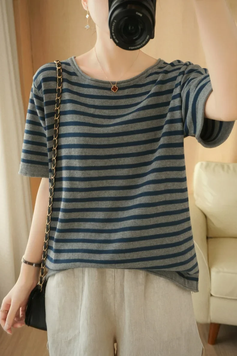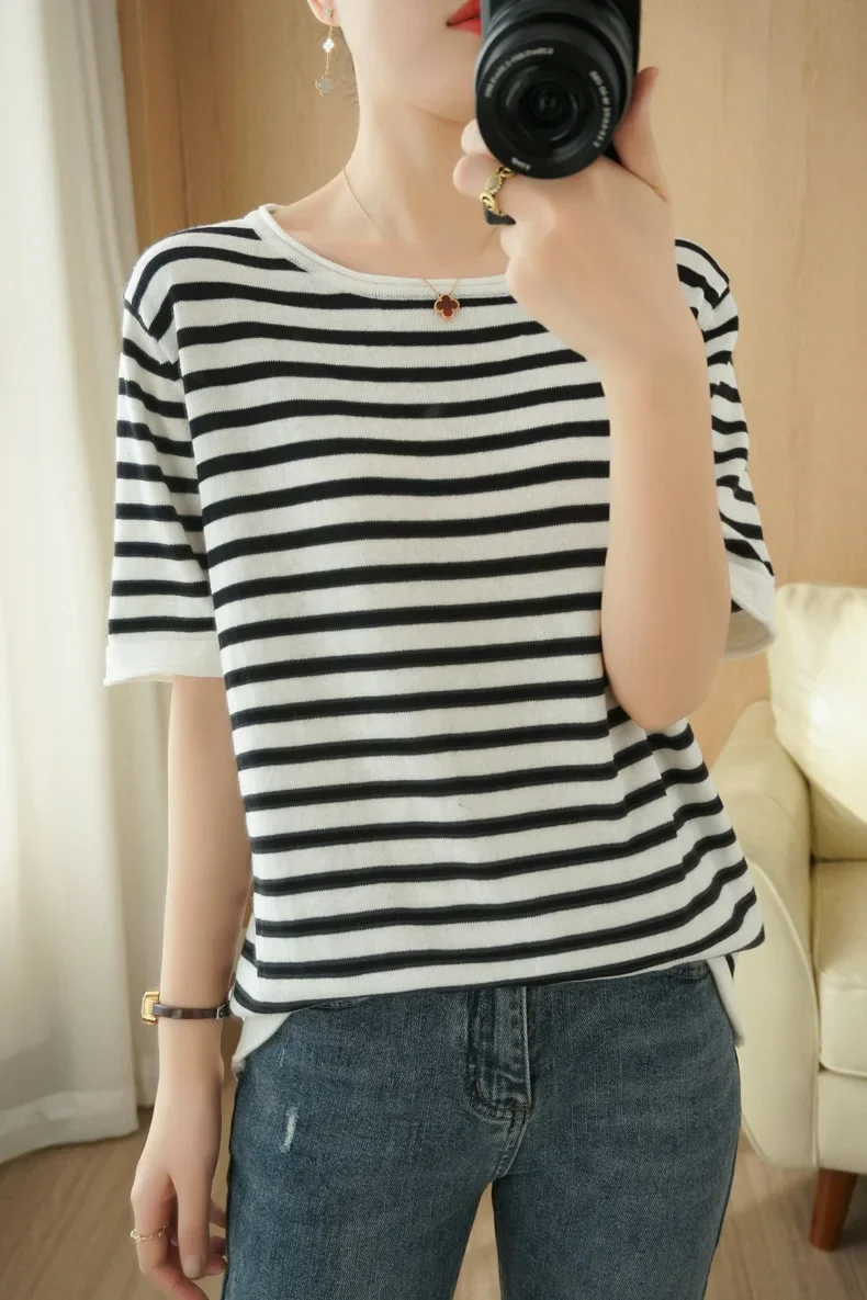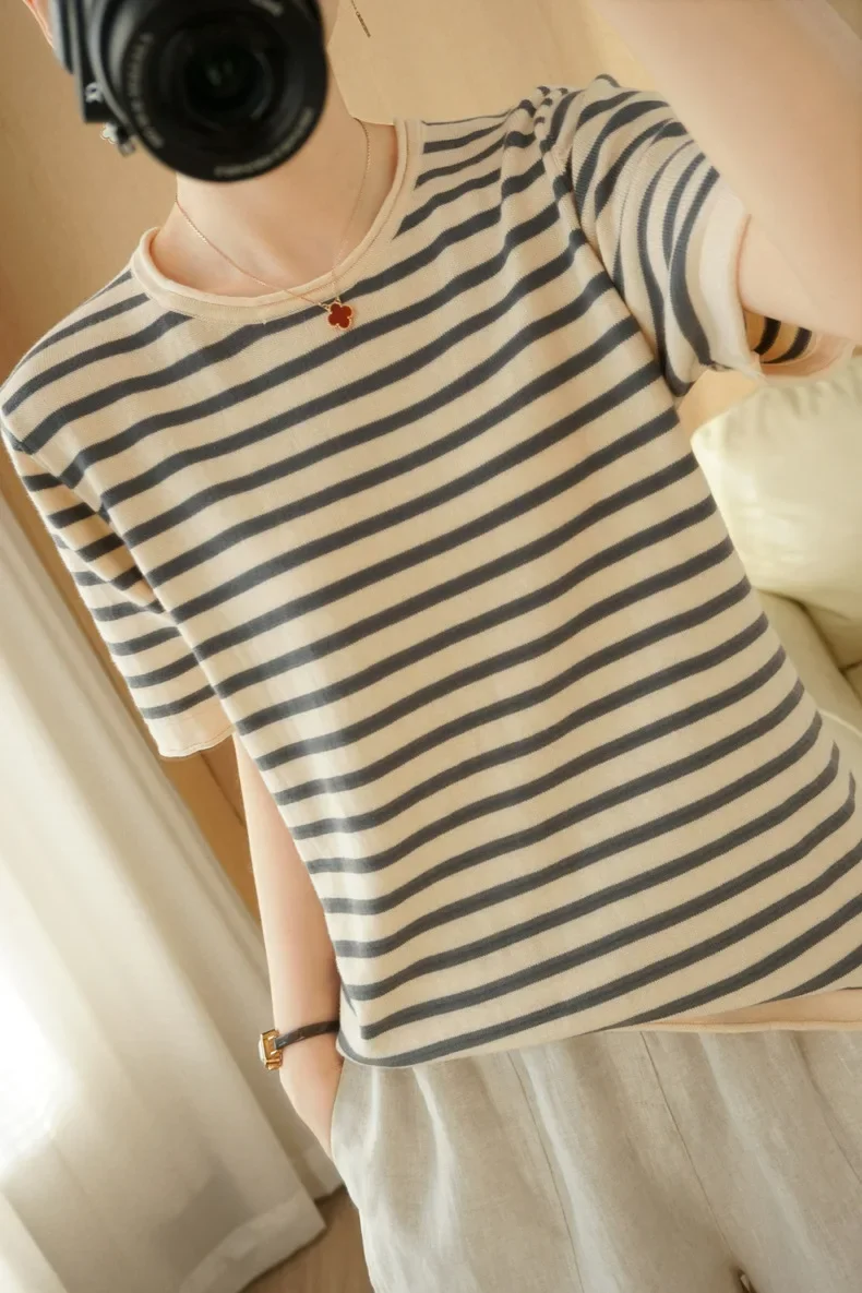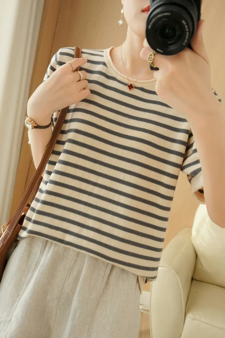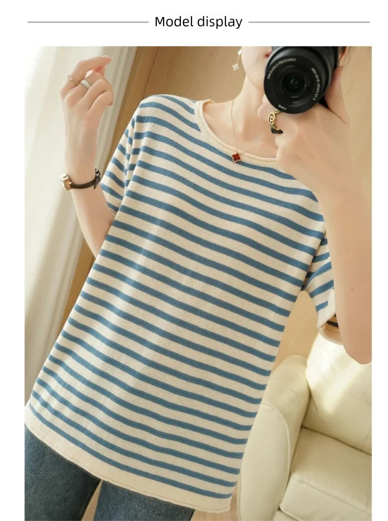 Pure Cotton Round Neck T Shirt For Women Summer Korean Style Loose Large Size Casual Short Sleeve Striped Top Base Shirt Blouse.