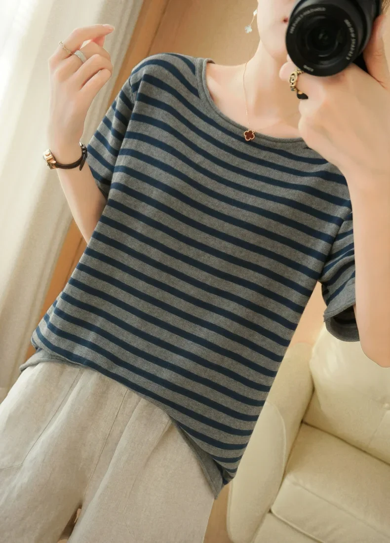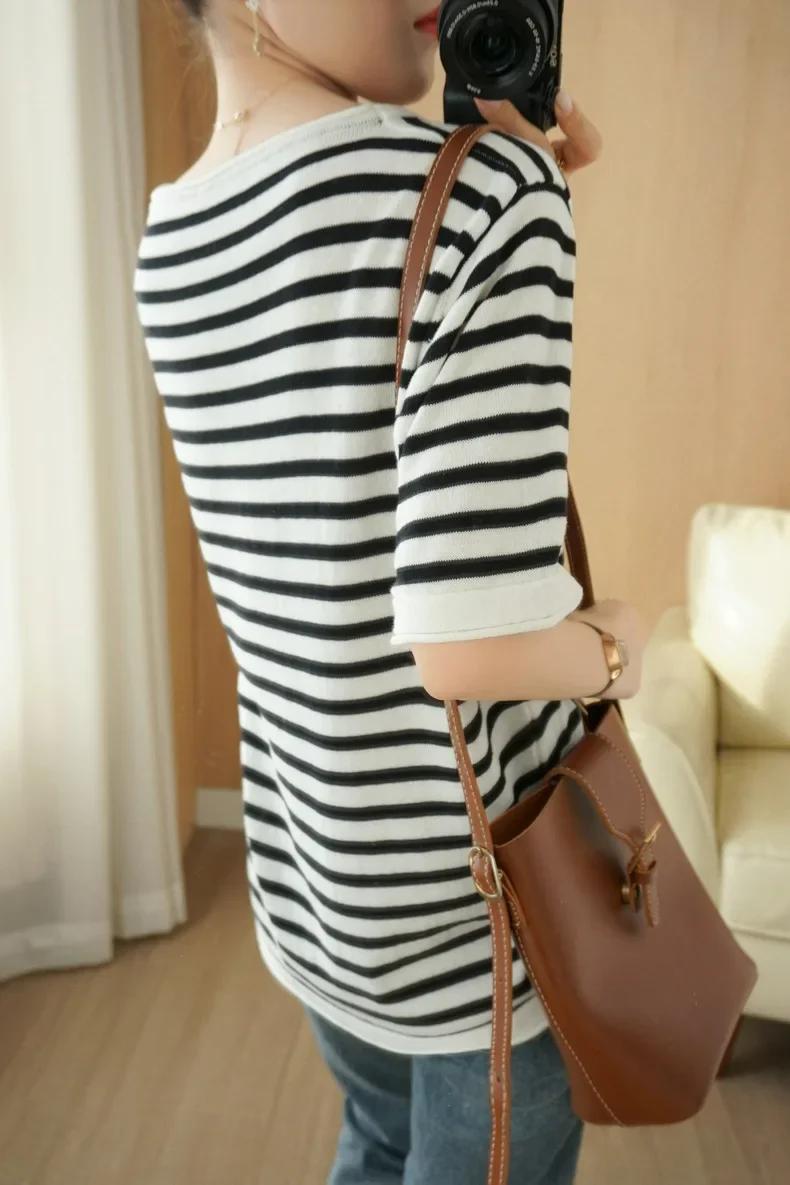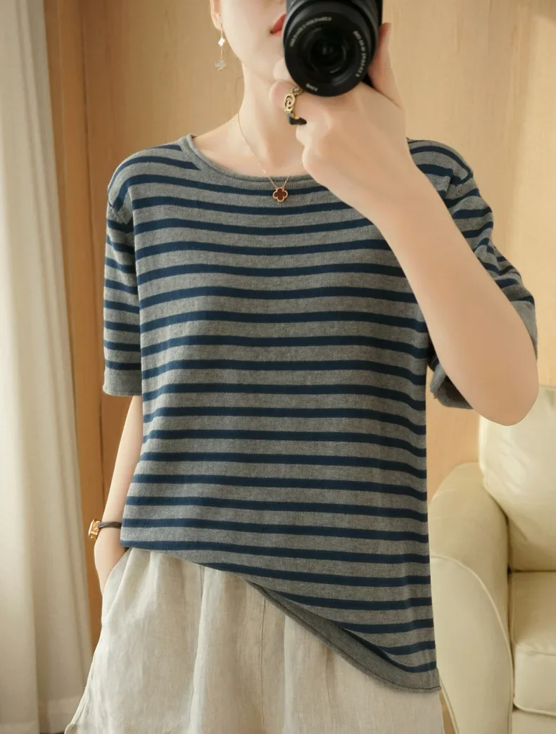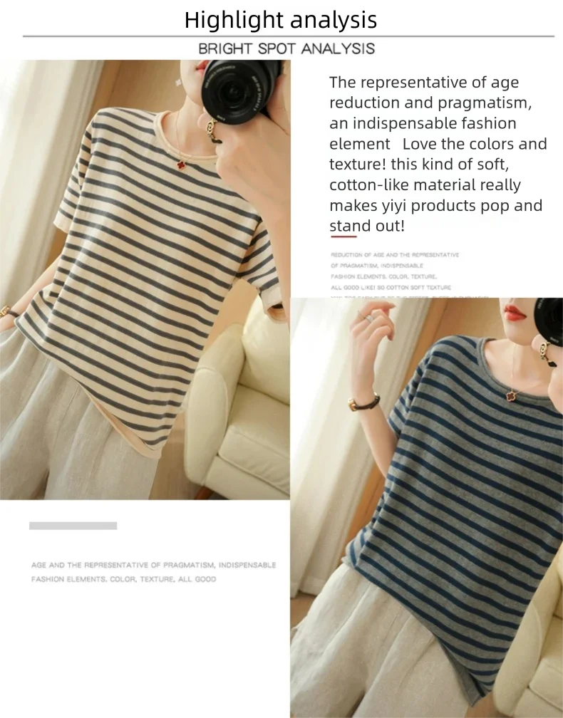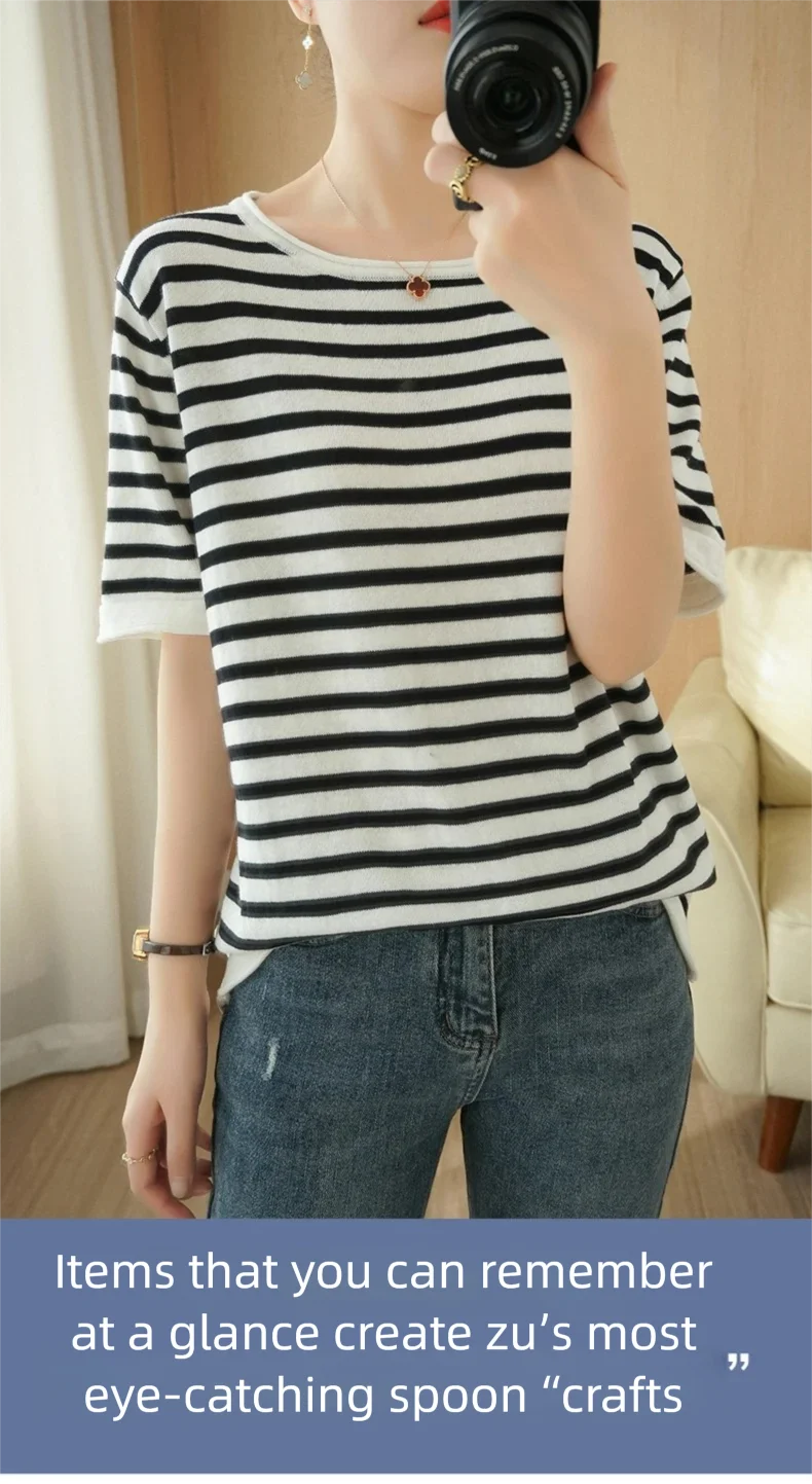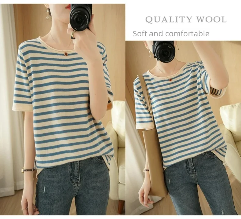 Pure Cotton Round Neck T Shirt For Women Summer Korean Style Loose Large Size Casual Short Sleeve Striped Top Base Shirt Blouse.