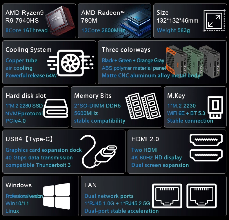 Equipped with the Ryzen R9 7940Hs, this Mini PC offers exceptional processing power for seamless multitasking and gaming.