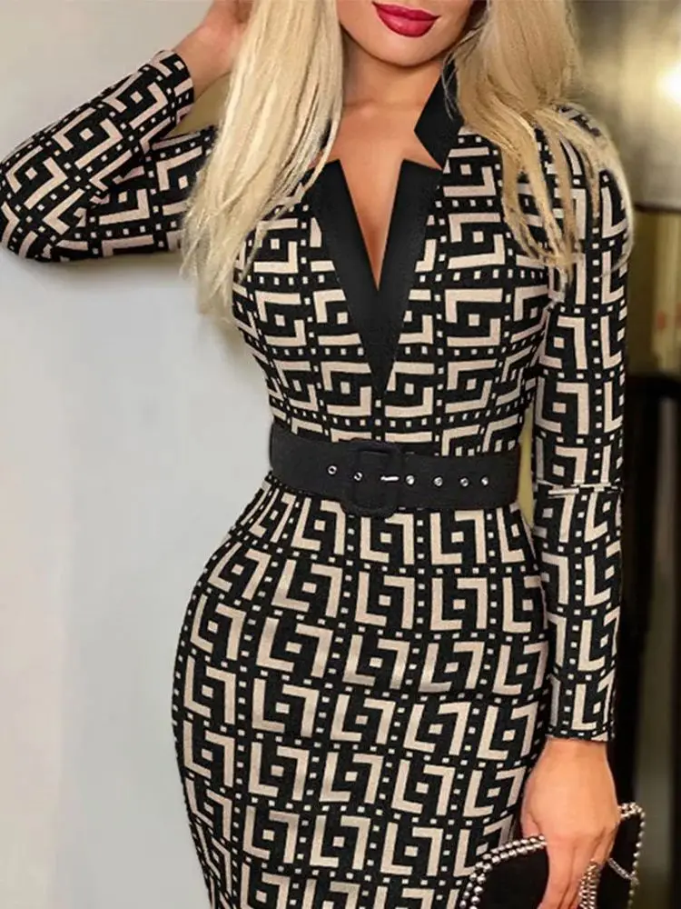 Sexy Geometric Pattern V-Neck Midi Pencil Dress with Belt – Long Sleeve Knit Bodycon for All Seasons
