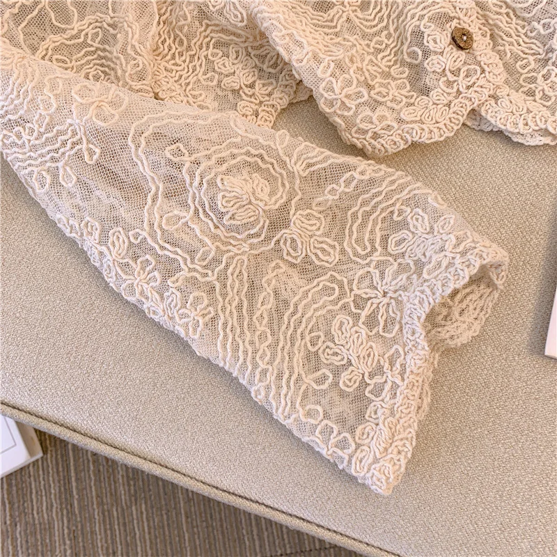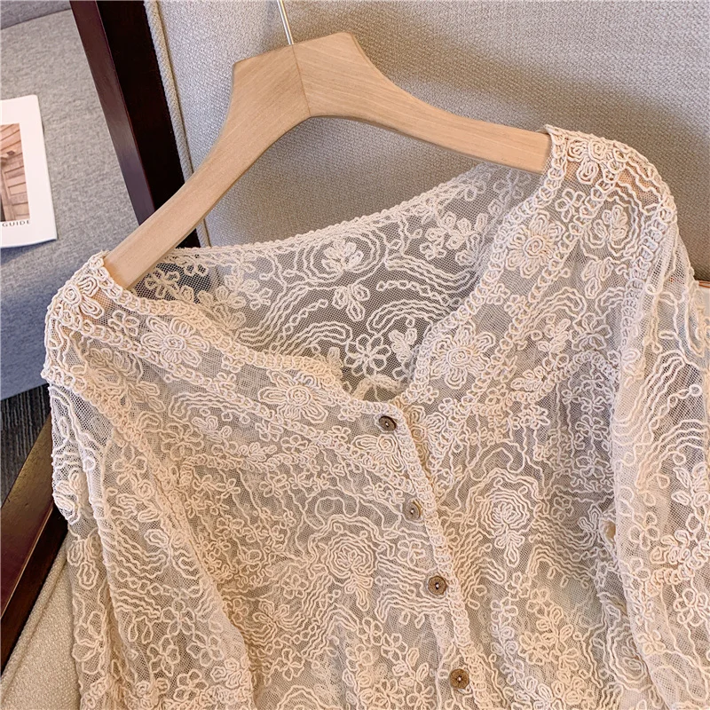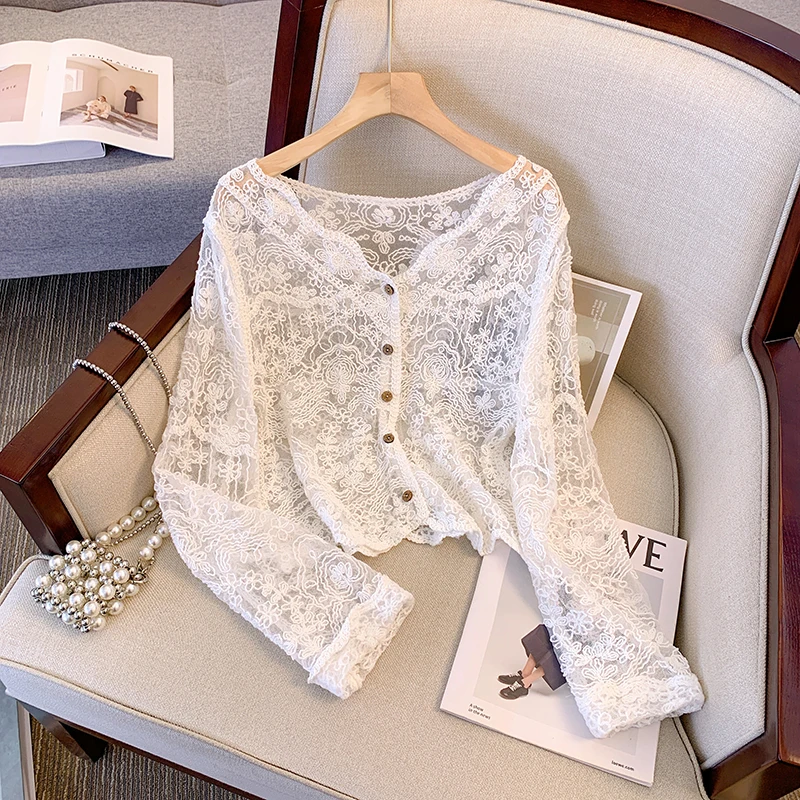 Sheer Crochet Top Long Sleeve Button Front V-Neck Open-knit Embroidery Blouse Women Summer Fairycore Cottagecore Outfit