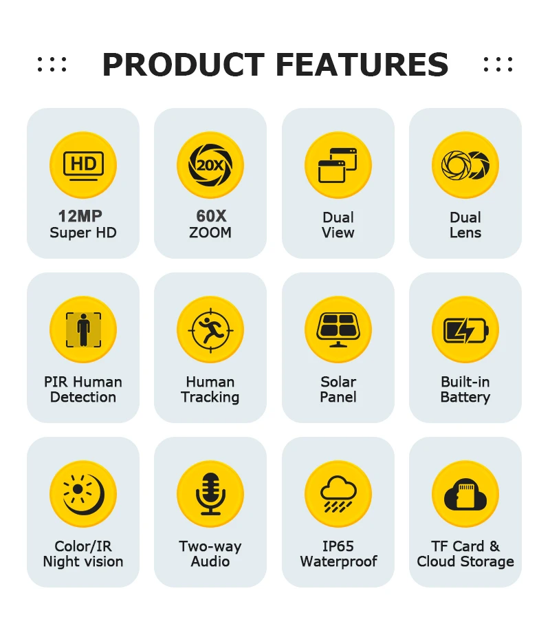 • Dual image sensors paired with ultra wide angle+60X optical zoom dual lenses, allowing for wide, far, and clear viewing