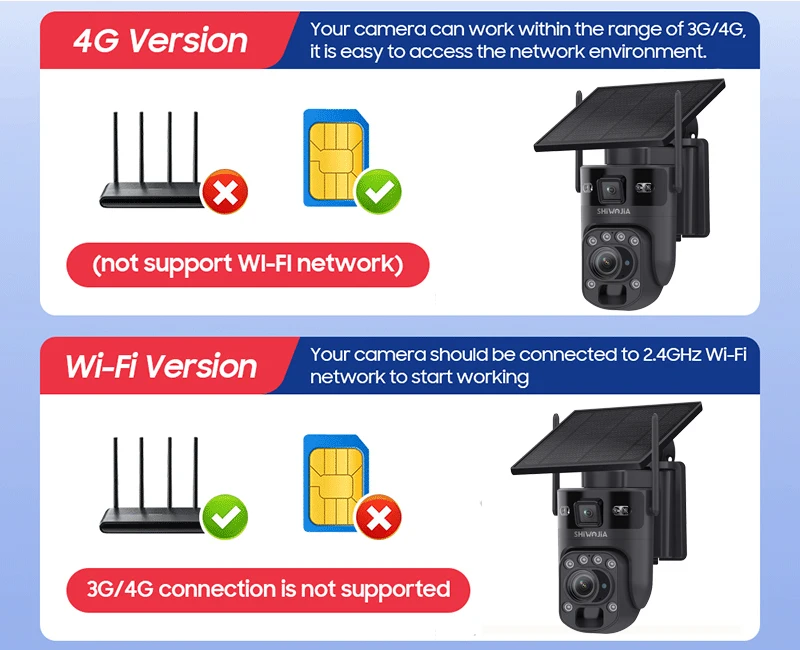 wifi camera only work with 2.4G wifi network ,not support 4g network and 4G sim card (NOT 5G)