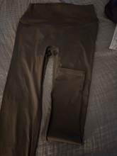 Color is slightly darker than pictured, but still a warm medium brown. Love these leggings! I followed the size chart. I’m usually a M, 30 in waist, 40 hips, and got these in XL. They’re a very low compression fit, and are squat proof for me!