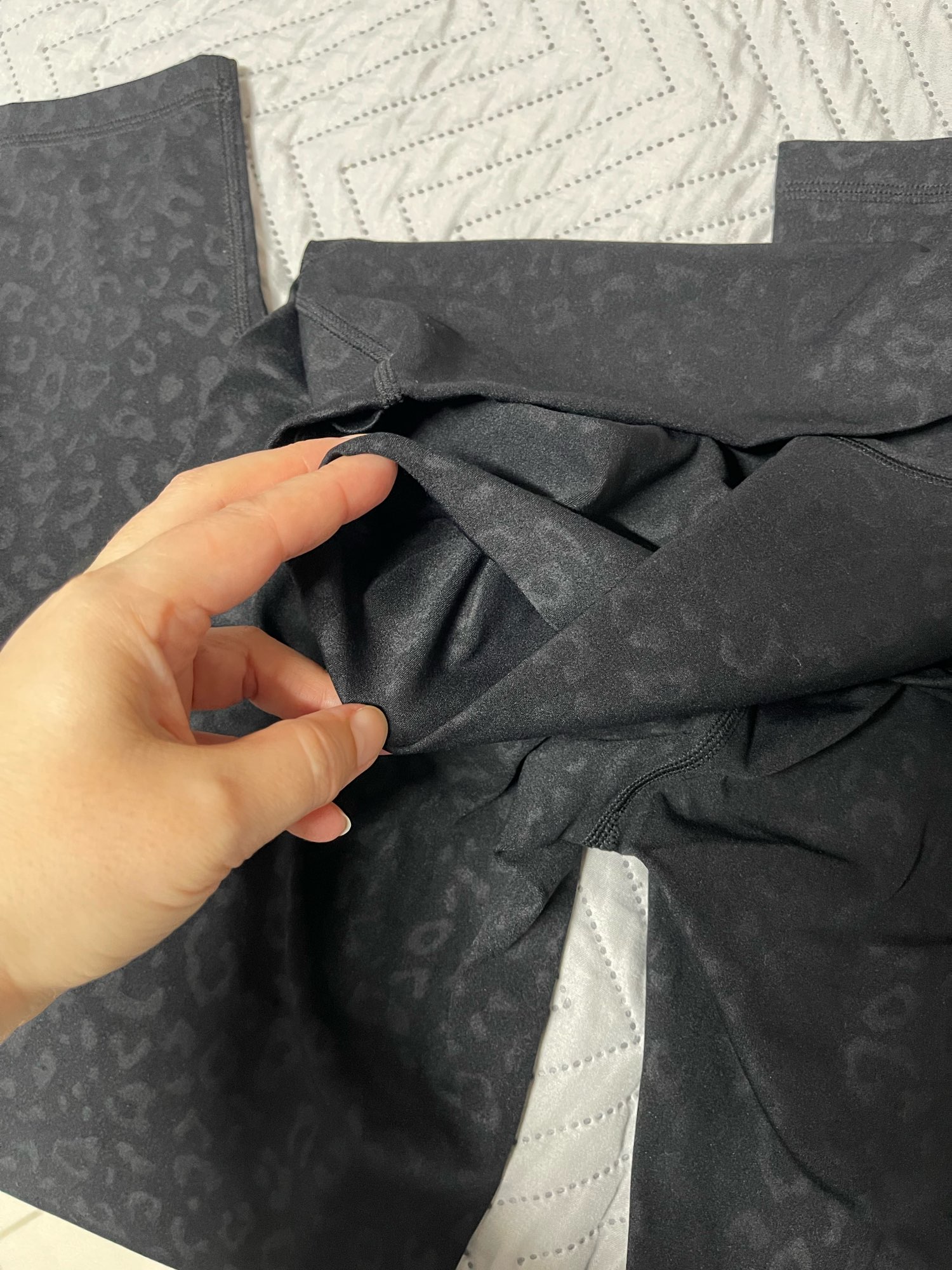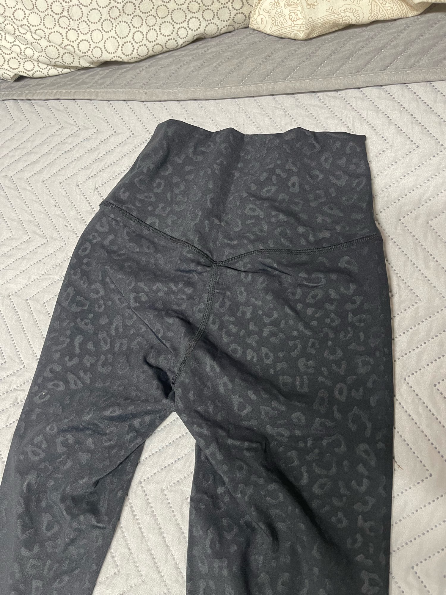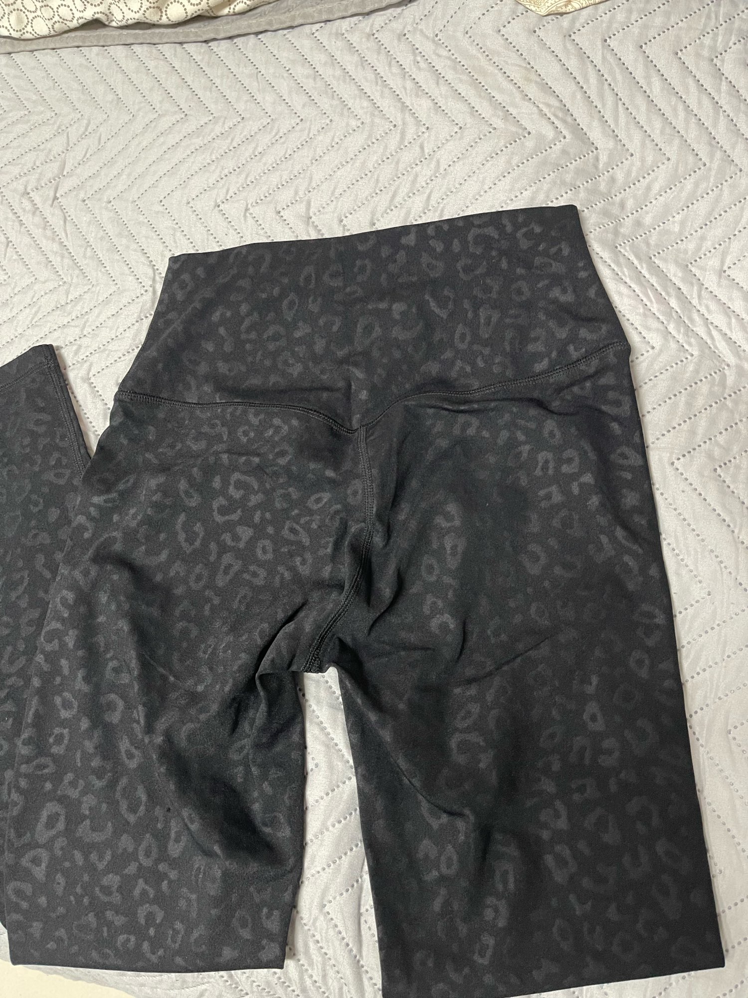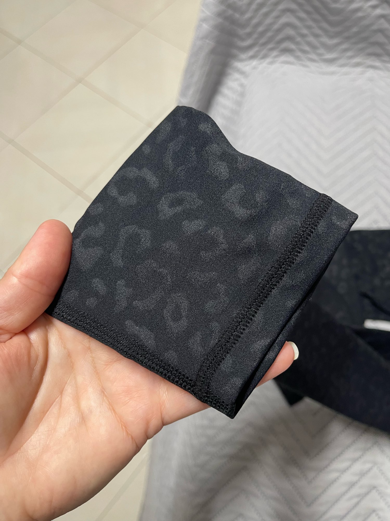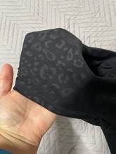 Arrived in 7 days. Despite being black they are super soft and stretchy that’s why I bought first time size L and now a size M . Usually the darker the color, more stiff they are but this one in leopard print is super soft, thin and stretchy. I have 90% of these colors. Totally worth it