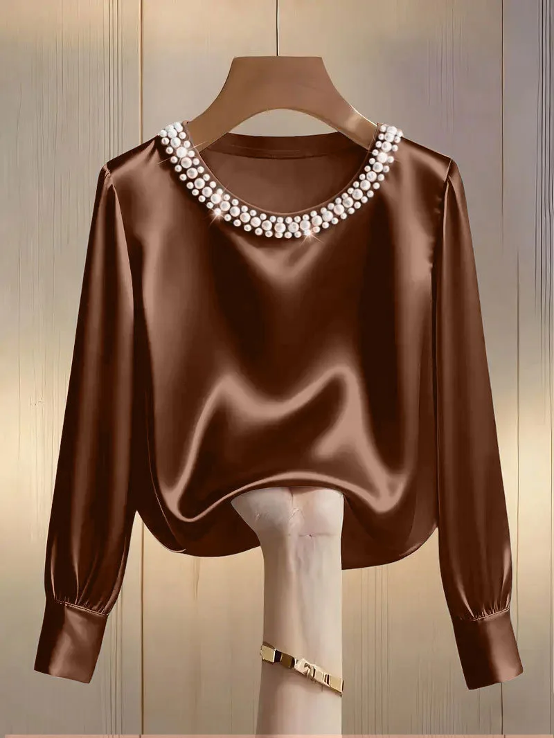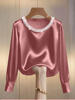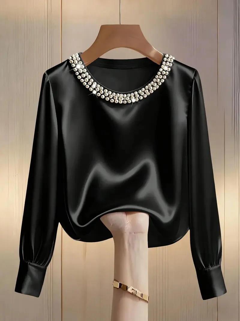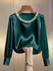 Spring and summer French high-end pearl round neck satin shirt top for women