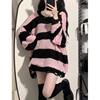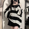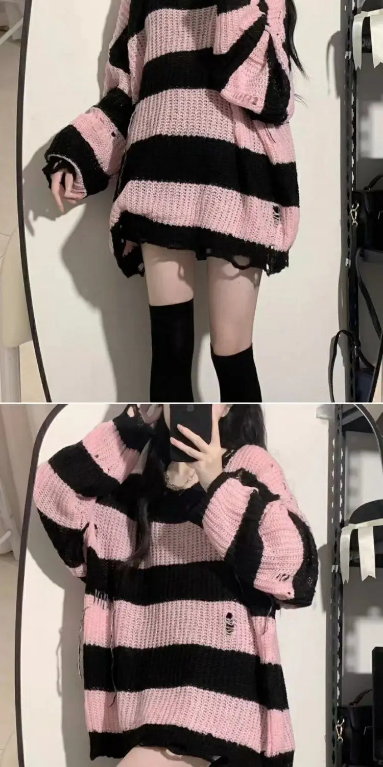 Spring Autumn New Black Pink Sweater Women’s Spring and Autumn Medium Long Loose Lazy Style Striped Knitted Sweater Top