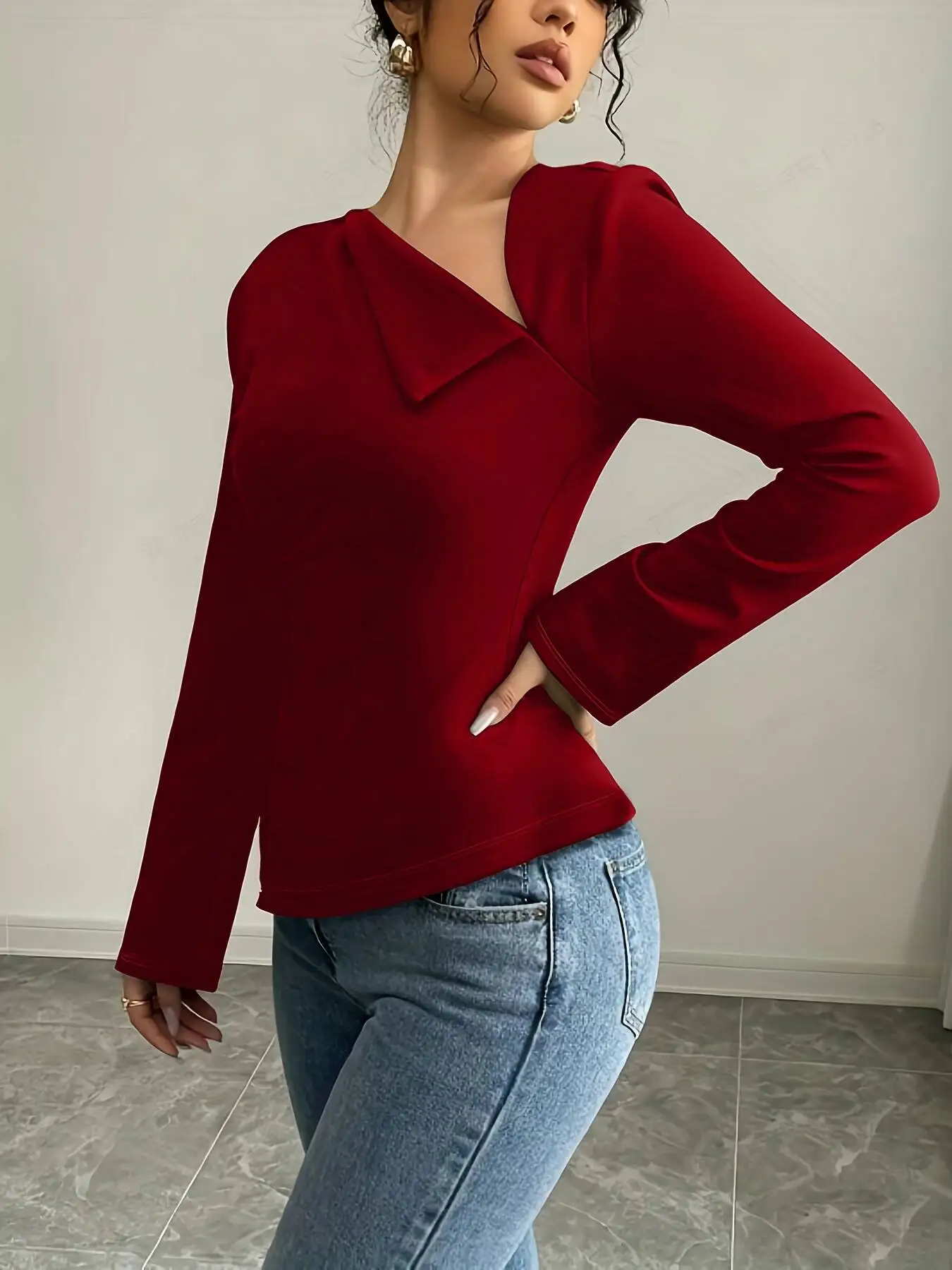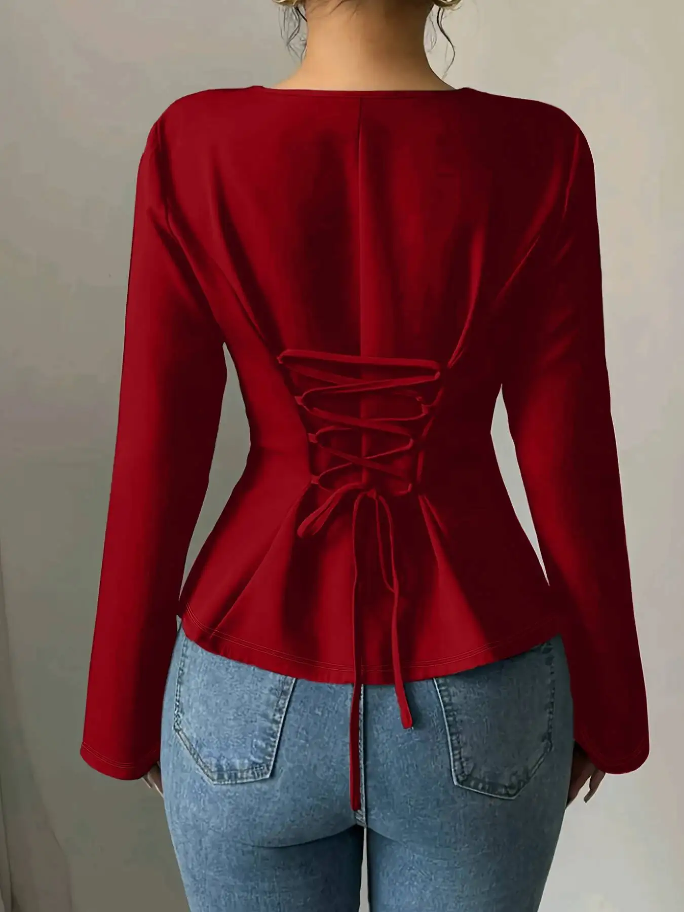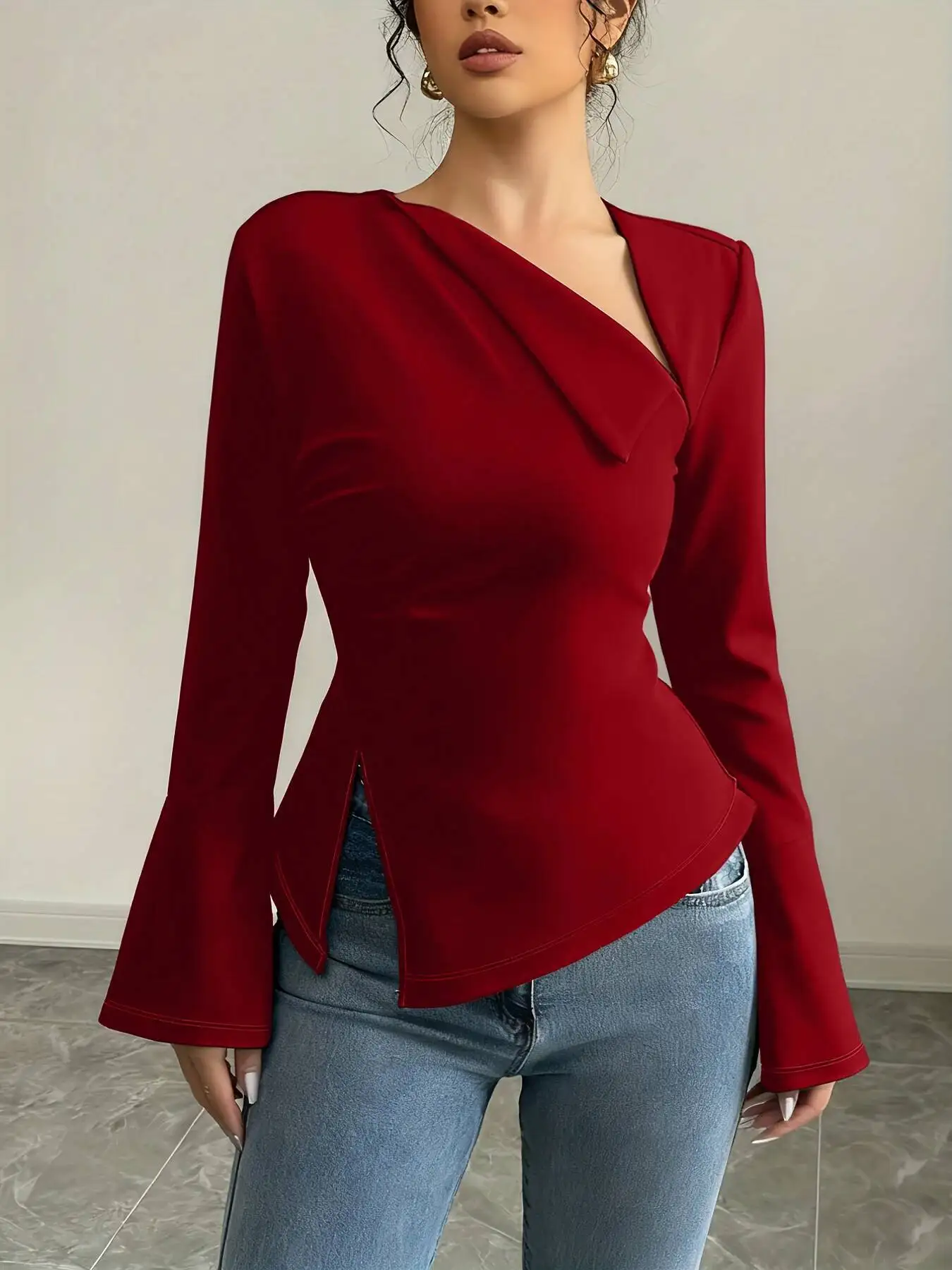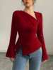 Spring Summer Women’s Blouse Red Asymmetrical Long Bell Sleeve Side Slit Back Tie Slim Fit Elegant Daily Casual Dating Top