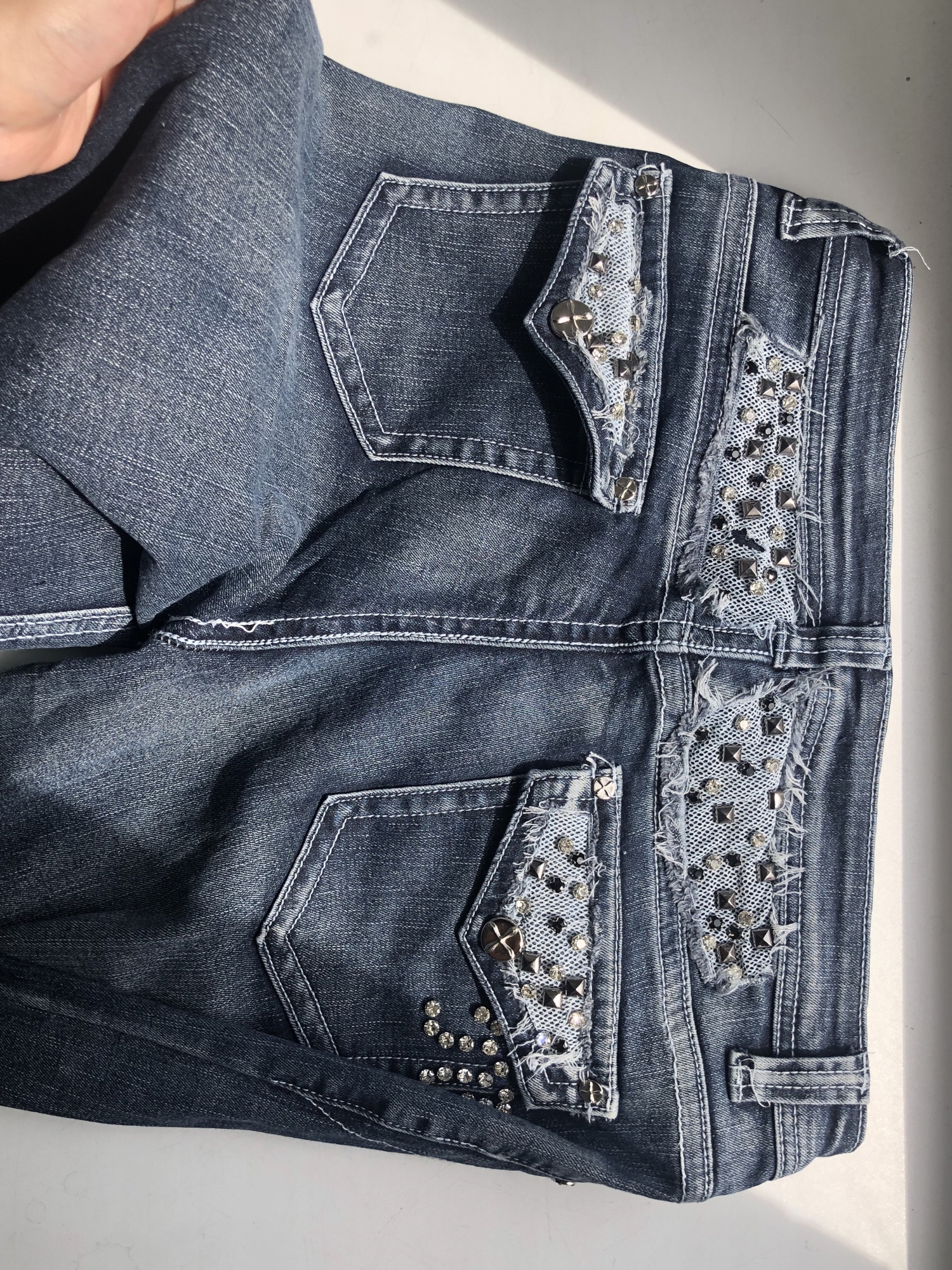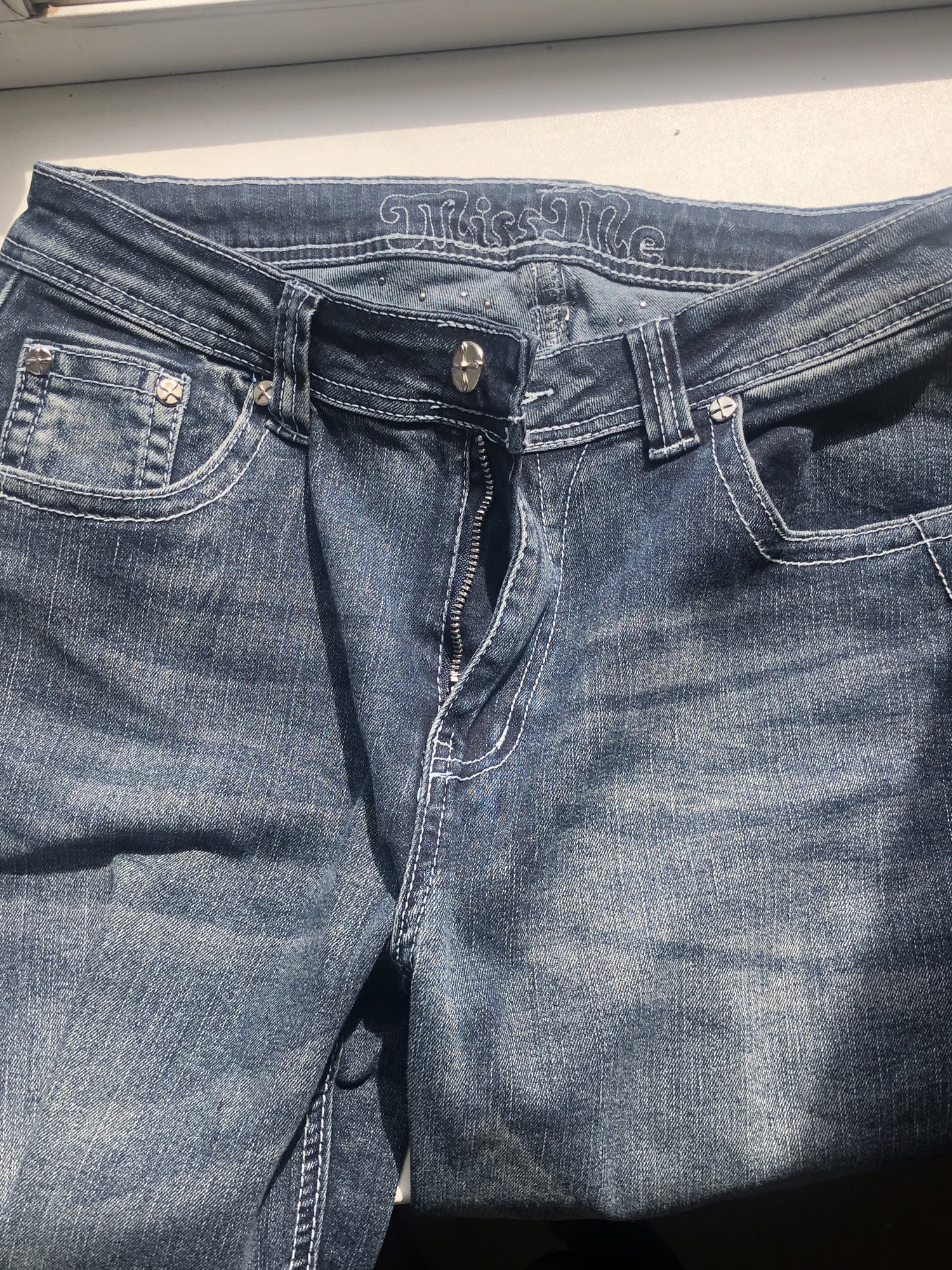 Love these jeans! The rhinestones and "M" logo look cool. Fit is good, denim feels sturdy. Great for a stylish vibe.