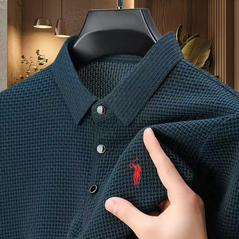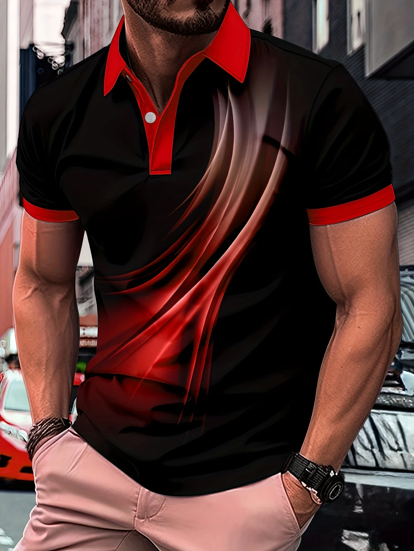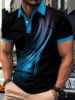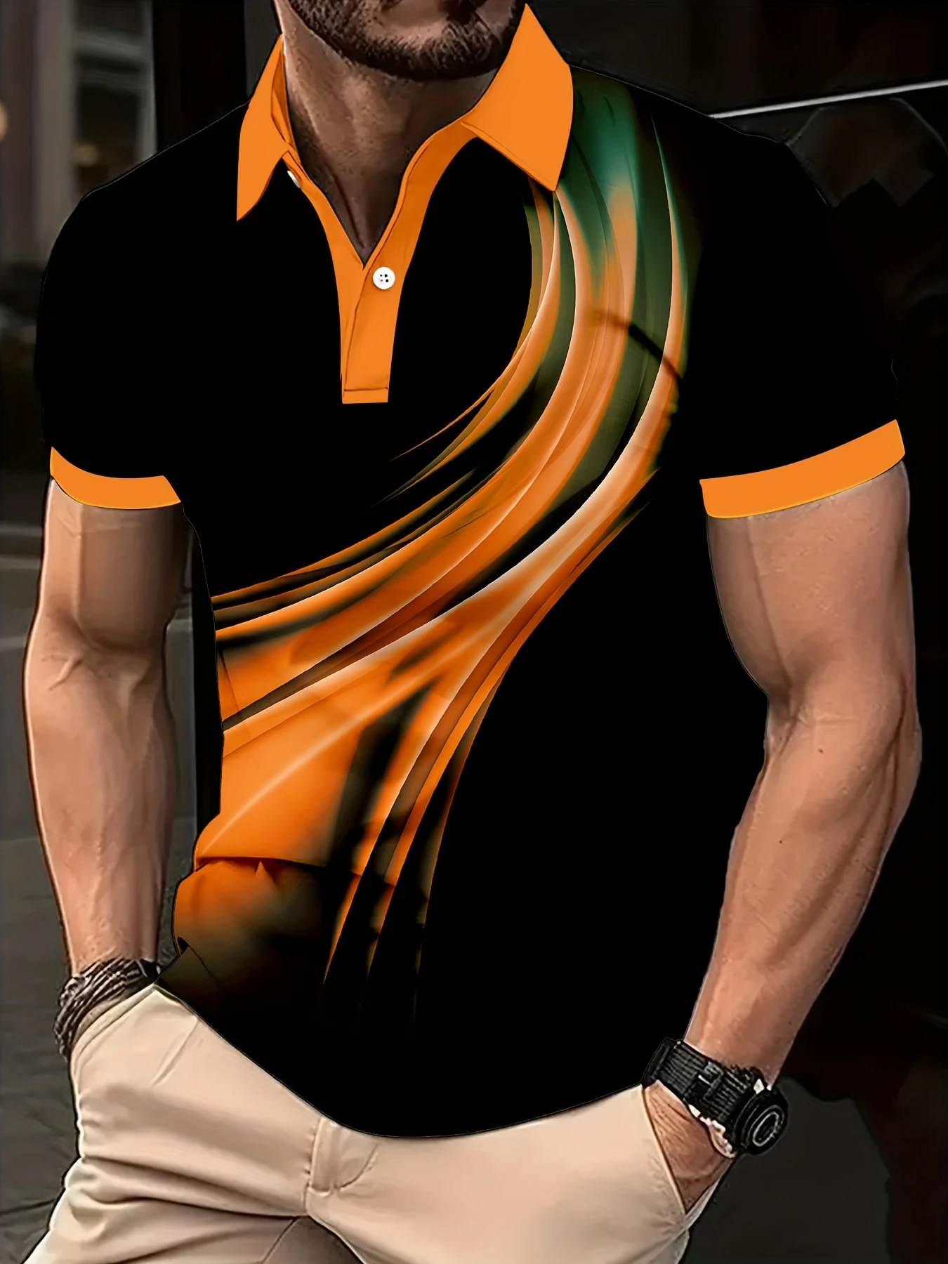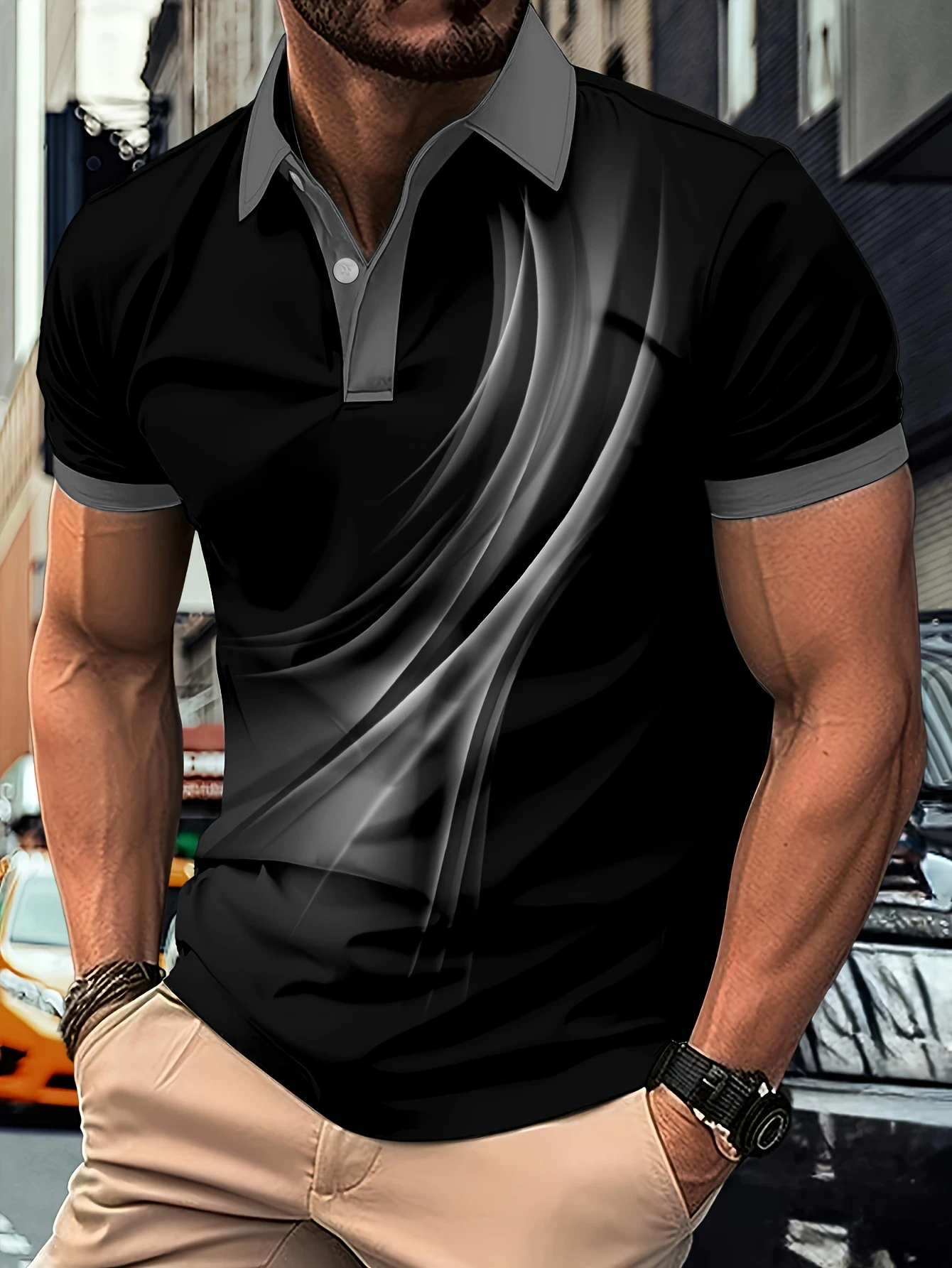 Stylish Men Black Blue Wave Print Polo Shirt Short Sleeve Contrast Collar Casual Business Streetwear Golf Tops