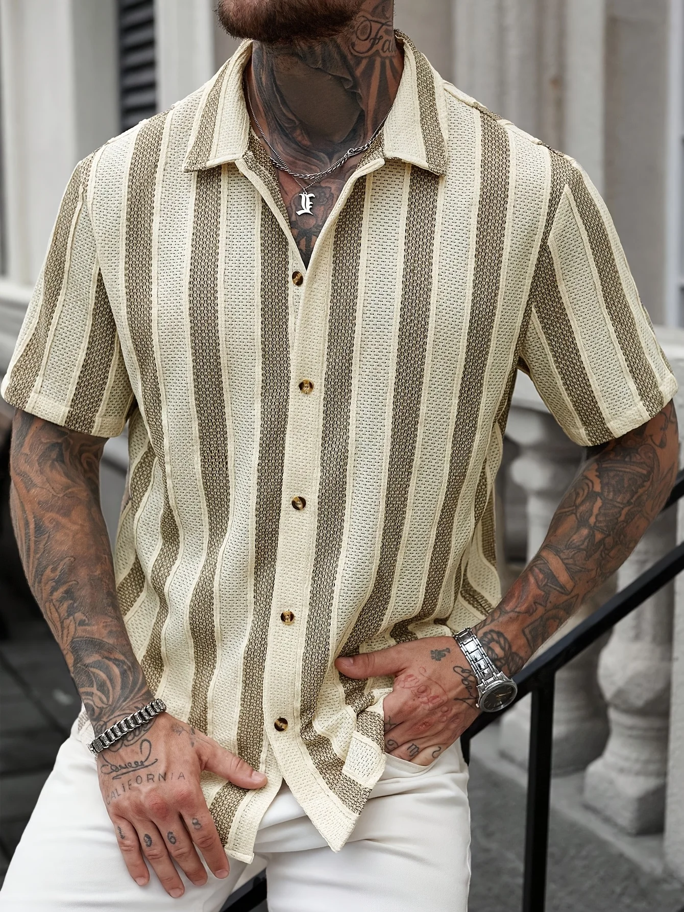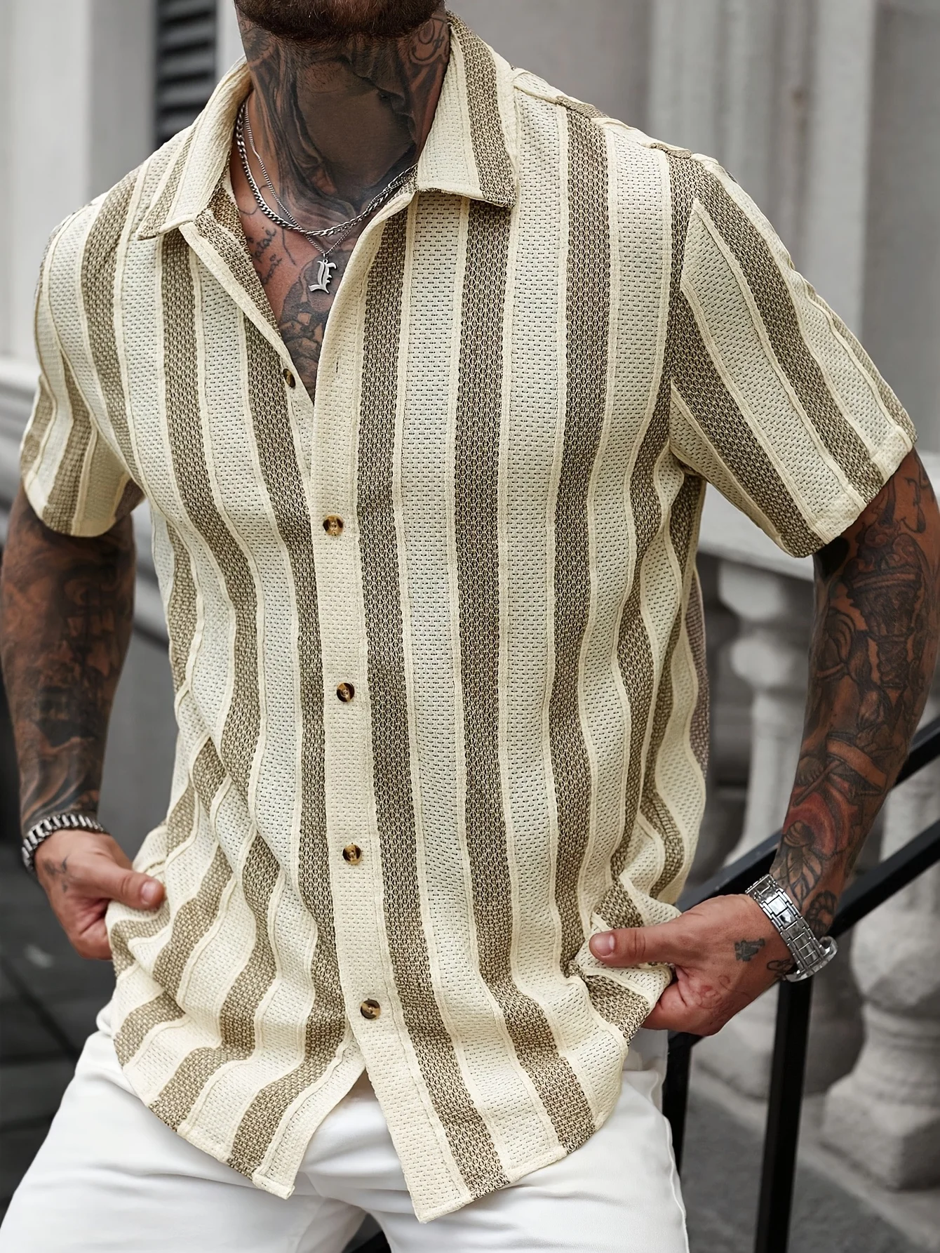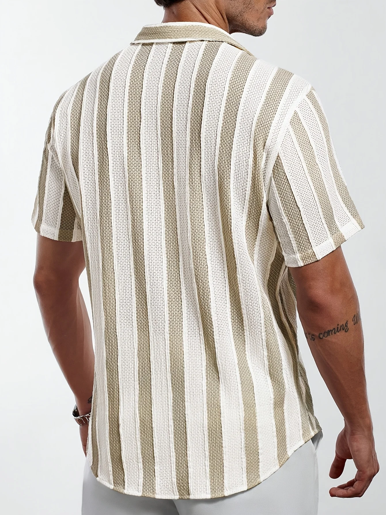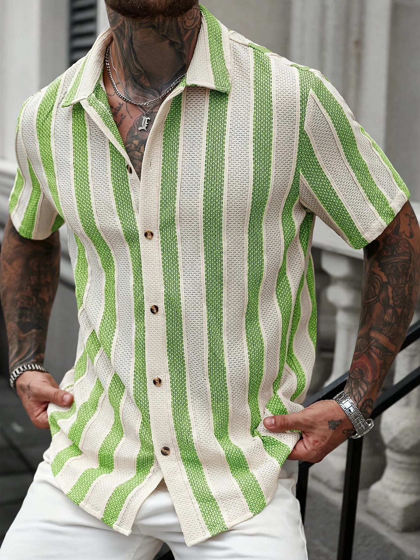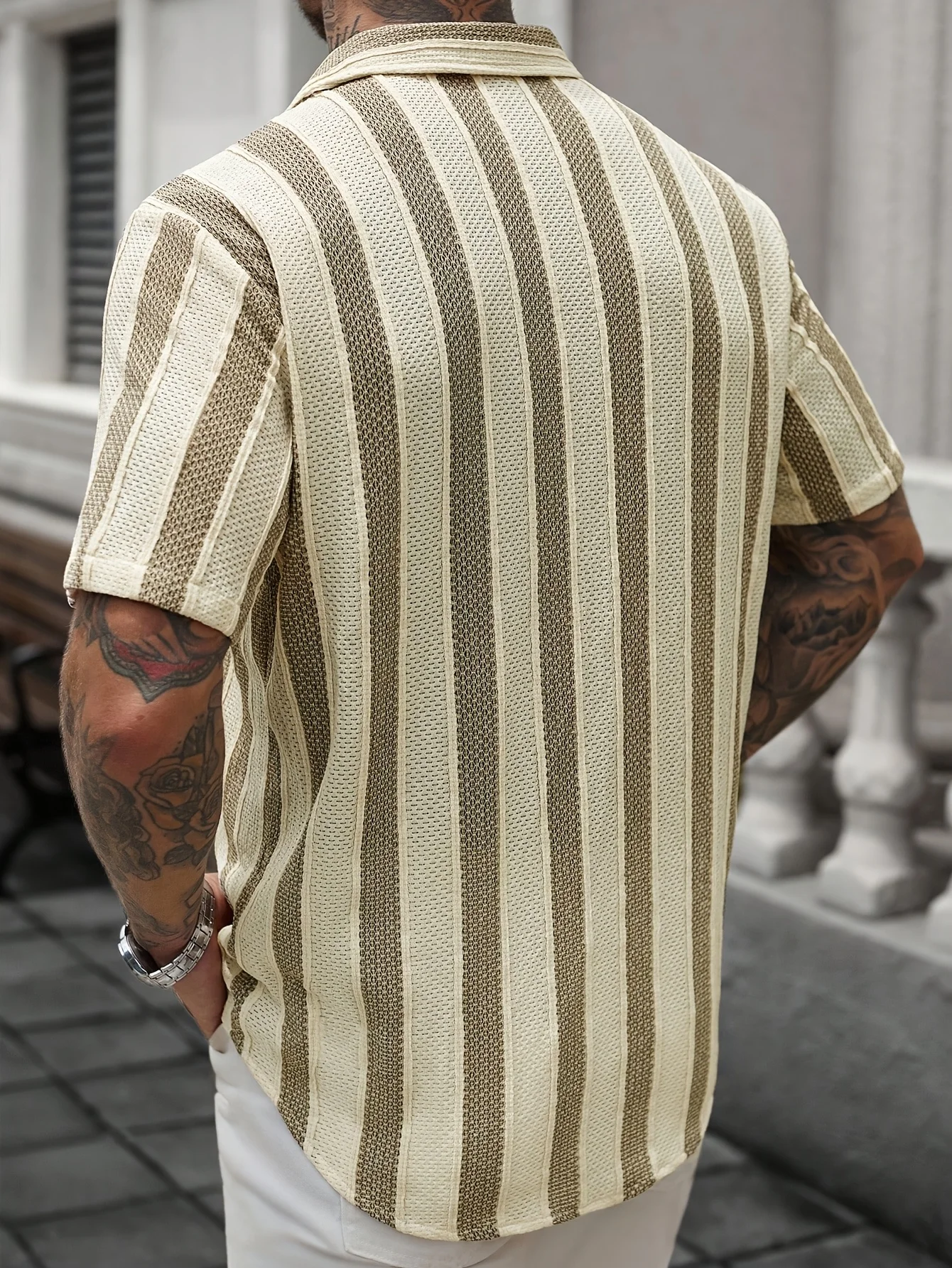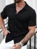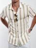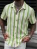 Summer contrast-color striped Polo-neck men’s beach casual shirt, fashionable short-sleeved collar shirt, retro open-weave loose