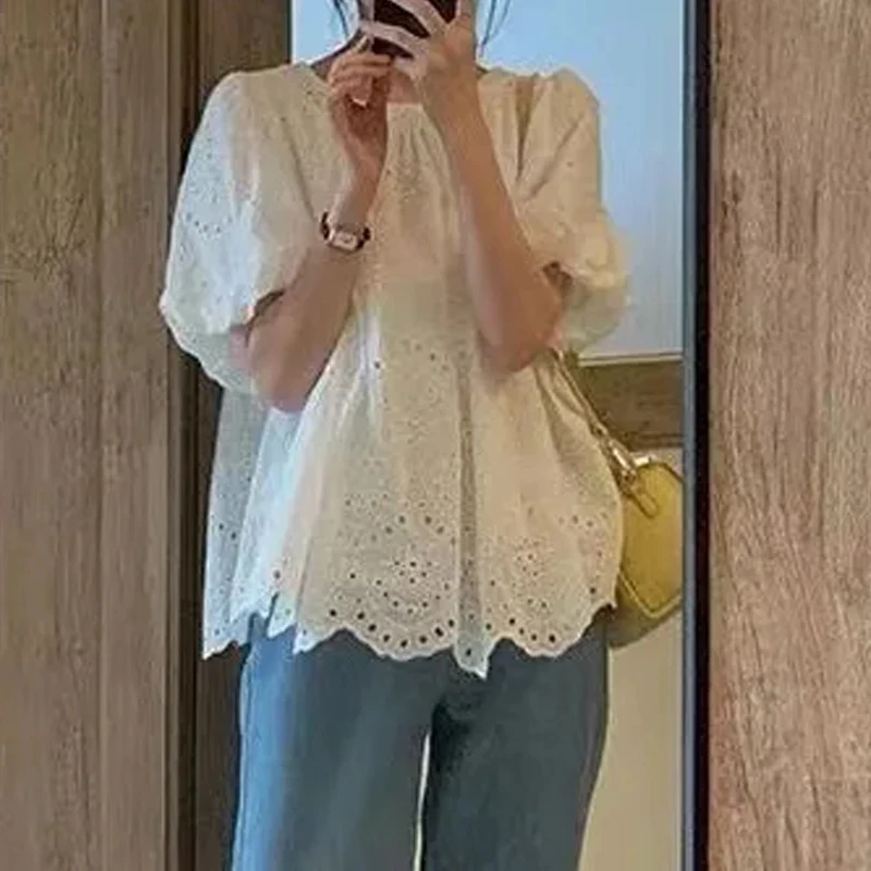 Summer French Style Embroidery Hollow Out Shirt New White Lace Blouse for Women Short Puff Sleeve Tops Round Collar Clothes 930