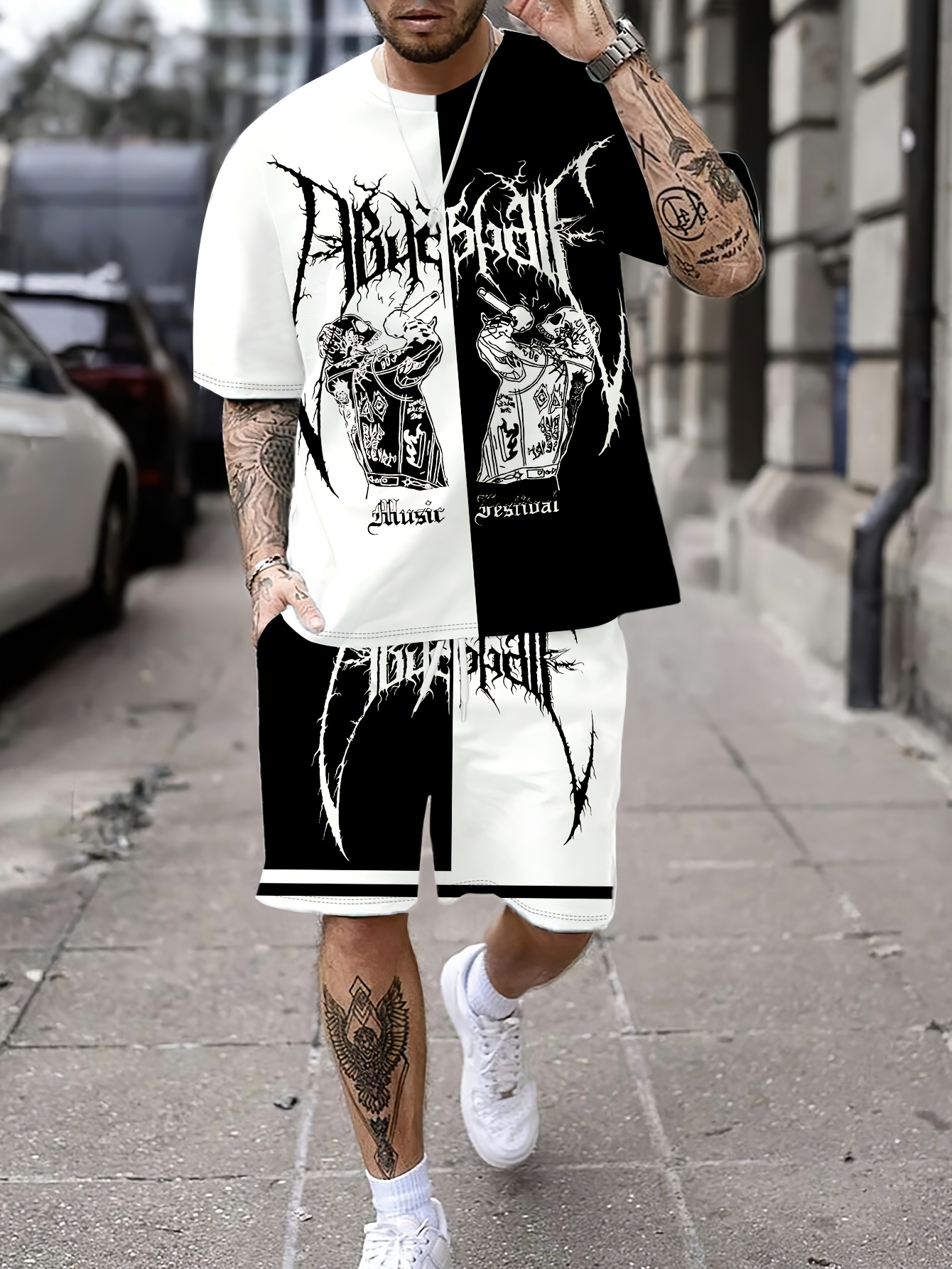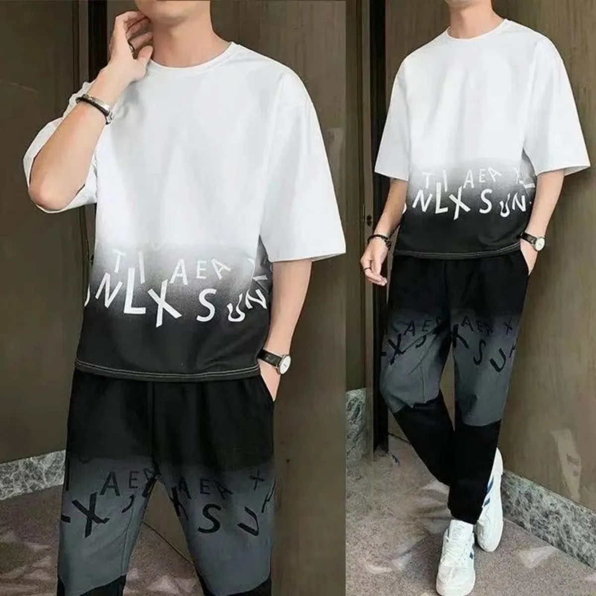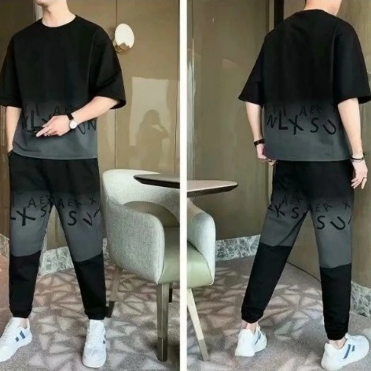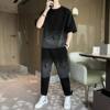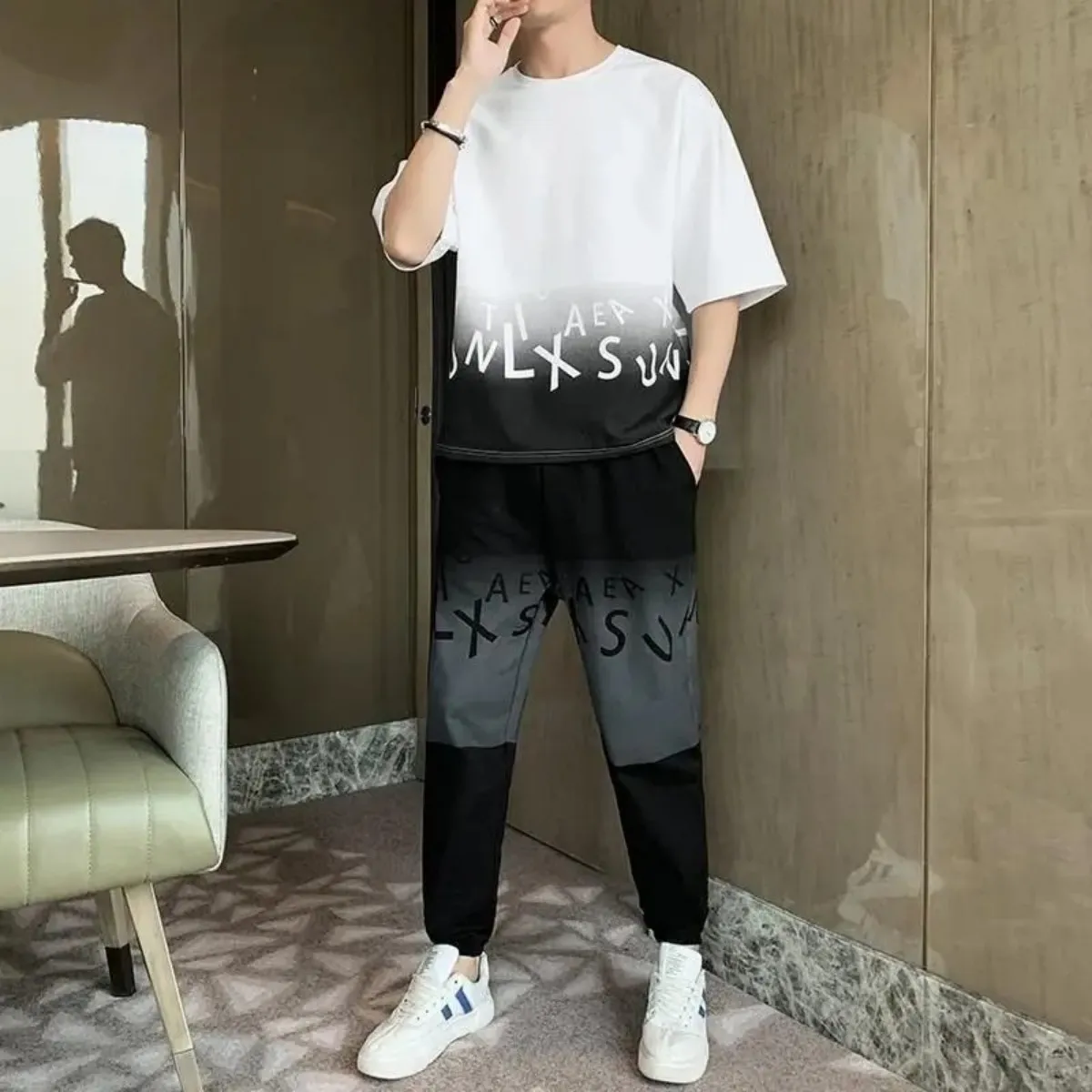 Summer men’s gradient letter print pattern breathable round neck T-shirt pants set outdoor casual two-piece set