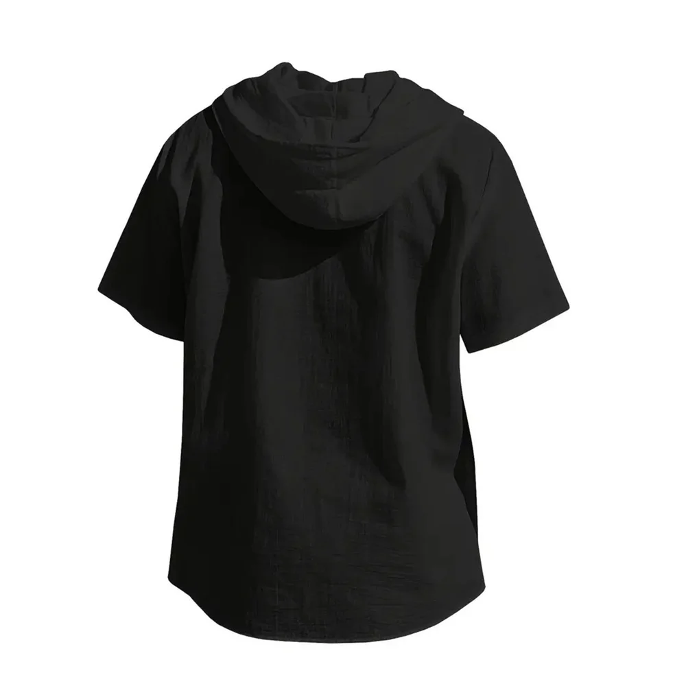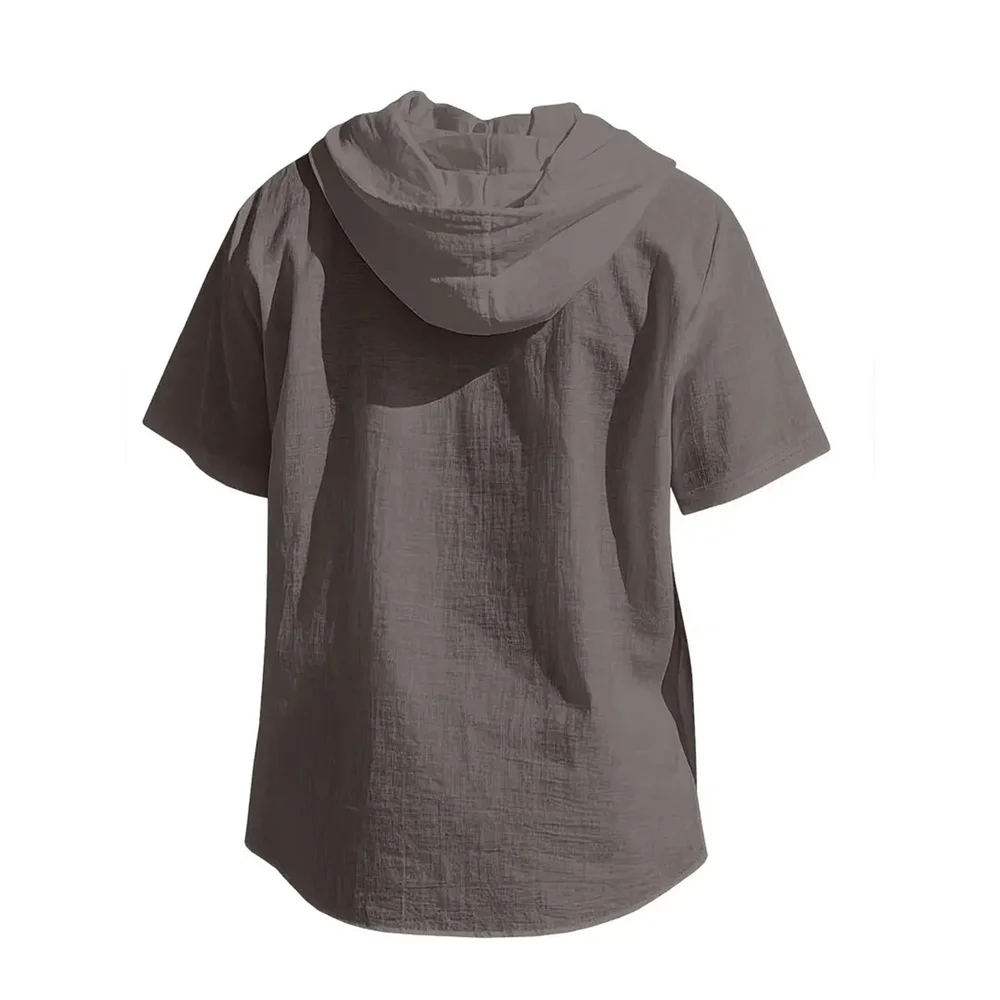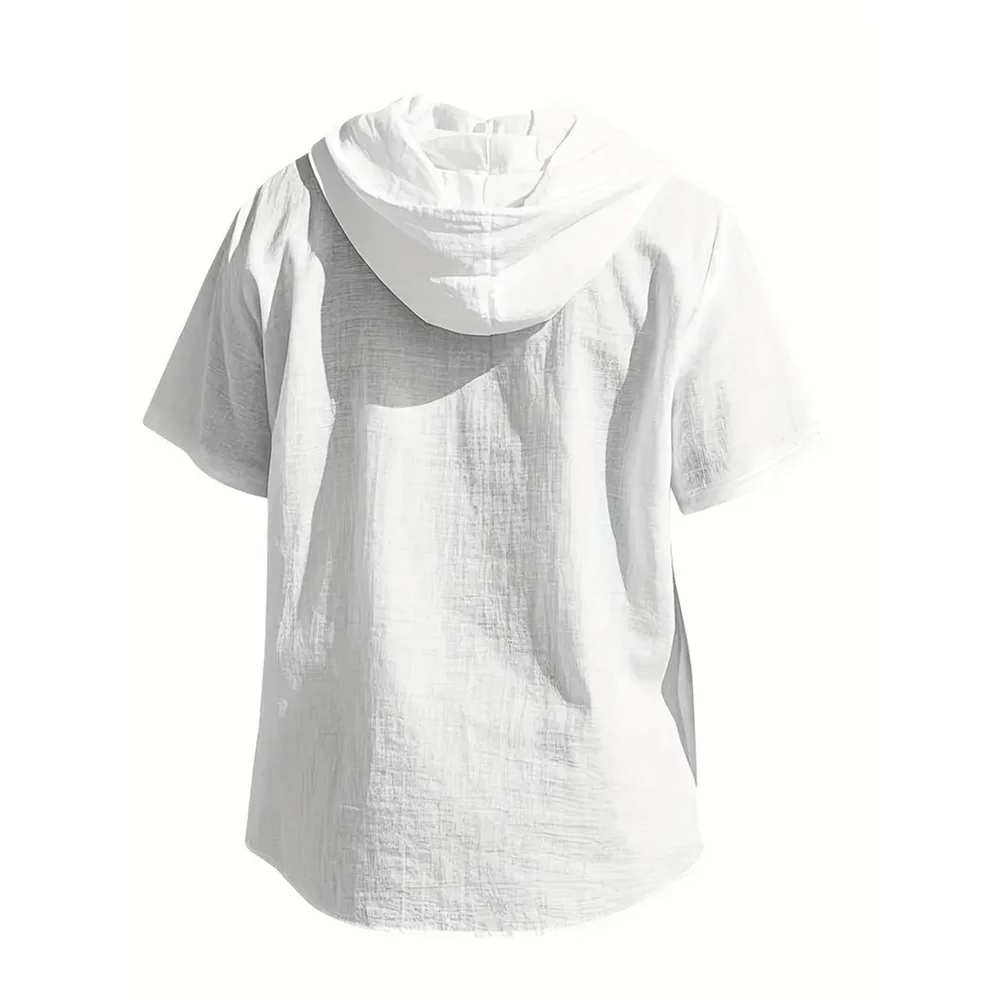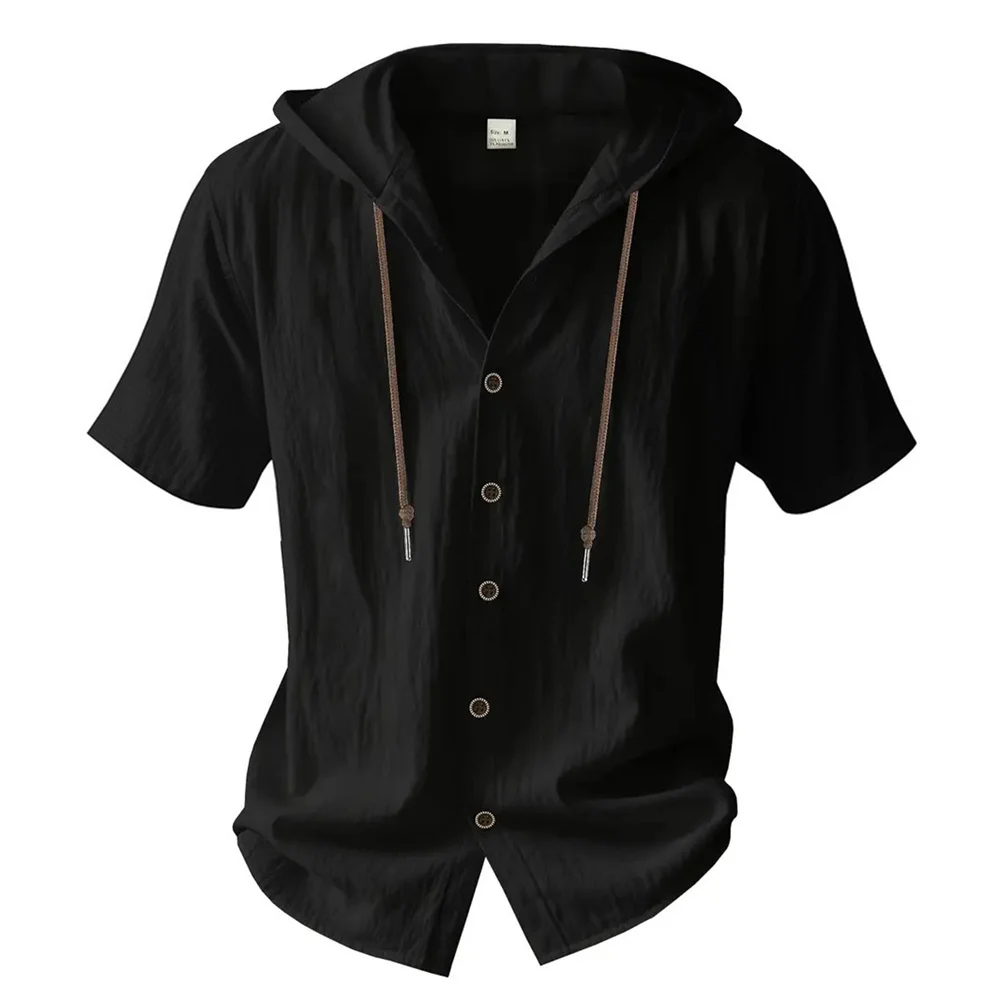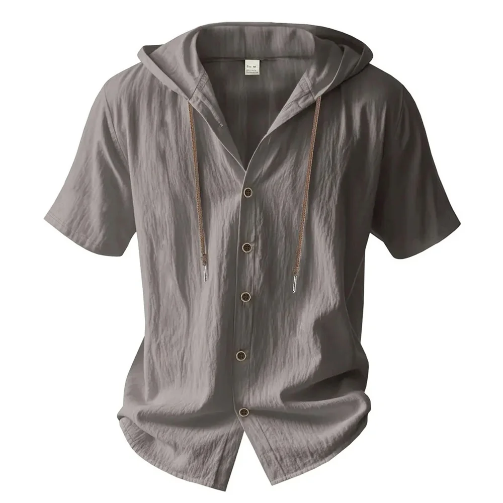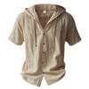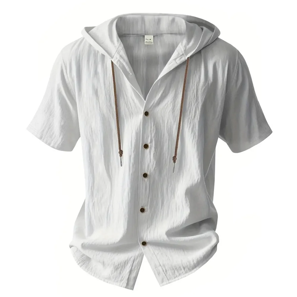 Summer Men’s Hooded Cotton Linen Shirt Solid Color Breathable Lightweight Short Sleeve Drawstring Design Tees Male Casual Tops