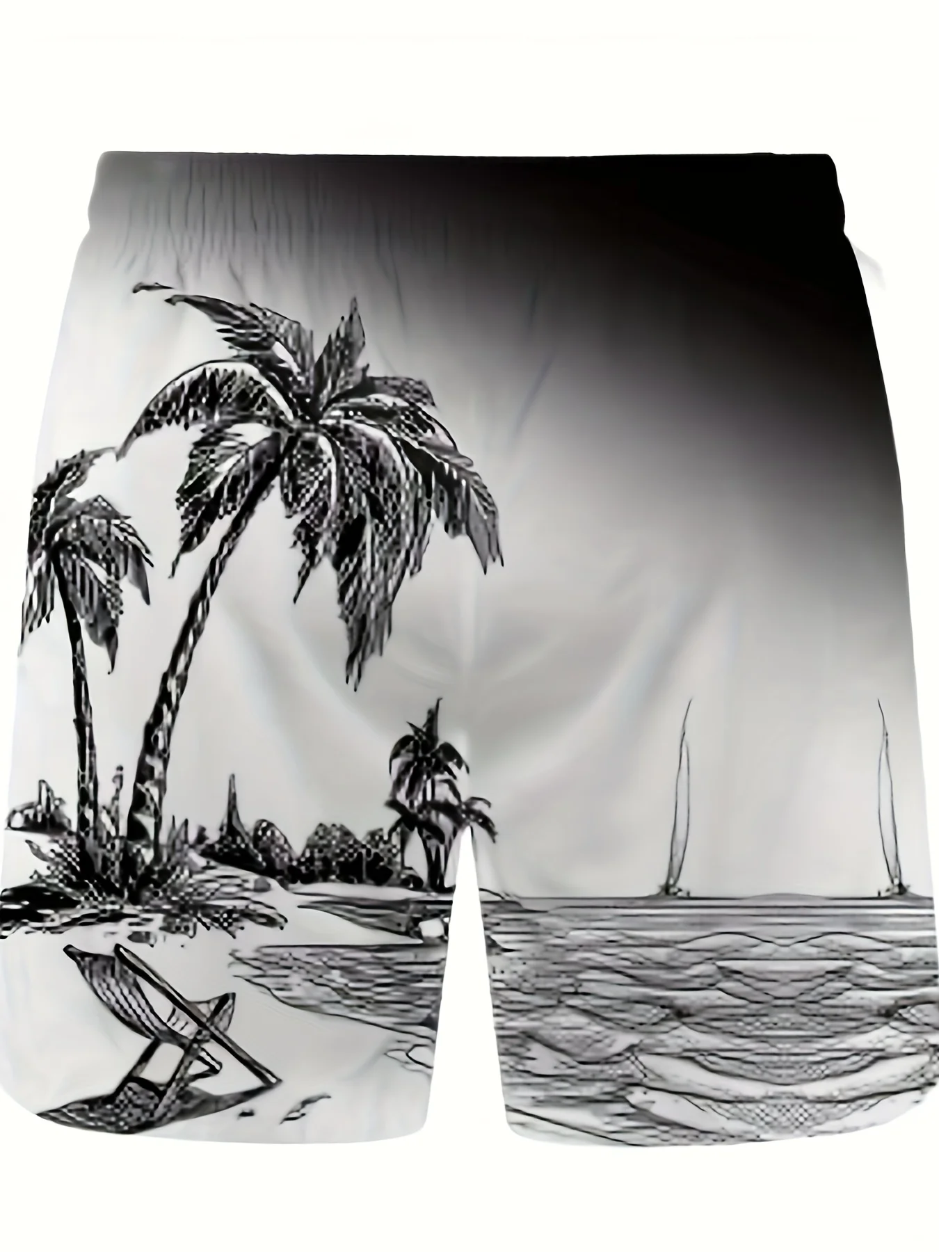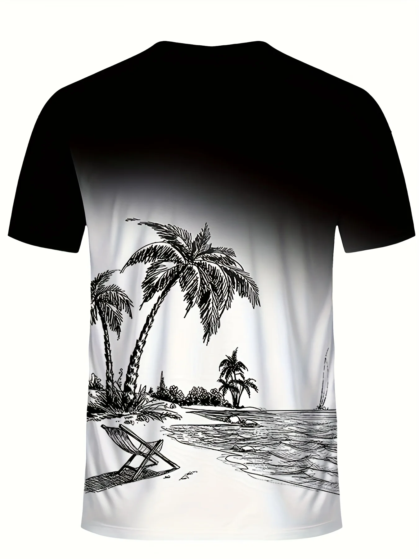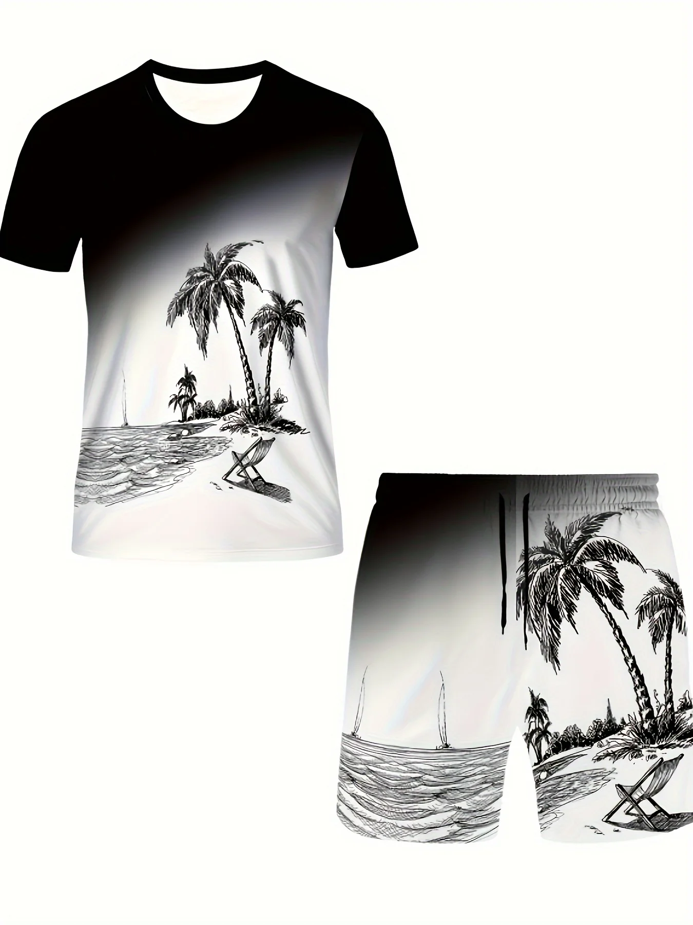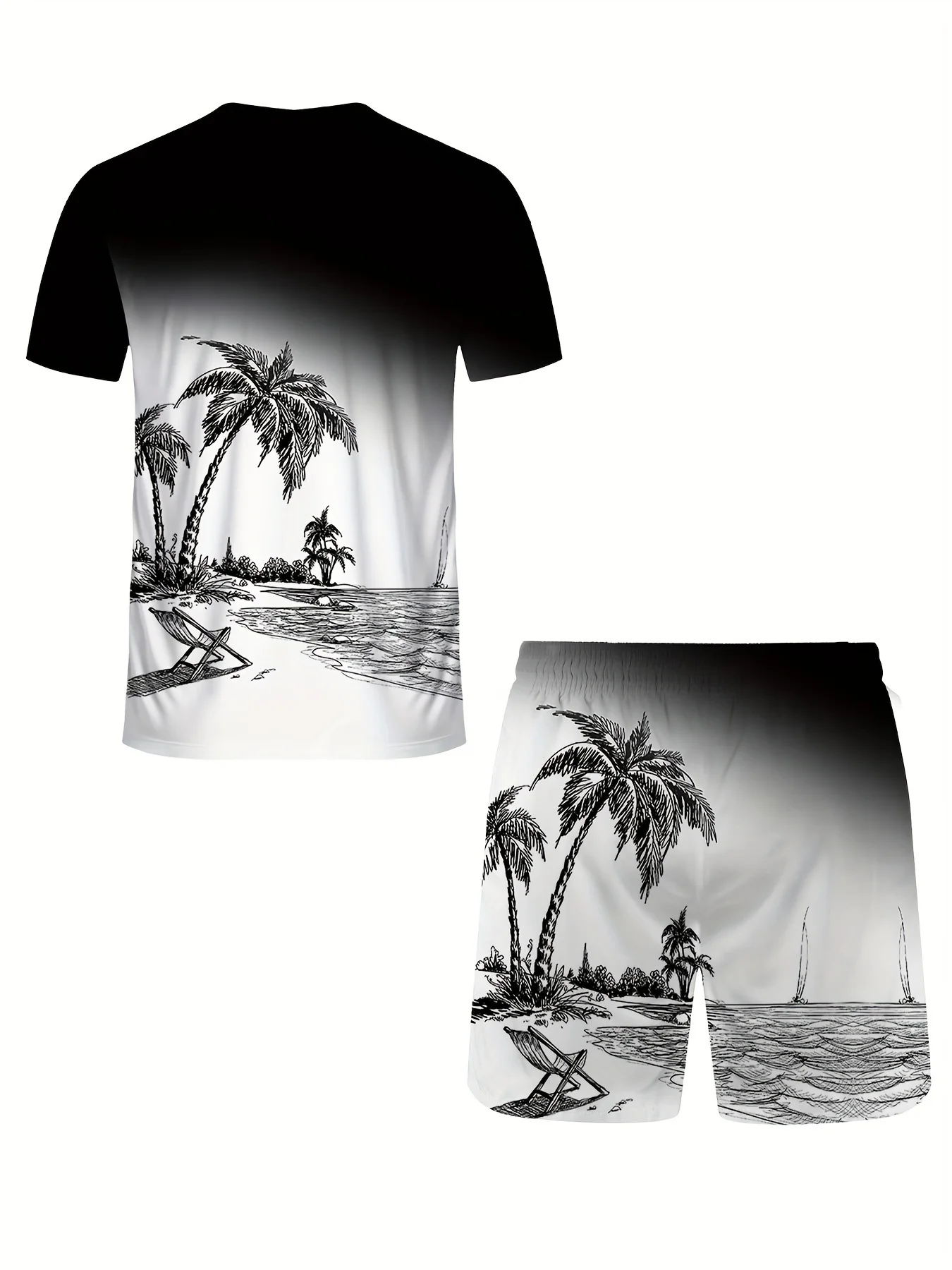 Summer series men’s gradient coconut tree print breathable round neck T-shirt shorts set outdoor two-piece set
