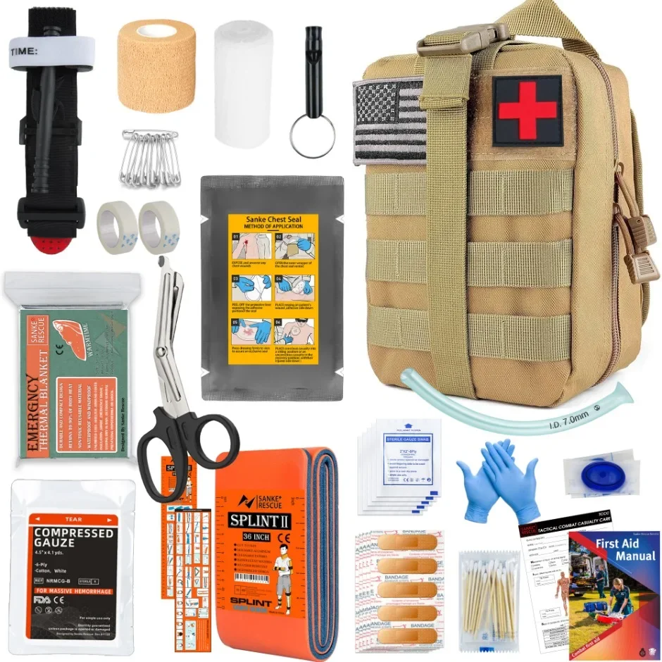 Sanke Rescue emergency kit contains the most popular survival accessories:Tourniquet,chest ,compression gauze , Survival Bracelet,Whistle Emergency Blanket, comprehensive first aid kit, etc.