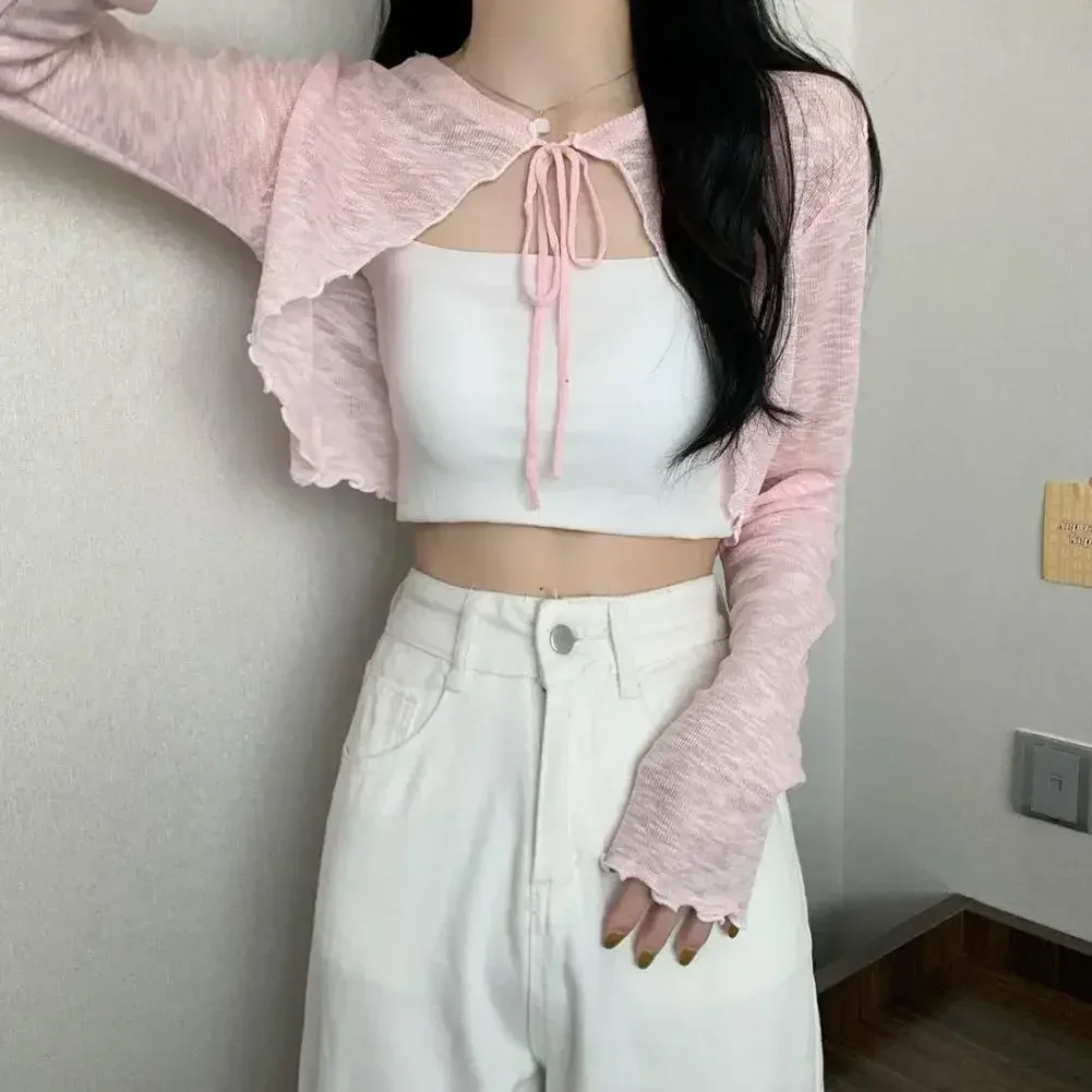 Thin Sunscreen Cardigan Lace-up Knitwear Tops Summer Women Korean Style Long Sleeve Short Coat Casual Sun Protected Jackets