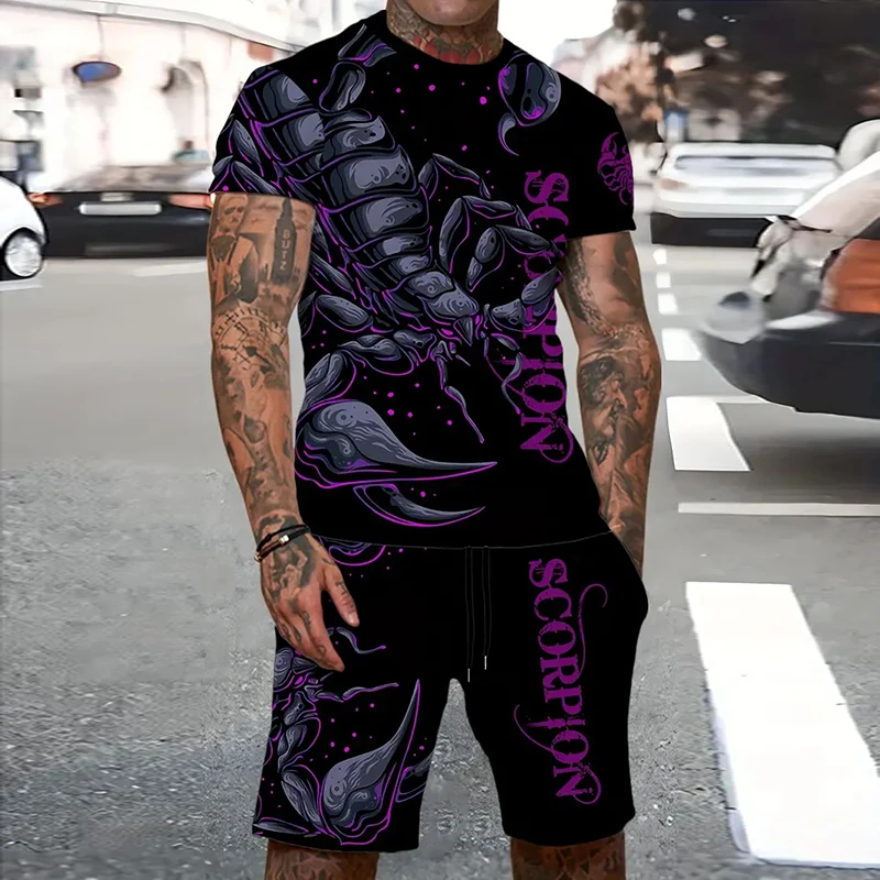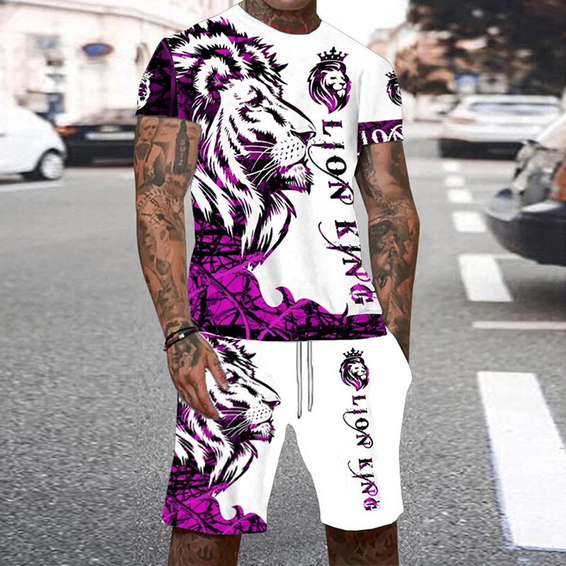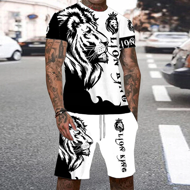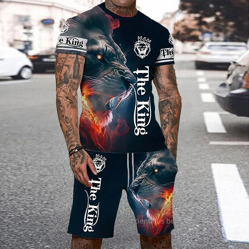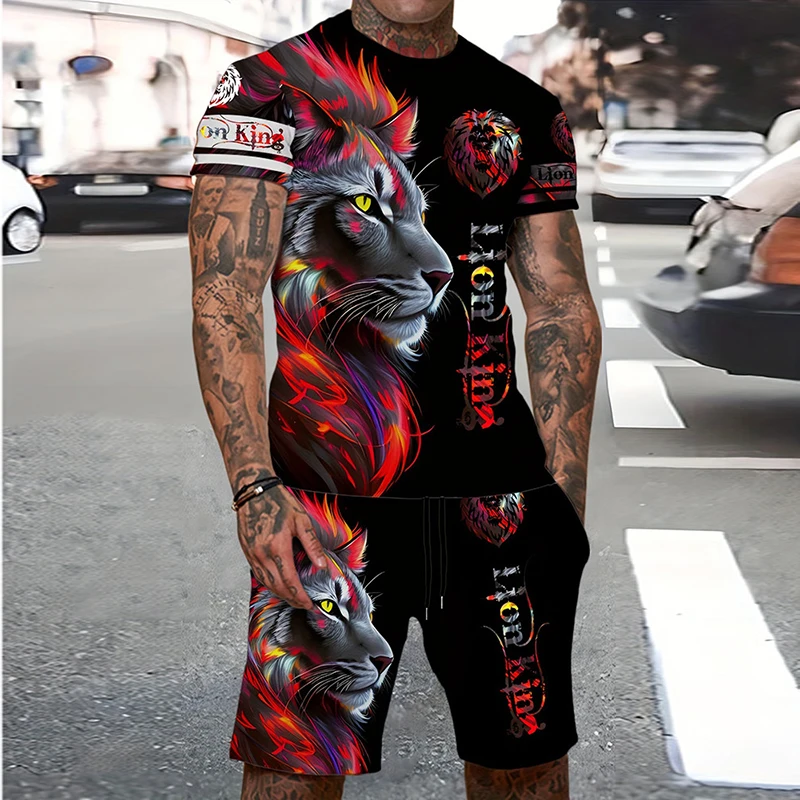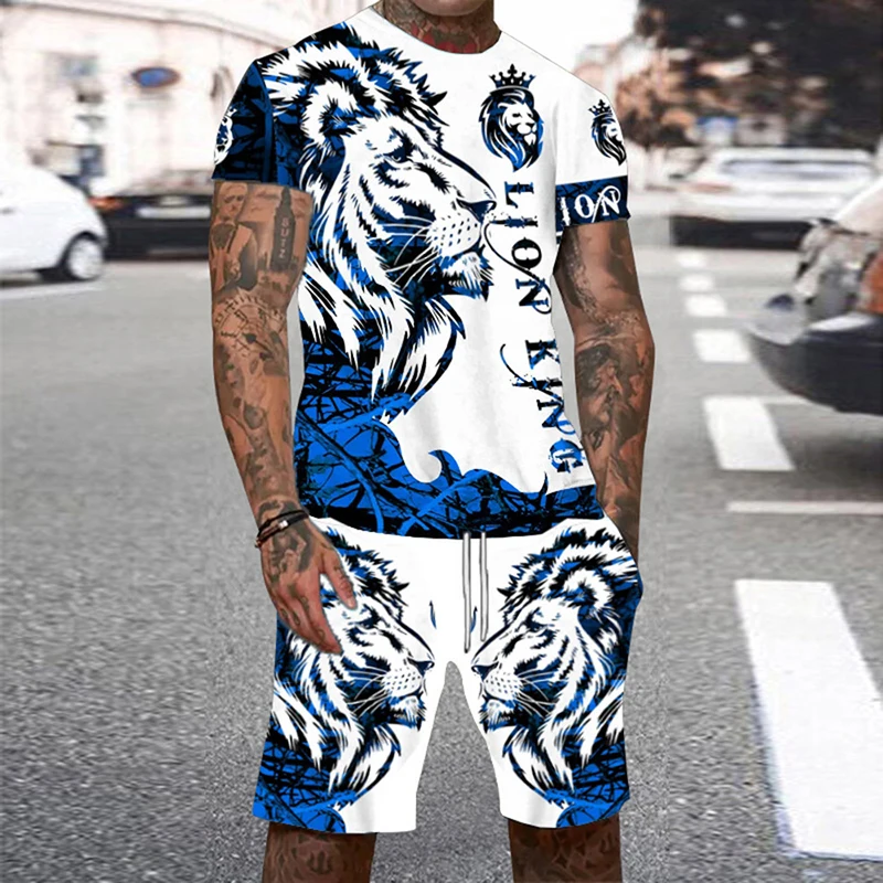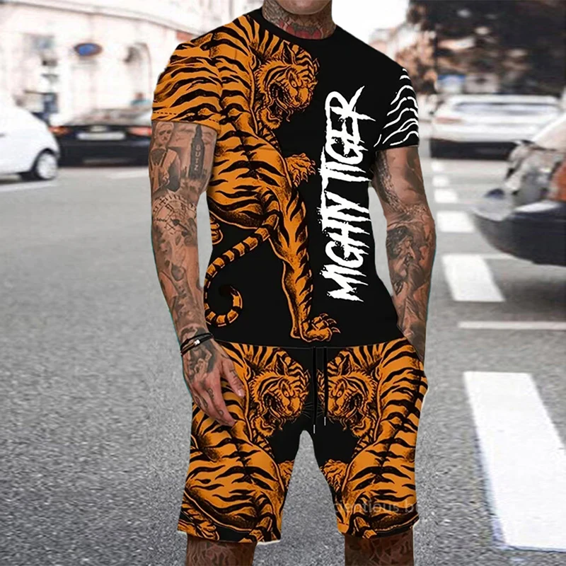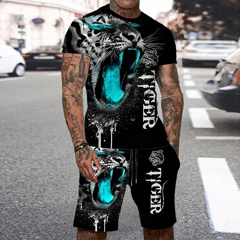 Tiger 3D Print Sport Moisture-wicking Breathable Men Round-neck T-shirt Shorts Outdoor Fitness Running Casual Street Fashion Set