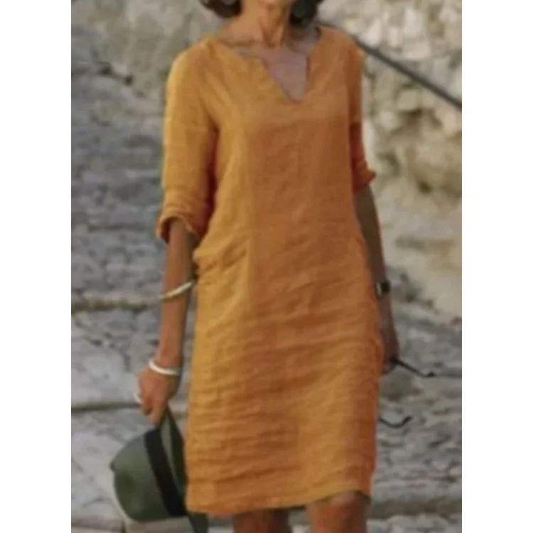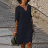 Vintage Women Solid Mini Dress Summer Fashion V-neck Three Quater Sleeve Cotton Linen Dress Ladies Casual Holiday Vestidos