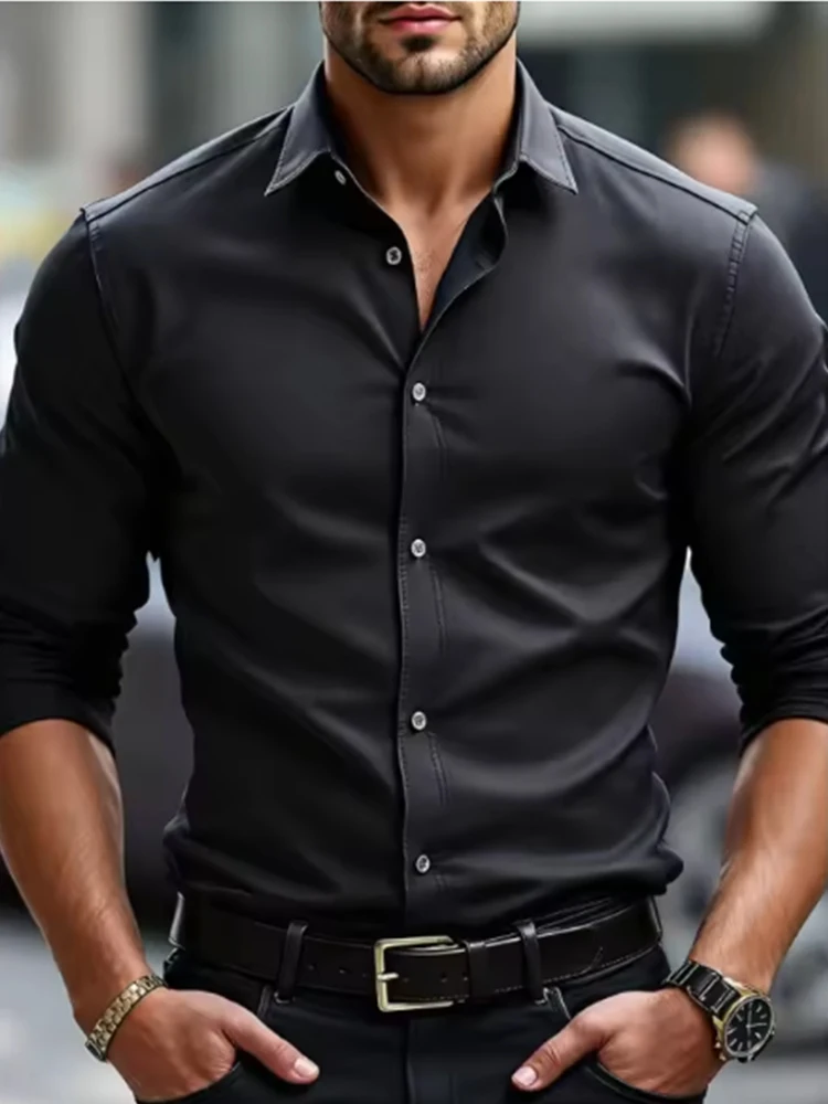 White men’s Dress shirt without ironing, business casual, slim and slim black shirt, solid color, fashionable and high-quality