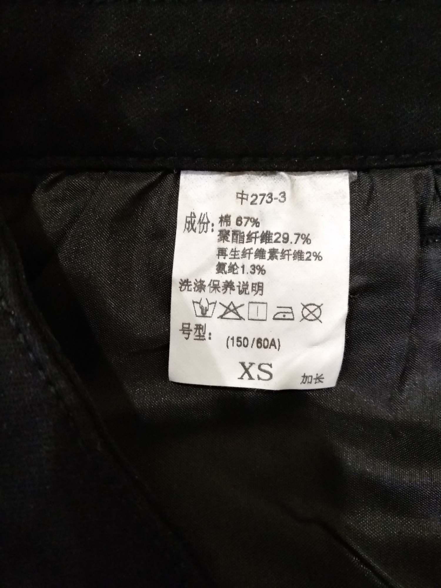belle qualité. semble infroissable. je suppose genre de polyester . belle coupe. pour 1m64 parfait pour longueur de jambes mais un peu grand, pas taille chinoise, il m aurait fallu xs, mais avec une ceinture cela ira . (ai l'habitude des slims)