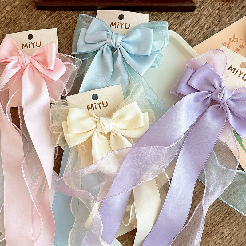 Women Elegant Lace Bow Ribbon Hair Clips Solid Color Satin Заколка Бант Girls Korean Hairpins Party Headdress Hair Accessories