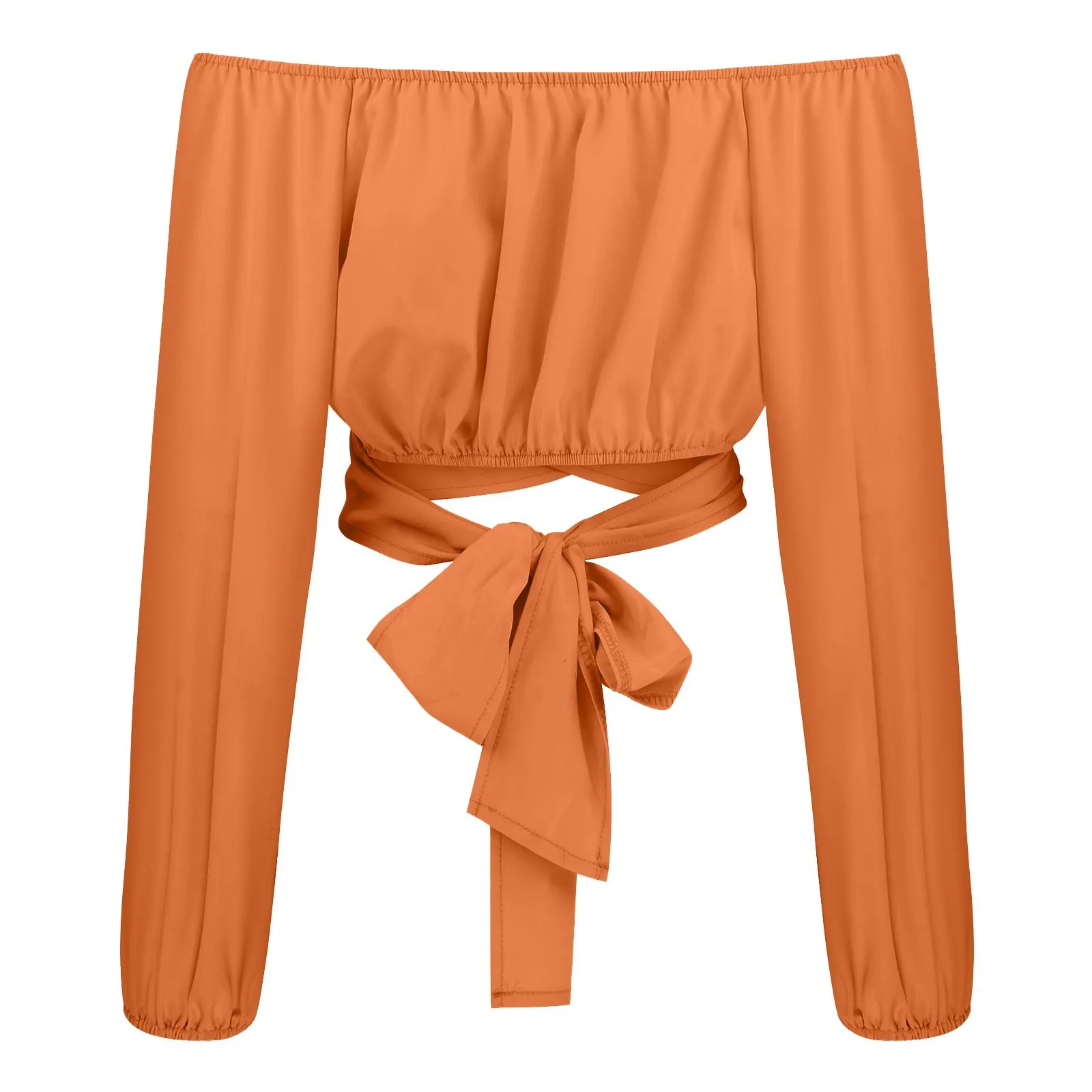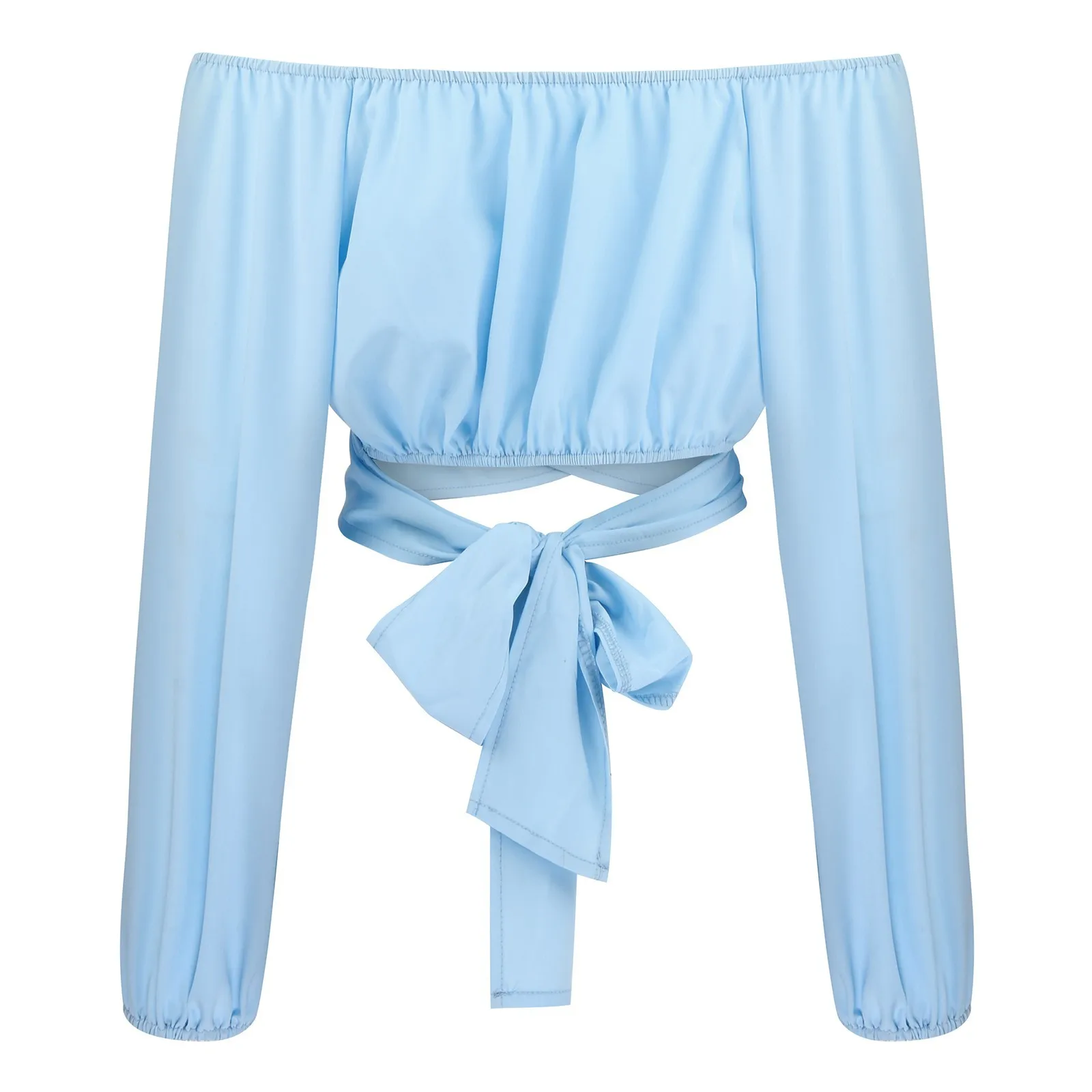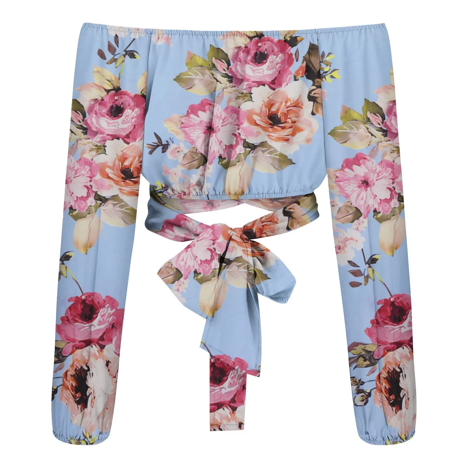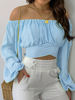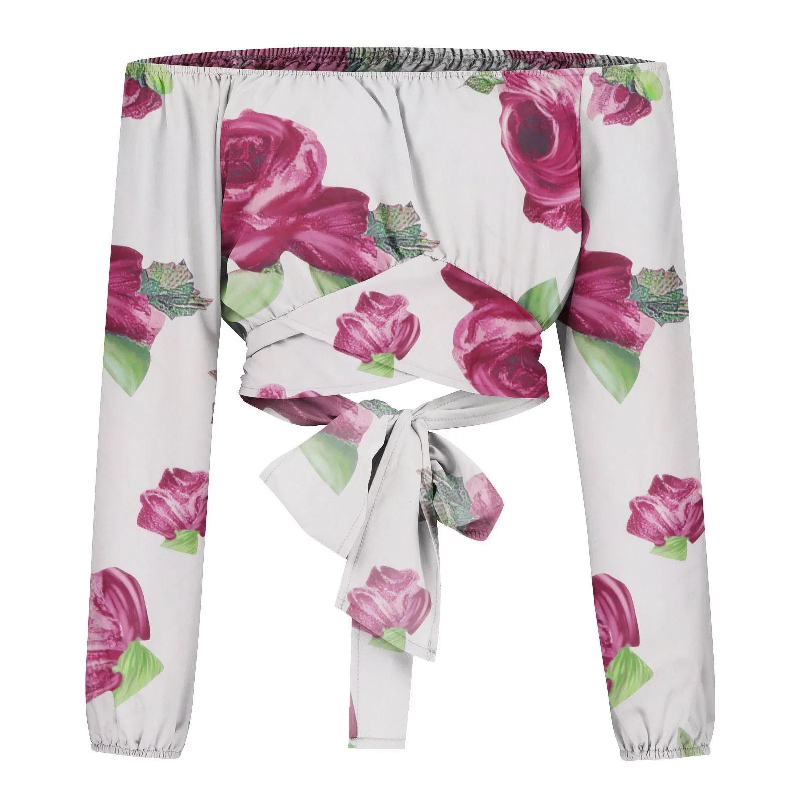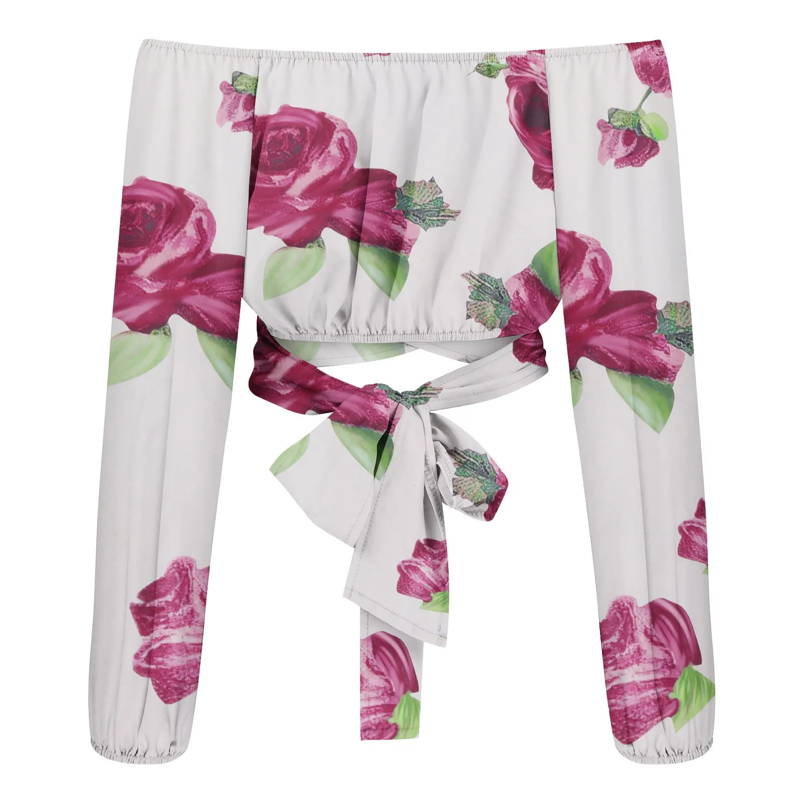 Women Sexy Off Shoulder Blouse Chic and Elegant Printing Lantern Long Sleeve Lace Up Bow Cropped Tops Casual Slim Shirts 2024