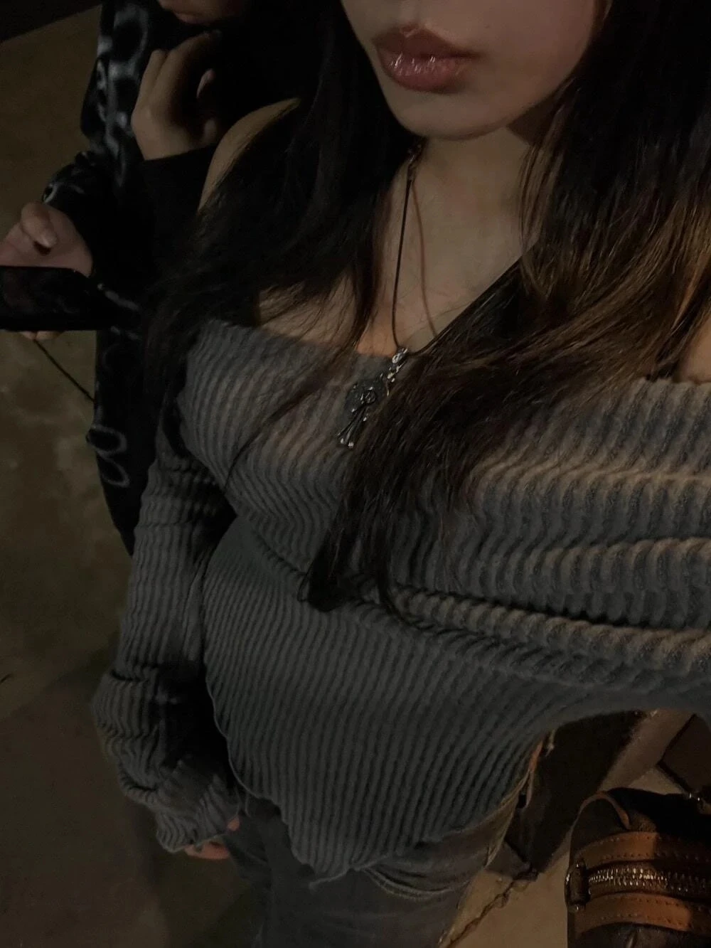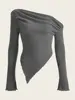 Women Solid Autumn Winter Grunge Asymmetrical Neck Rib-knit Tee Strapless Blouse Long Sleeve Casual Sweater Handkerchief Hem