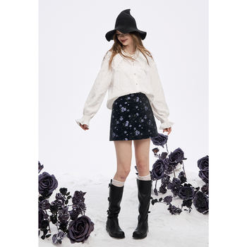 ELFSACK Y2K High Waist Gothic Floral A-Line Skirt Women, Black Skirt with Purple Print, Romantic Shoujo Cute Short Skirt