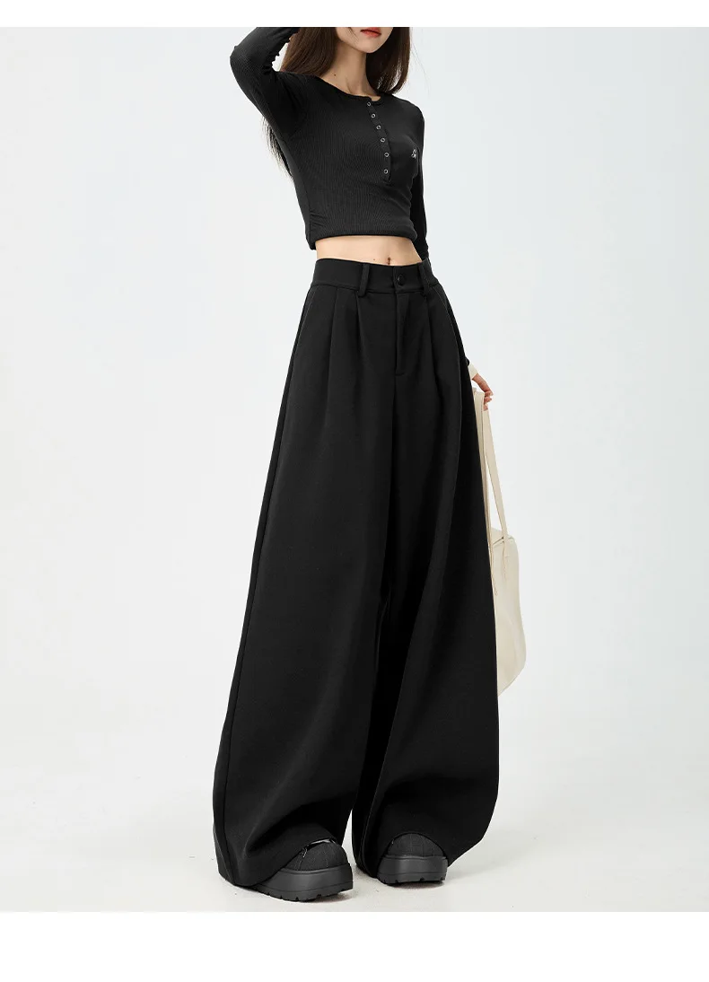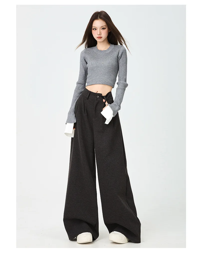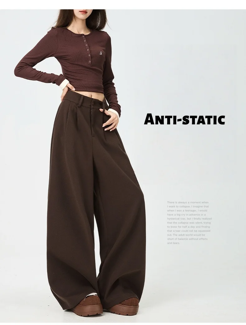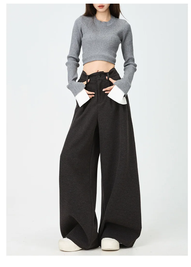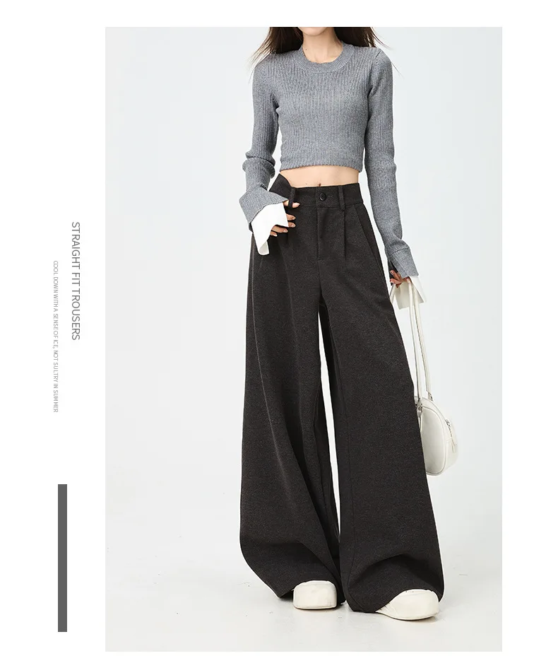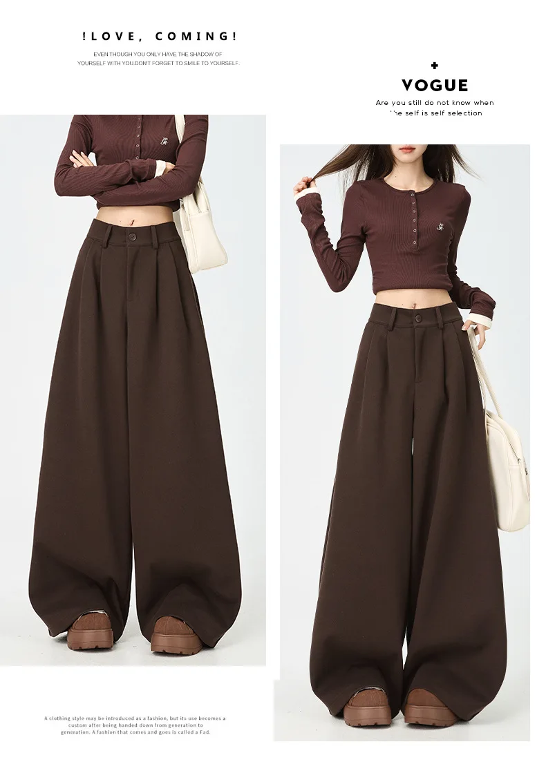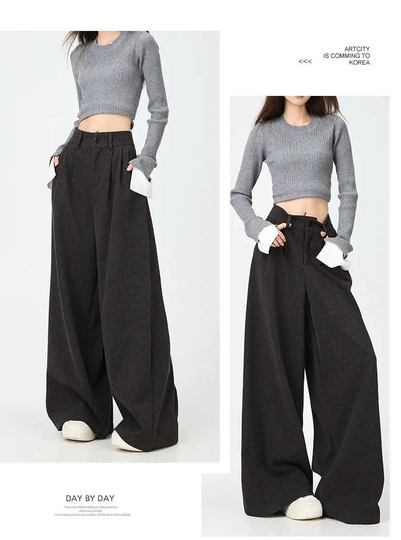 Woolen Trousers Women Autumn Winter Loose Fit High-Waisted Wide-Leg Winter Vintage Casual Trousers Warm Soft