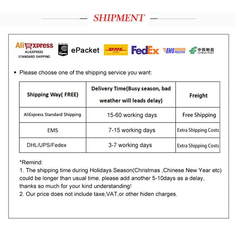Packages from our warehouse in China will be shipped by ePacket or EMS depending on the weight and size of the product. Packages shipped from our US warehouse are shipped through USPS.