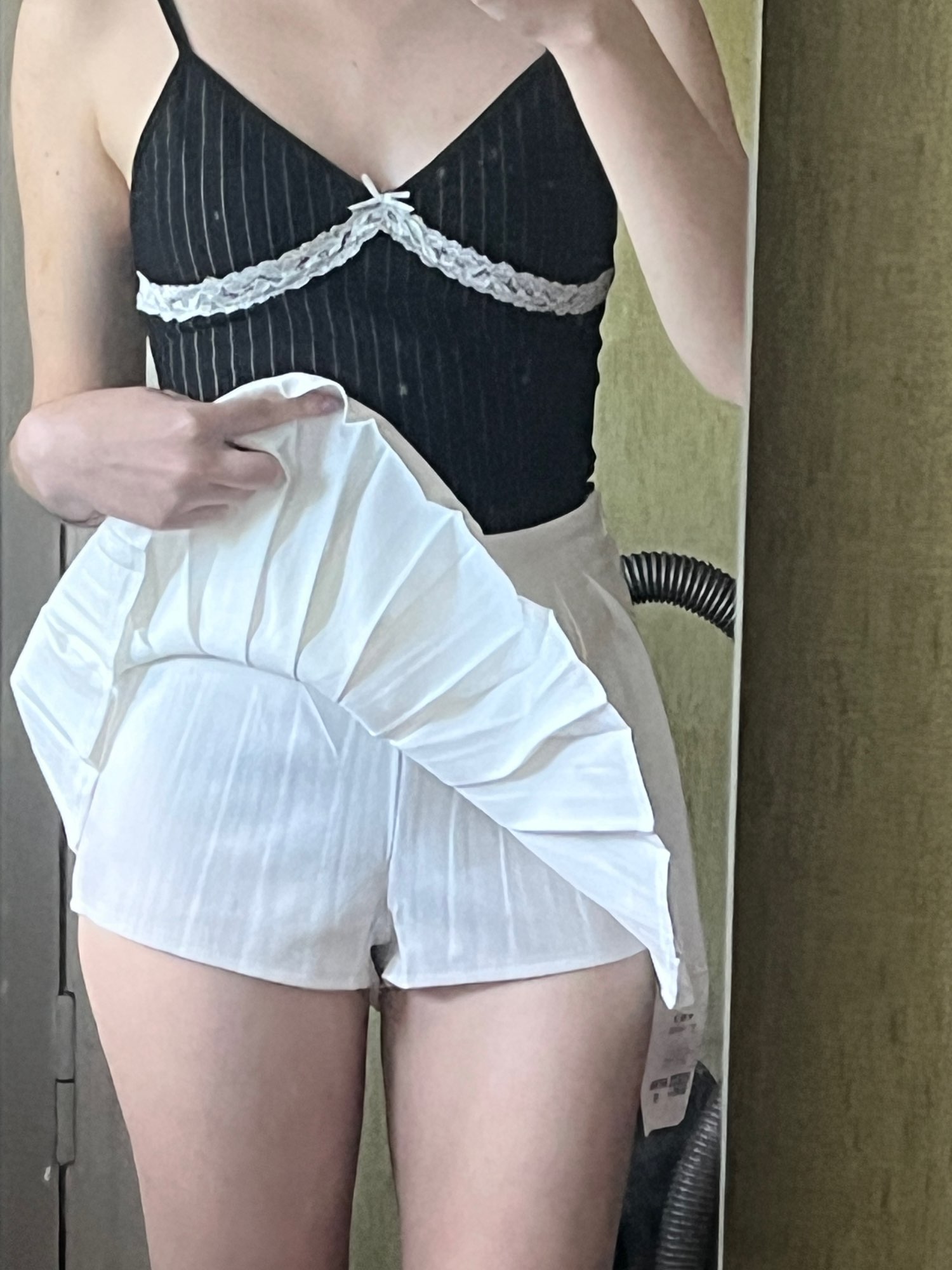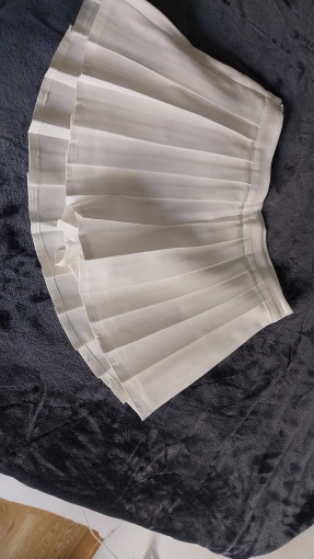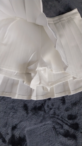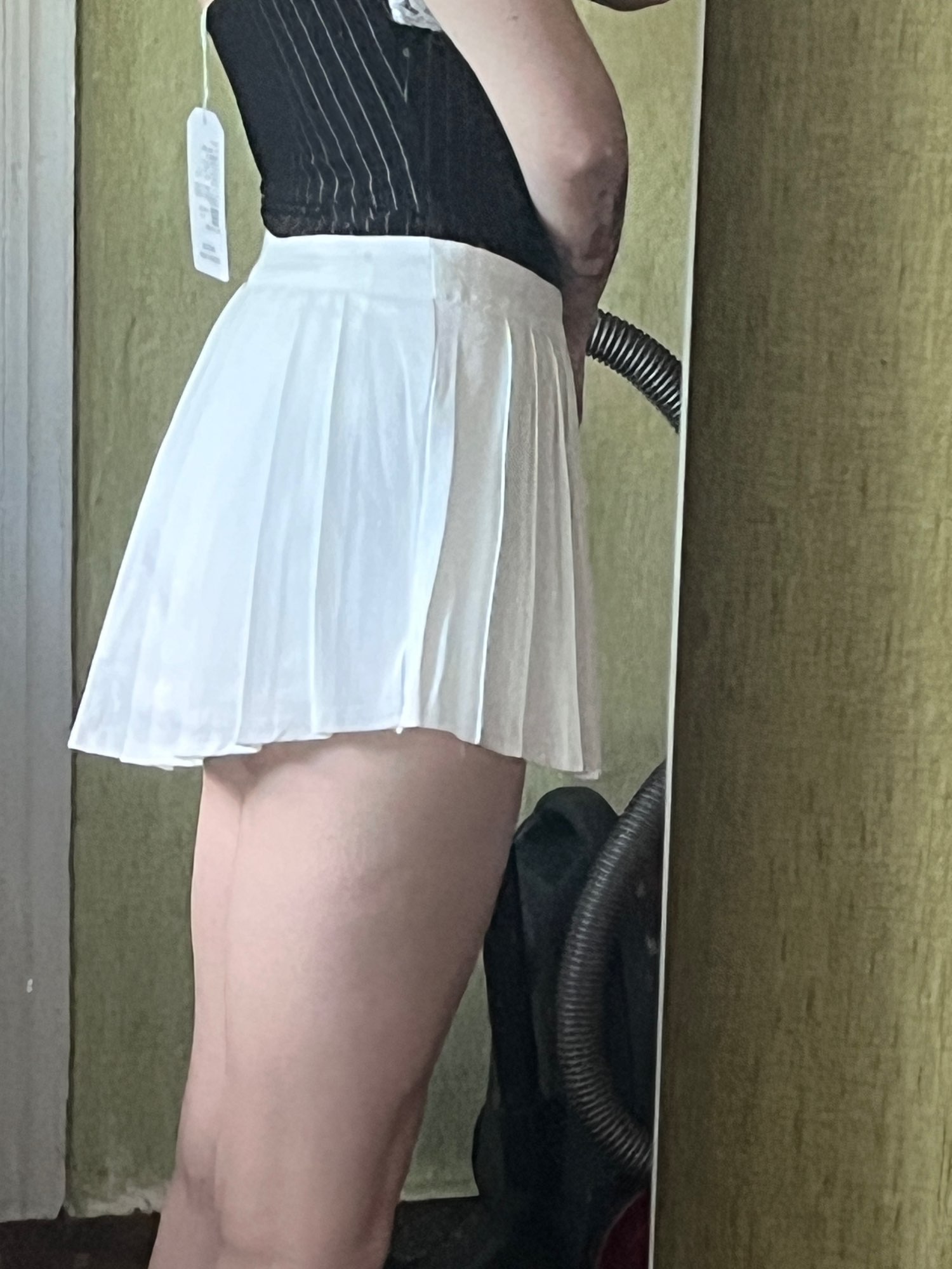 super cute and very pleated, its white enough (just sliiiightly off white) and the shorts r nice. :) fits fine, js measure. theres no stretch, just zipper.