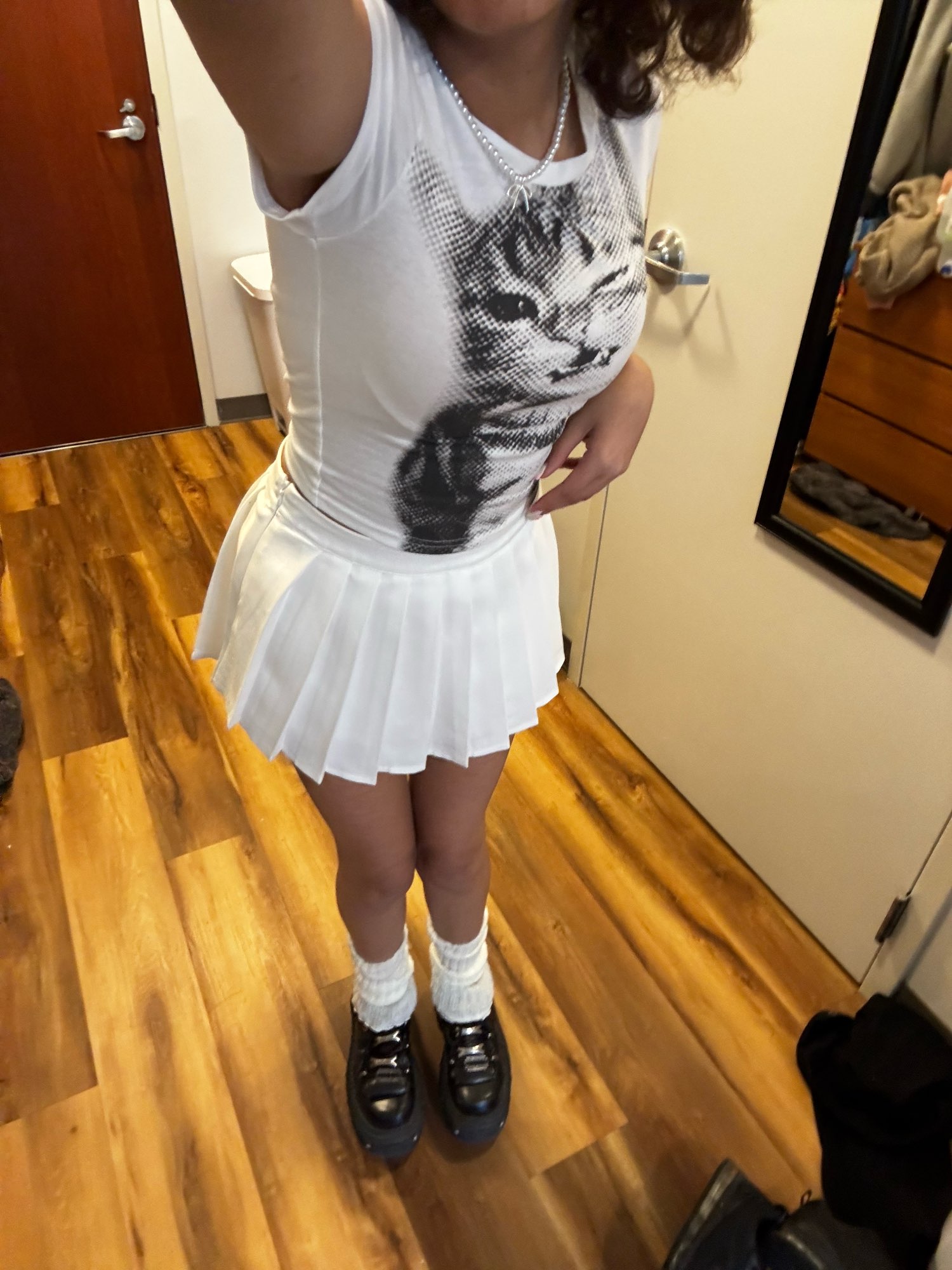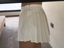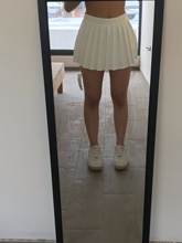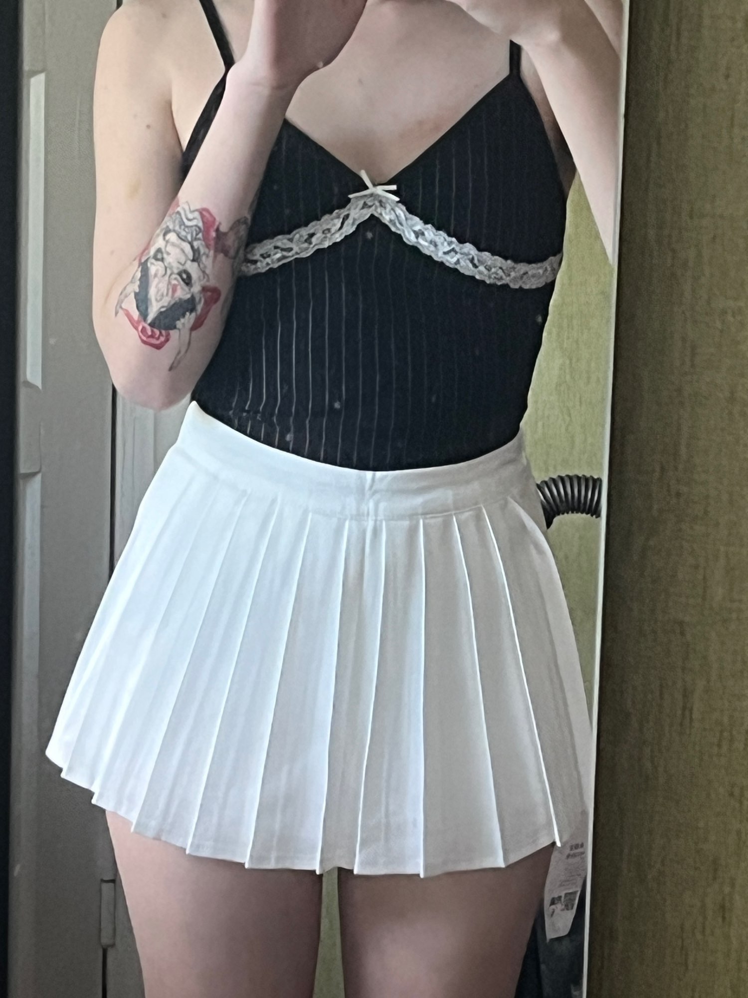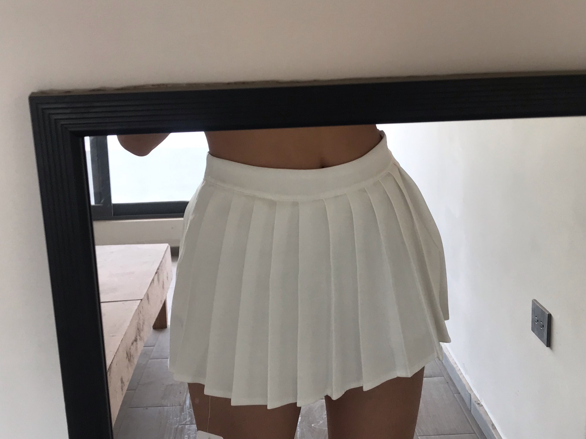 super cute and very pleated, its white enough (just sliiiightly off white) and the shorts r nice. :) fits fine, js measure. theres no stretch, just zipper.